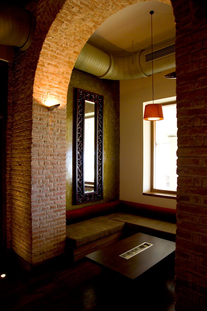 The space was divided into three areas- a lounge bar on entry, the fine dine restaurant and a basement wine cellar. The entire length of this space flanked by a colonnade of lofty arches was used to create intimate low seating alcoves with views of the Ocean.