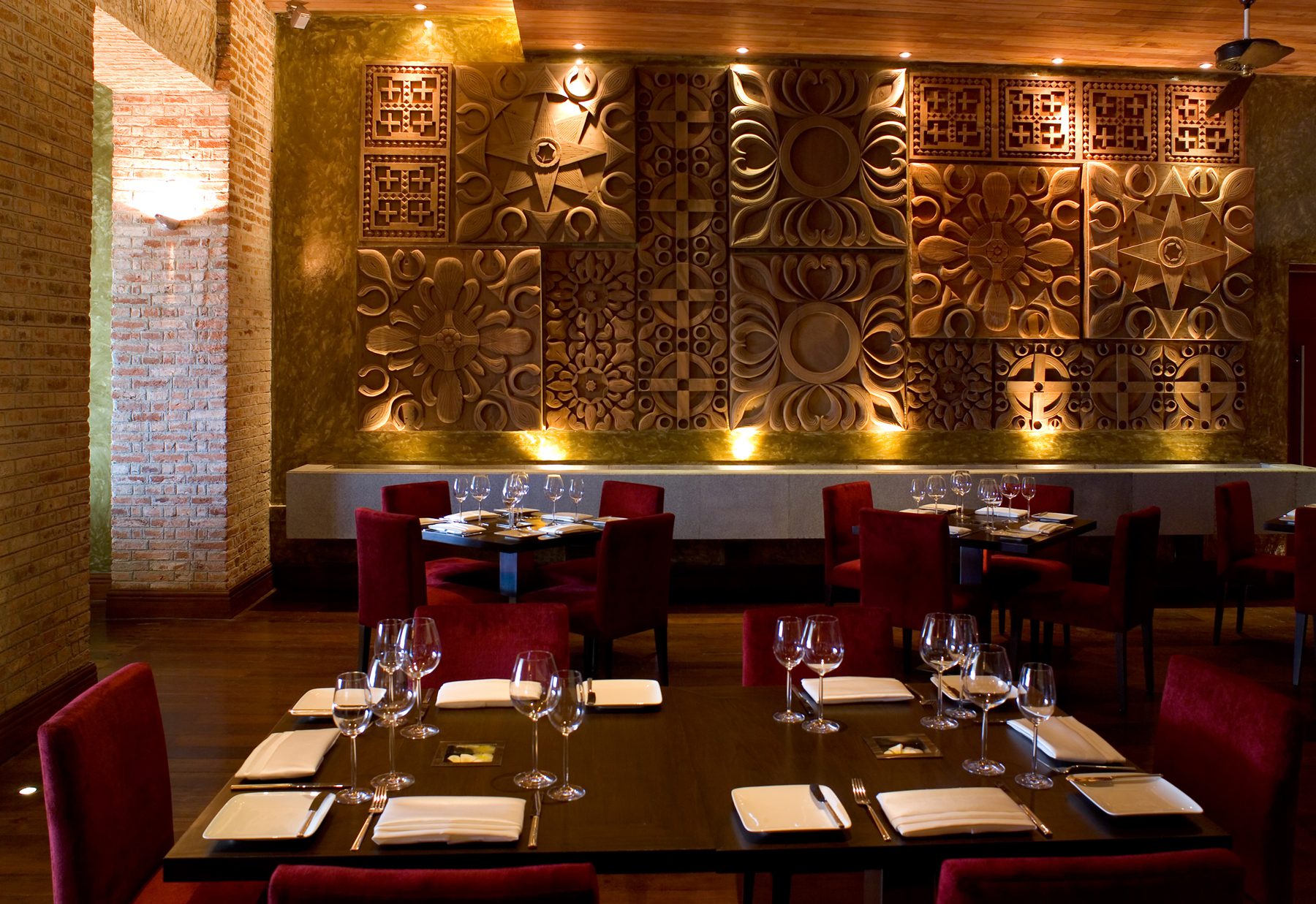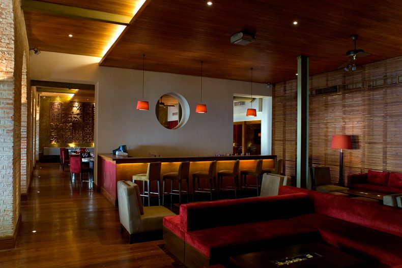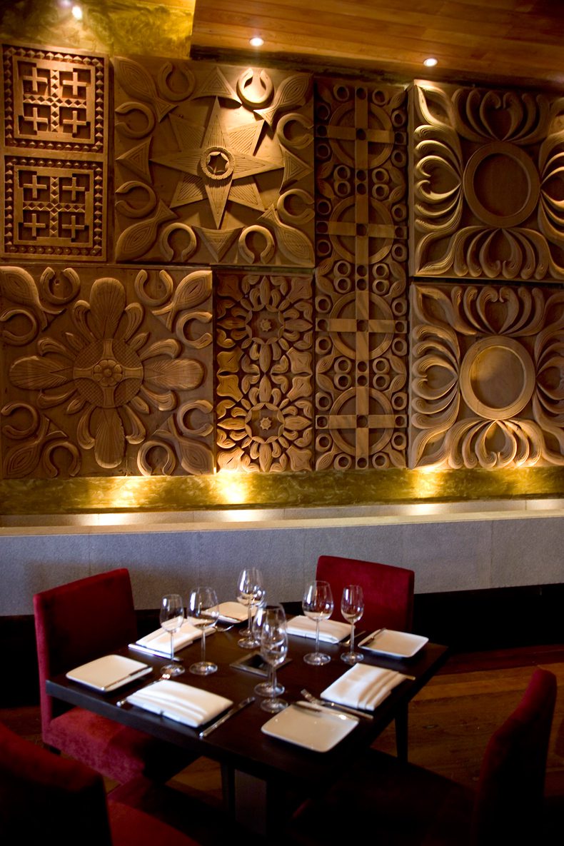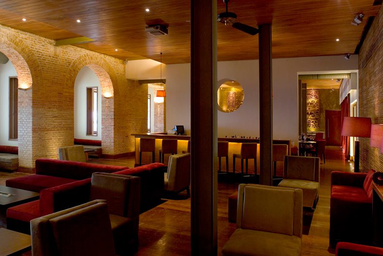 In the fine dine restaurant a large contemporary collage of floriated woodcarvings inspired from ancient Sinhalese temples was designed by us and then commissioned to local Sri Lankan craftsmen.