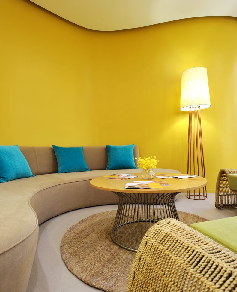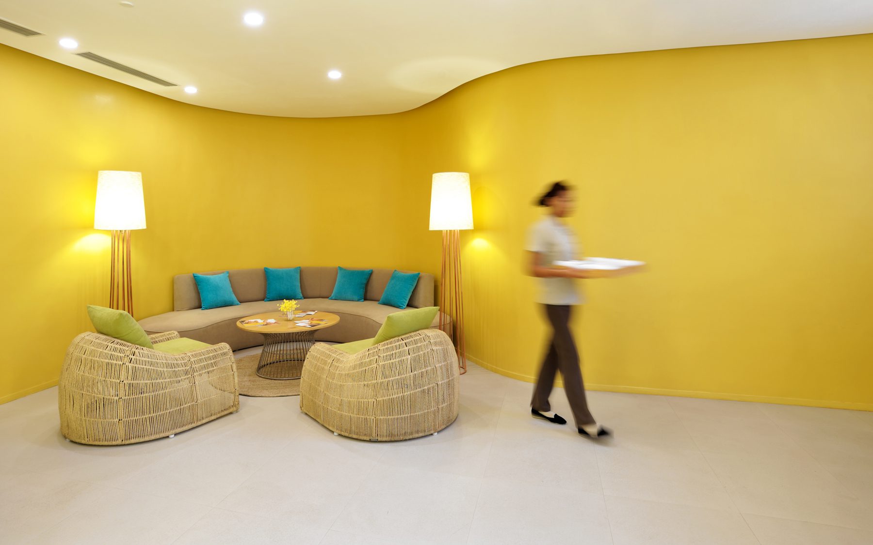 We curved the walls of the reception and edges of the treatment rooms, and used recycled timber for doors and partitions. The reception seating in fresh blues and greens are set against a curvilinear mustard wall, reflecting the colours of the Mediterranean, the sky, water, fields with yellow flowers. Single seater chairs were made in cane, the coffee table in bleached sustainable wood, and rug in natural sisal.