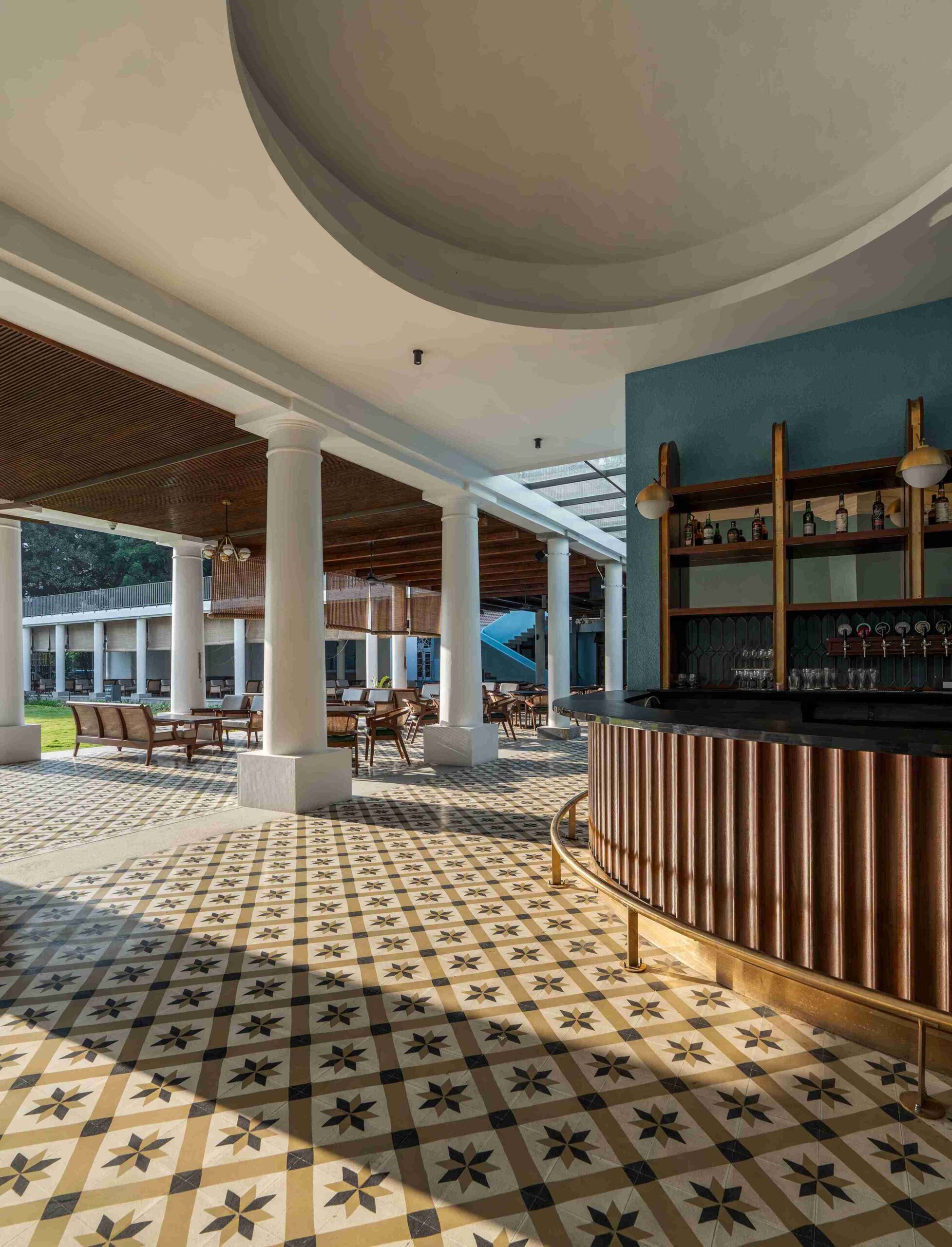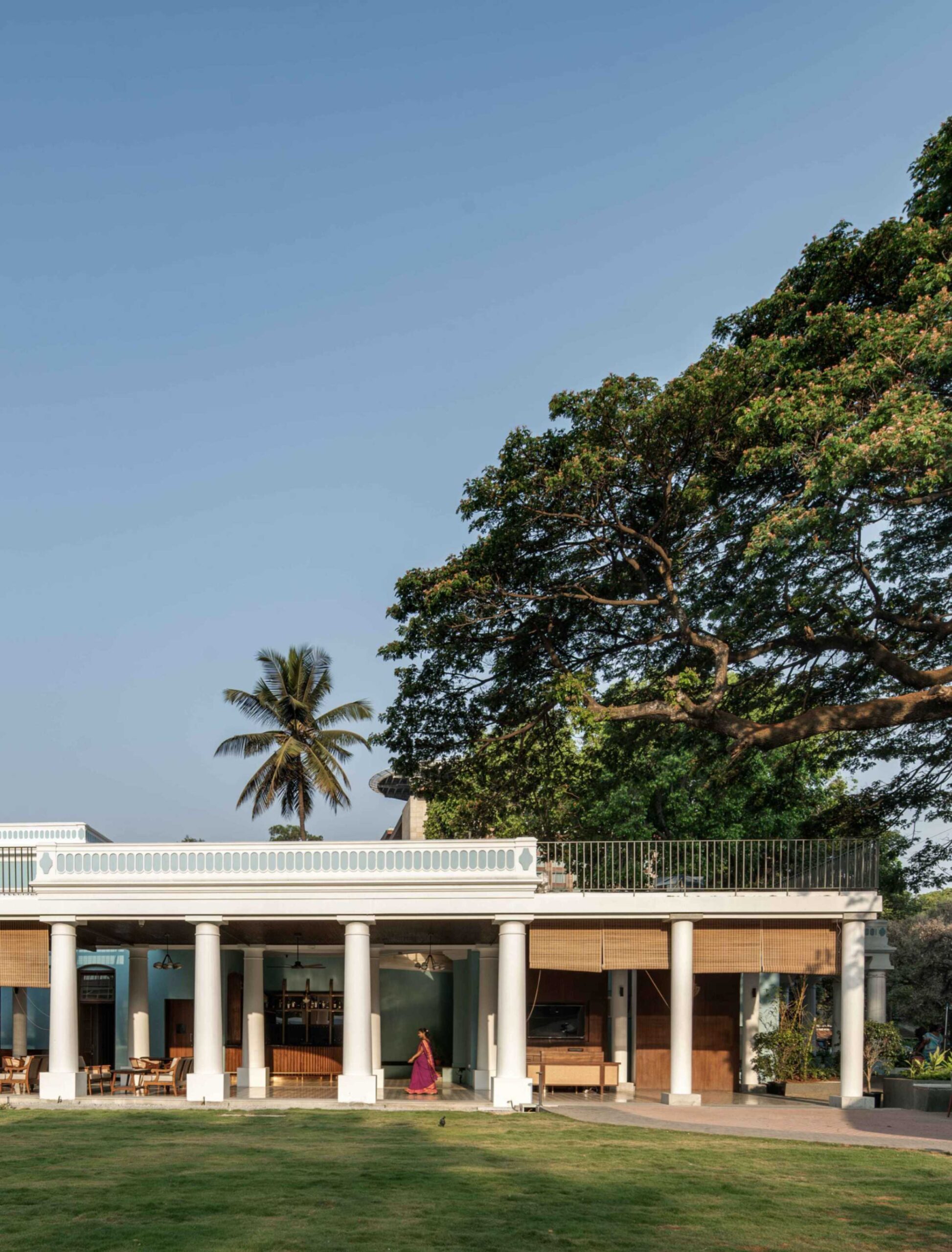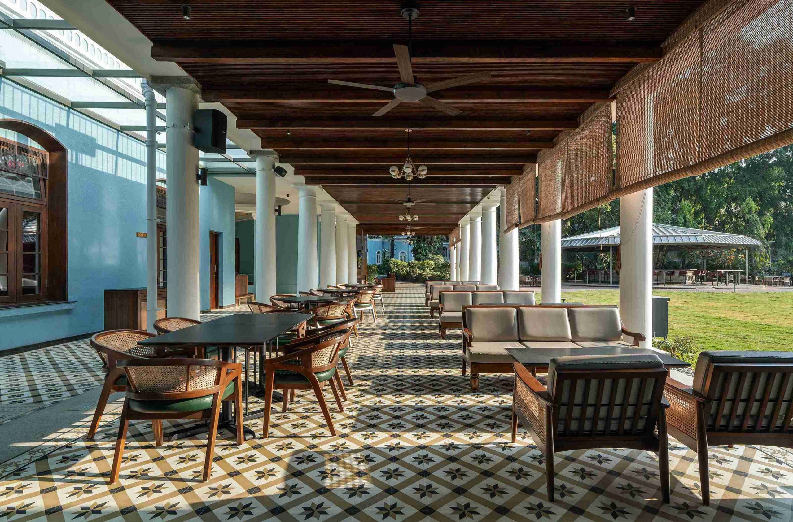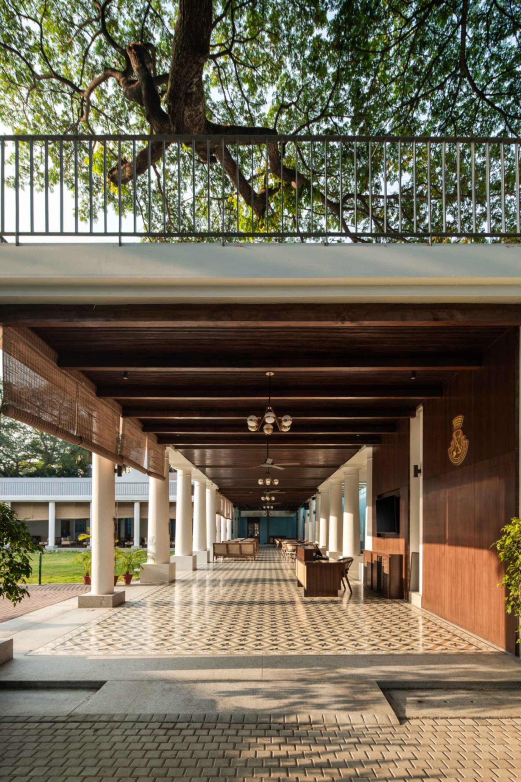 We studied the existing heritage buildings to ensure our additions would blend seamlessly with the environment. The main lawn had suffered from overuse and temporary event structures that damaged the grass. To address this, we designed a cohesive L – shaped covered collonade, providing ground-level and mezzanine seating overlooking the main lawn. We opted for a subtle expression that allows the 100-year old buildings to remain the focal point. We were careful to separate our additions from the Heritage buildings with an inconspicuous skylight , to bring in natural light while refraining form damaging the old buildings in any way. We used heritage tiles, a timber-clad slatted roof, and local Sadharhalli stone for the columns and their capitals.