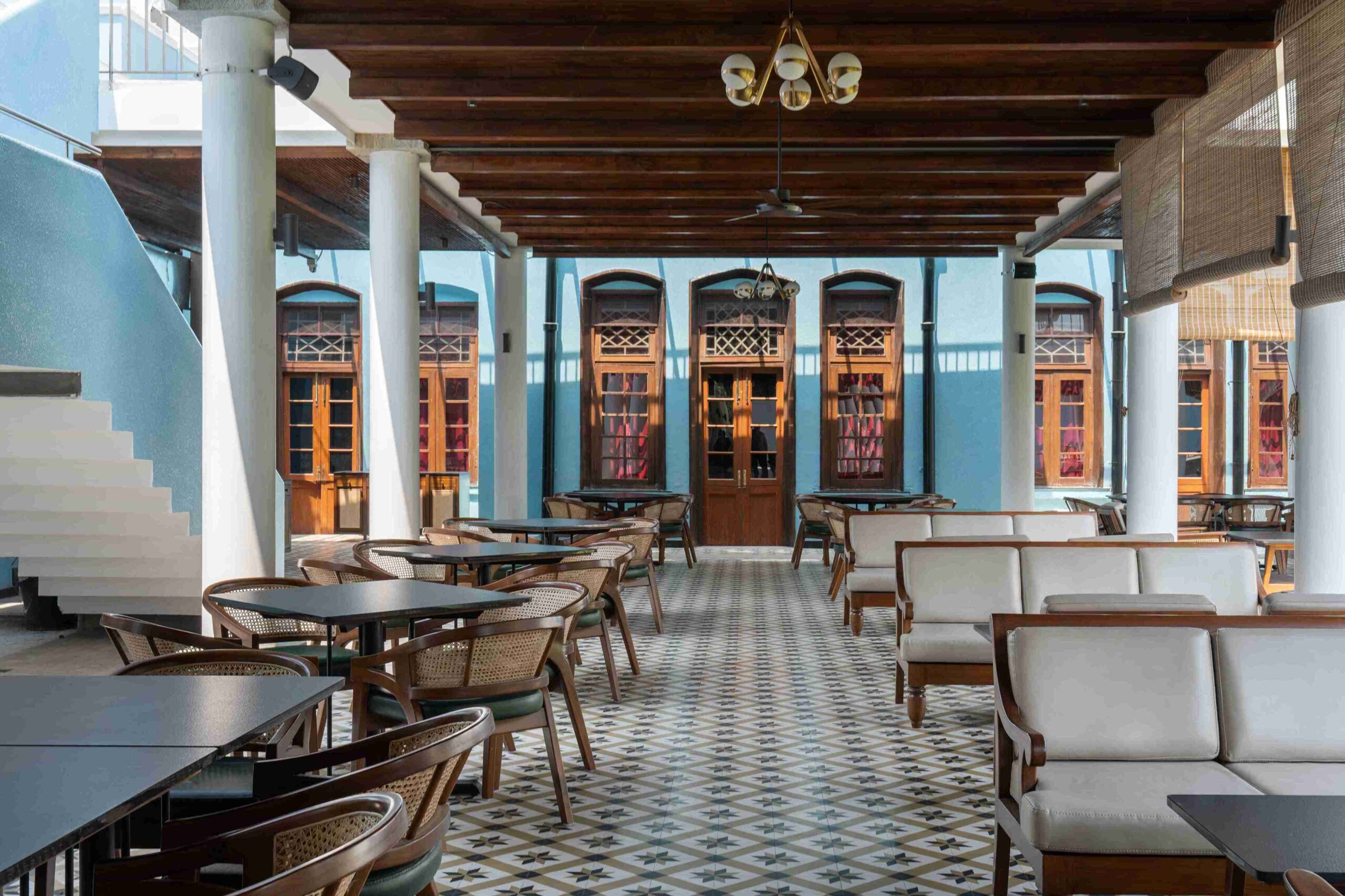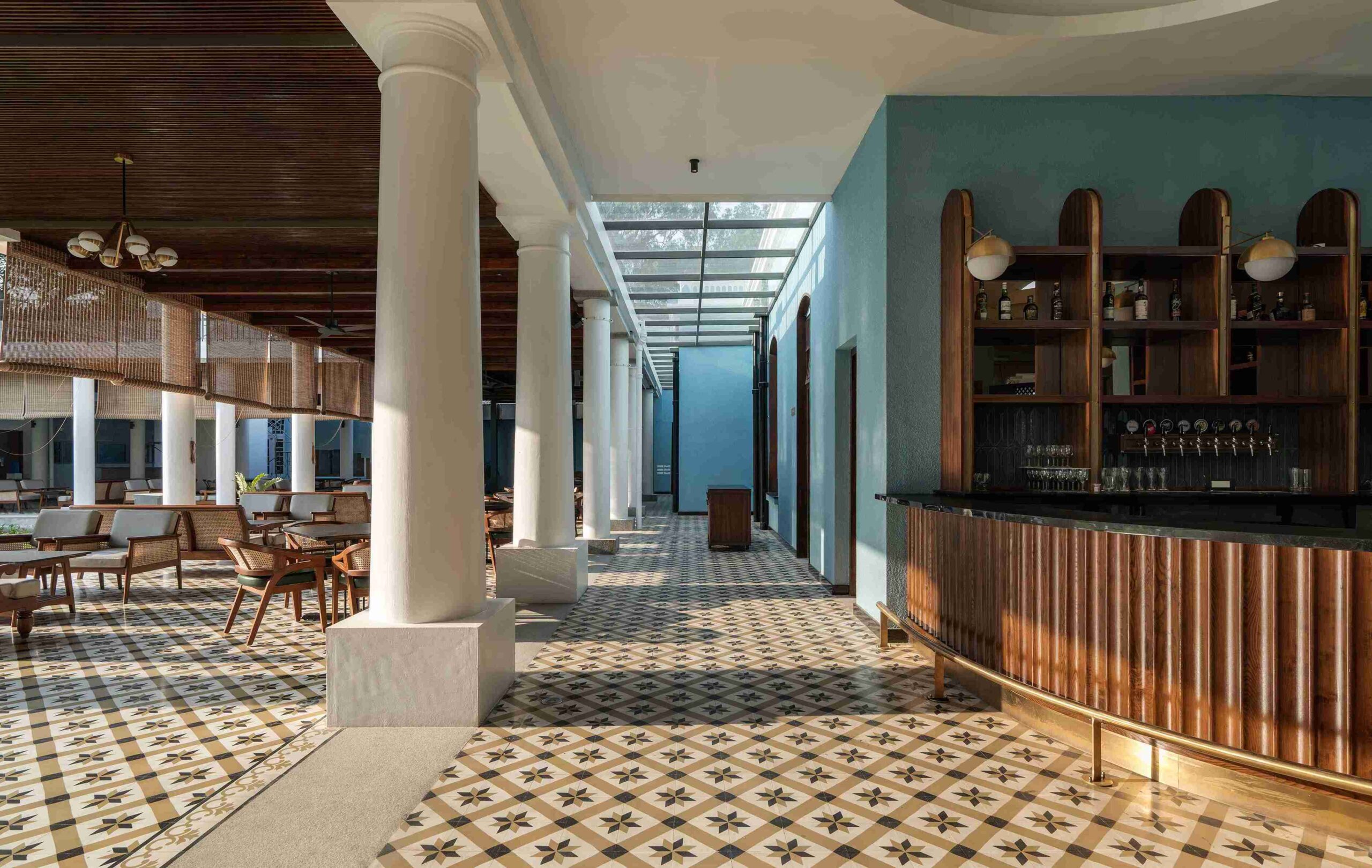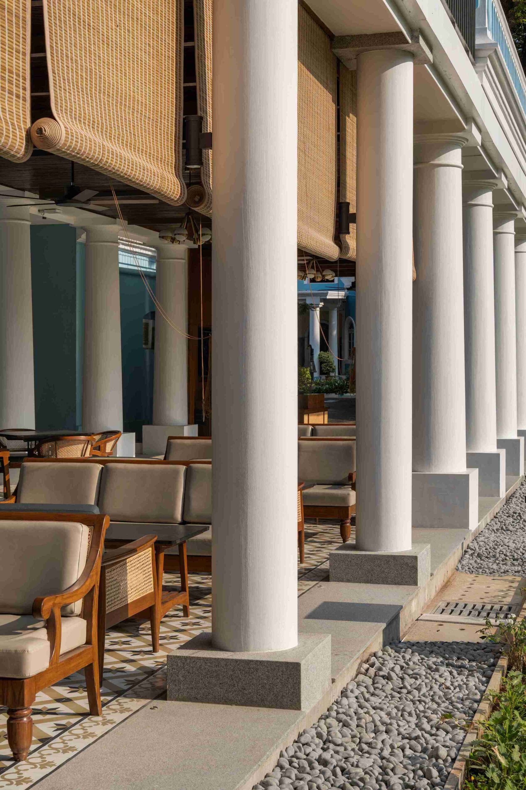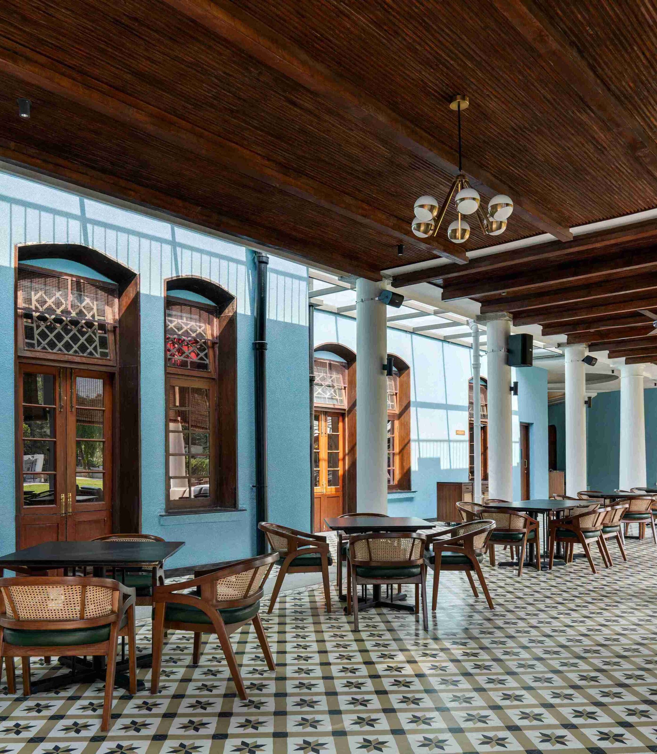 We studied the existing heritage buildings to ensure our additions would blend seamlessly with the environment. The main lawn had suffered from overuse and temporary event structures that damaged the grass. To address this, we designed a cohesive L – shaped covered collonade, providing ground-level and mezzanine seating overlooking the main lawn. We opted for a subtle expression that allows the 100-year old buildings to remain the focal point. We were careful to separate our additions from the Heritage buildings with an inconspicuous skylight , to bring in natural light while refraining form damaging the old buildings in any way. We used heritage tiles, a timber-clad slatted roof, and local Sadharhalli stone for the columns and their capitals.