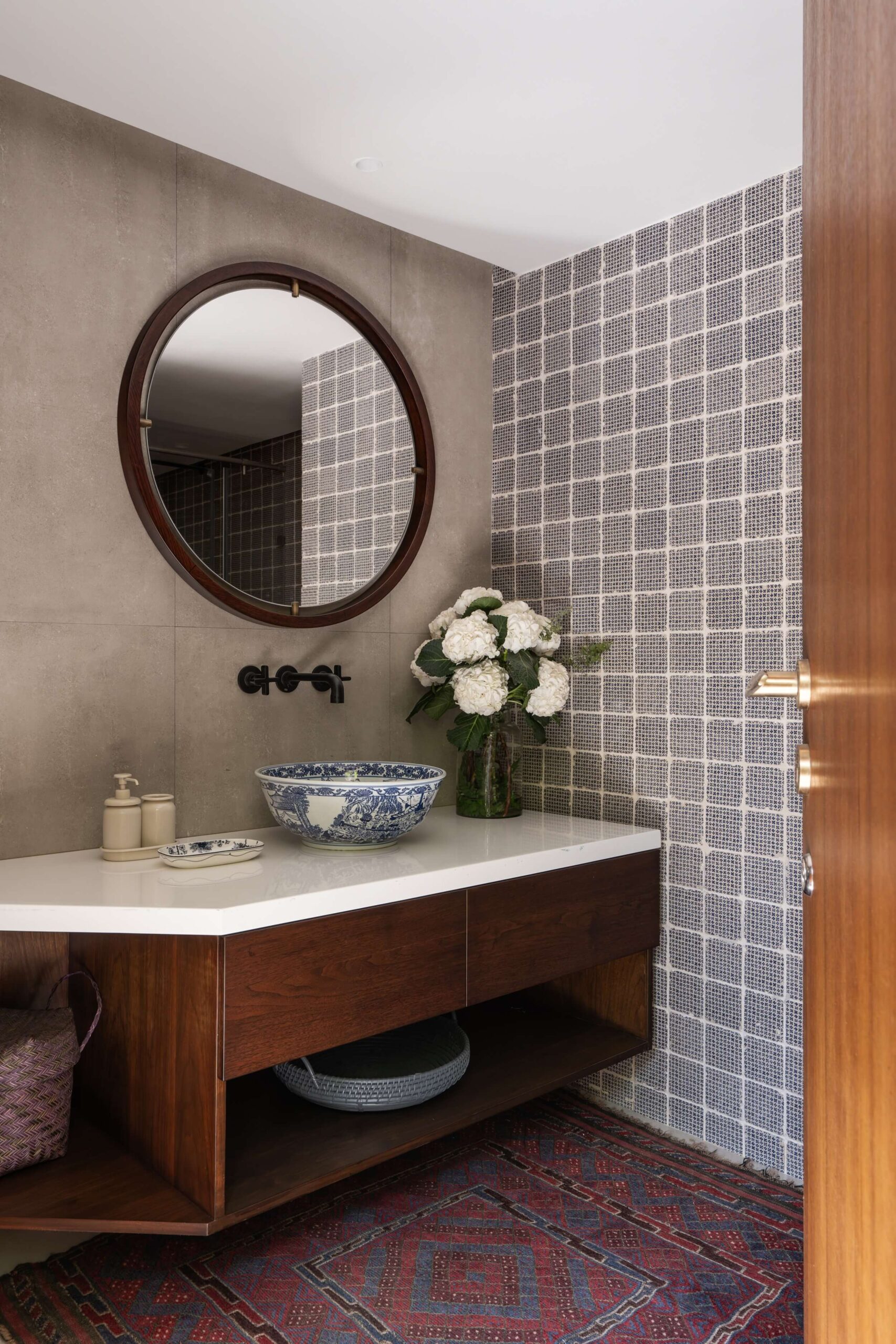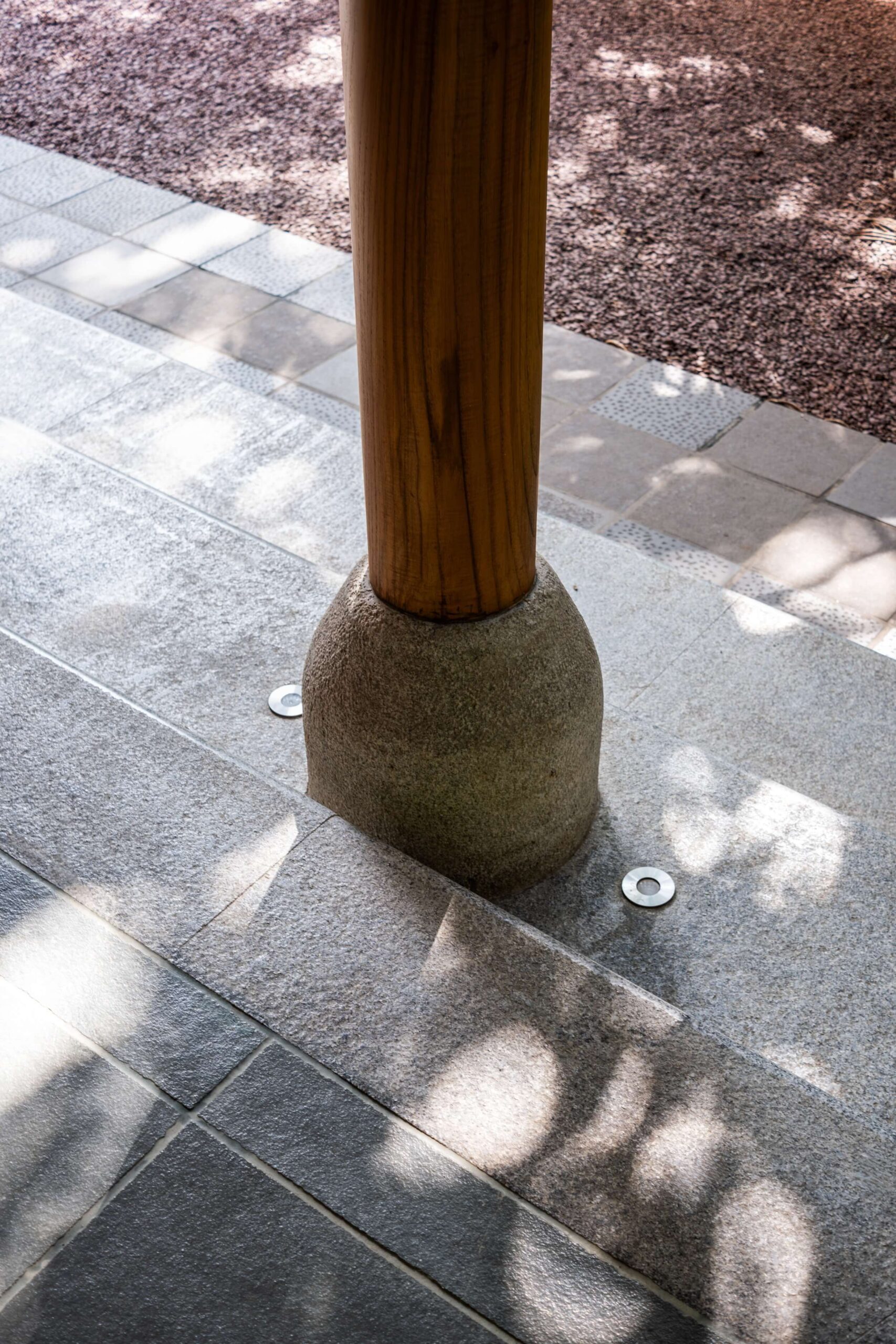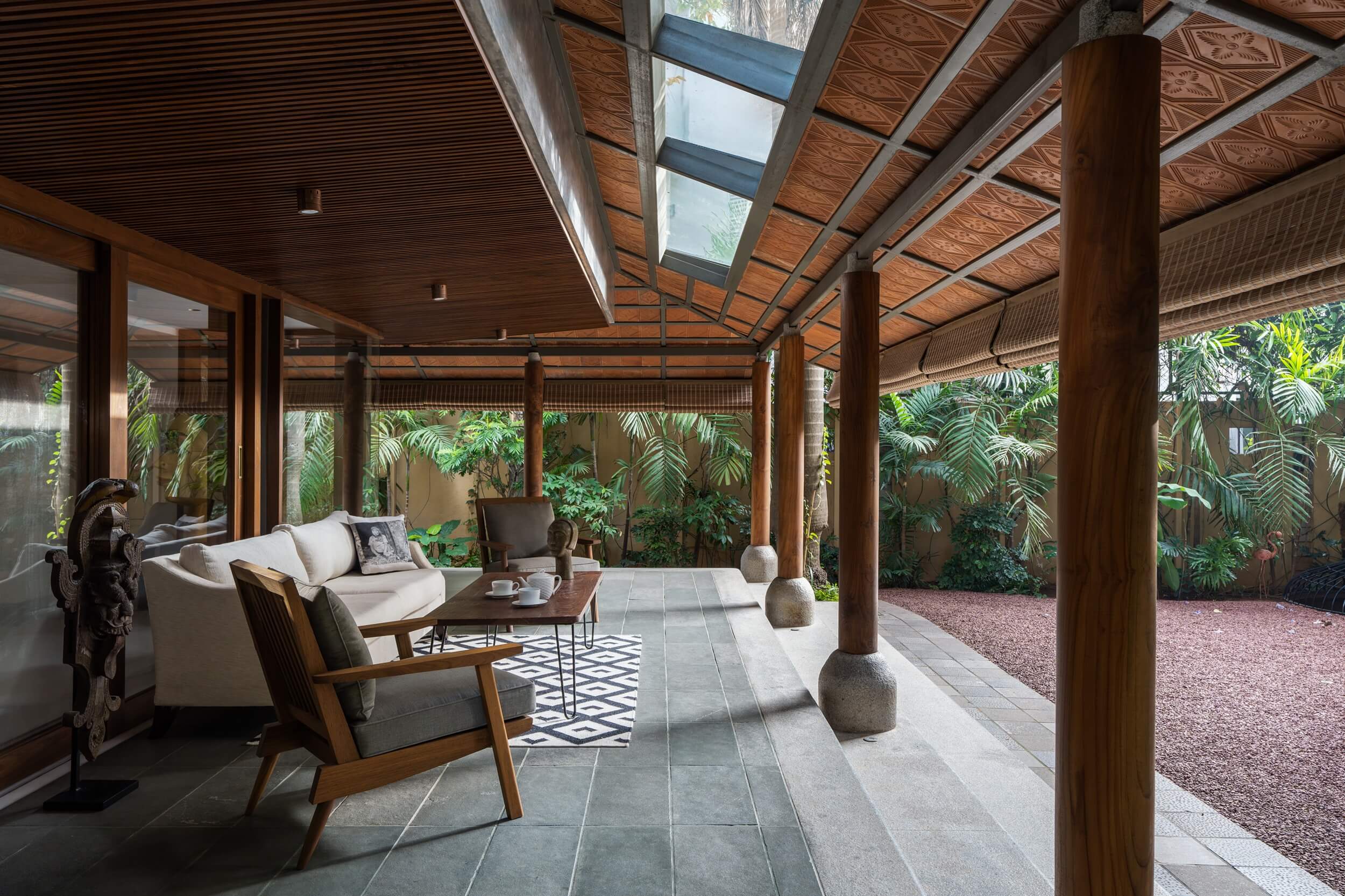 One of the key features of this renovation is a generous L-shaped verandah attached to the living room and overlooking the calm of the south garden. The sloped verandah roofs are built with locally sourced Mangalore clay tiles, with an underside layer of patterned Kerala tiles. The bases of the columns are crafted from hand-dressed local Sadharhalli stone, while their circular shafts are made of teakwood. The verandah floor is laid with slabs of river-finished Kota stone, and the steps to the garden are in Sadharhalli stone. A linear skylight in the verandah roof brings in ample natural light.