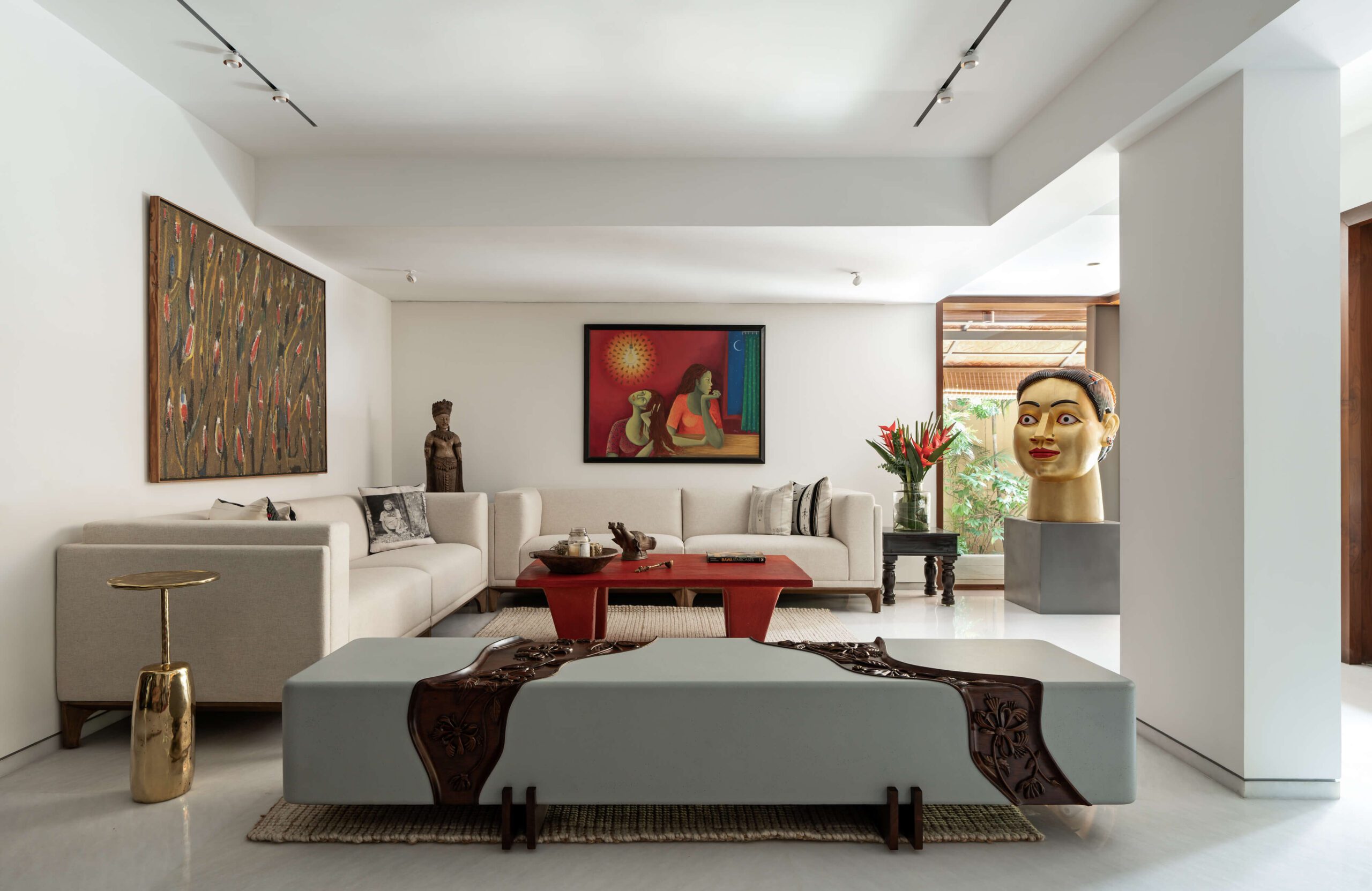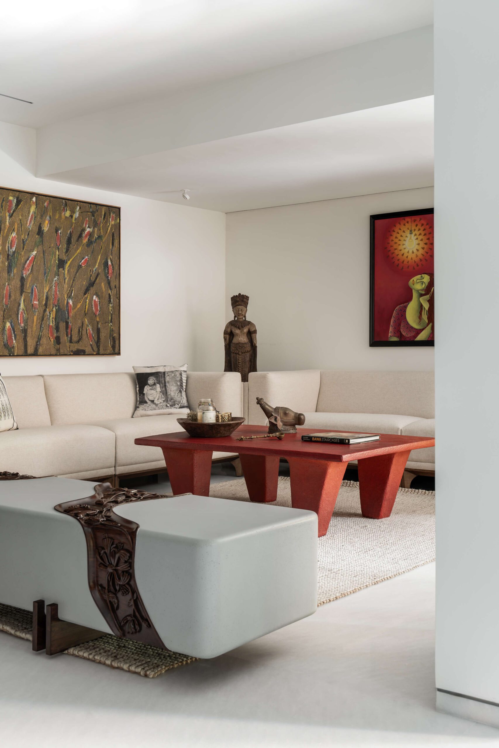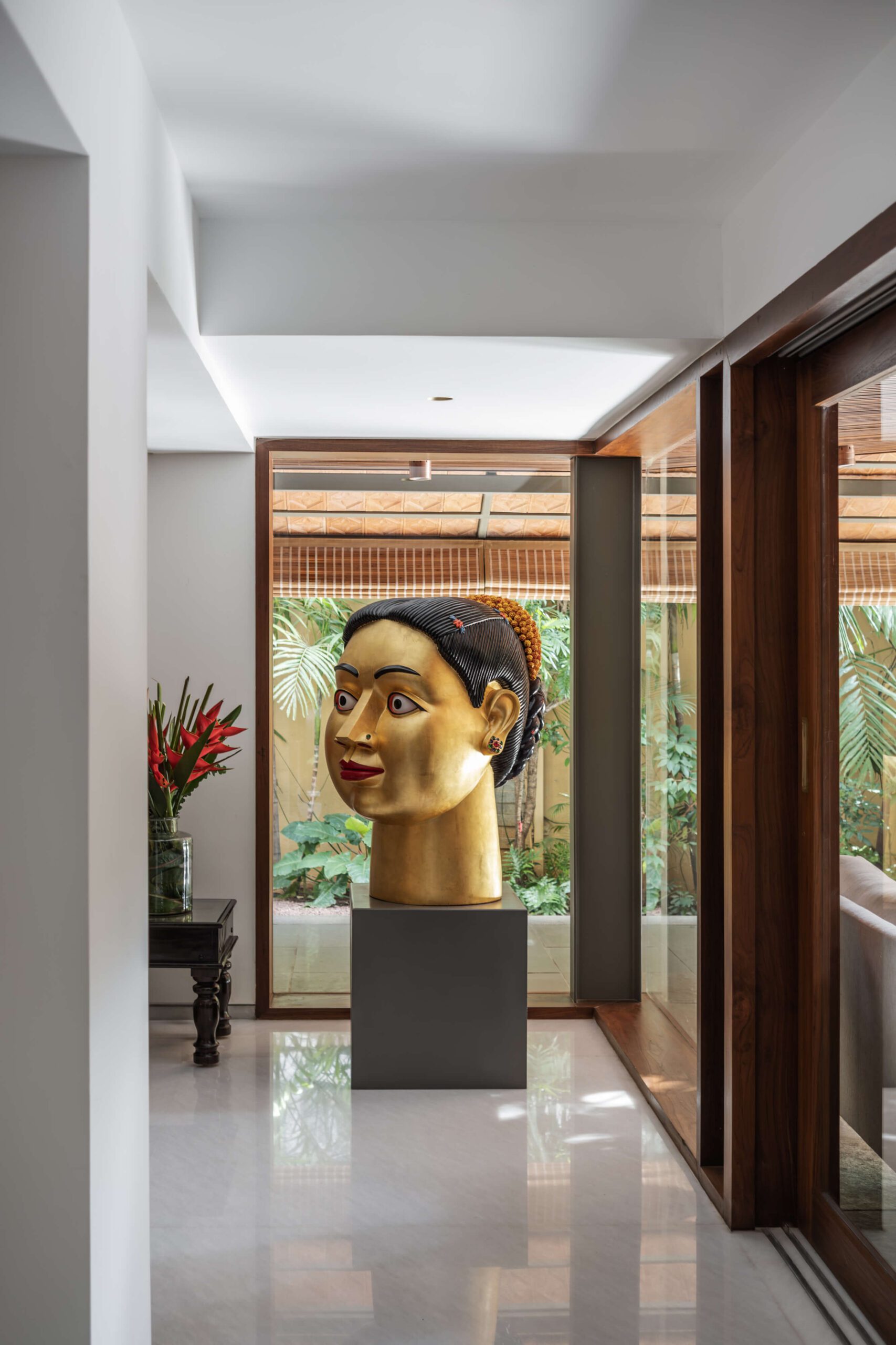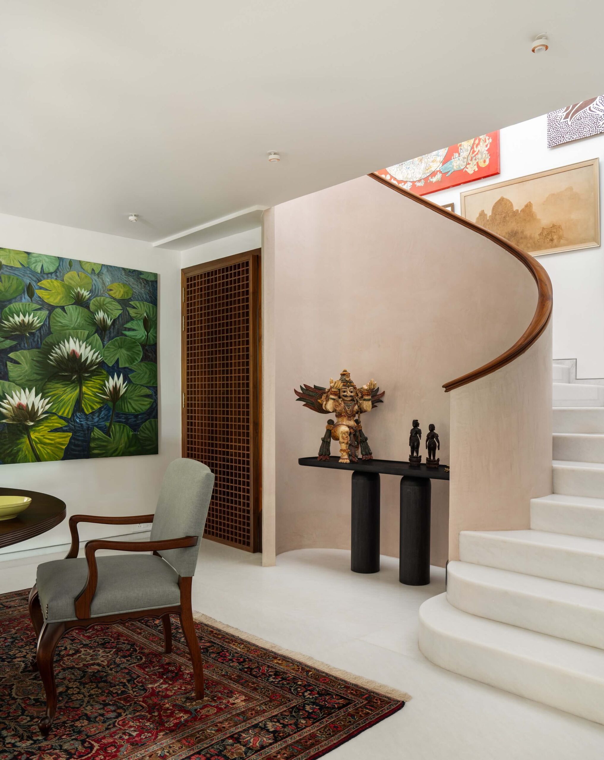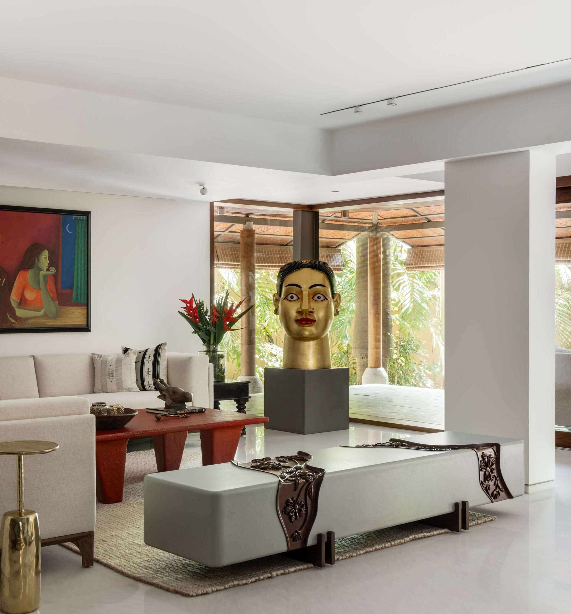 Inside, we intentionally used pure white marble to reflect as much light as possible, given the low ceilings. Art pieces serve as focal points in the living spaces. Highlights include an iconic 4-foot-tall gold Ravindra Reddy head, strategically placed in a corner with its profile diagonally positioned to gaze into the living room. Other notable pieces include the ‘Red Naga Pulp Table,’ made of papier-mâché by Ravi Vazirani, and ‘The Conversation Bench,’ made of concrete and hand-carved wood by Tania and Sandeep Khosla in collaboration with the Mangrove Collective. These are juxtaposed with antique statuary and Indian art from the client’s collection.