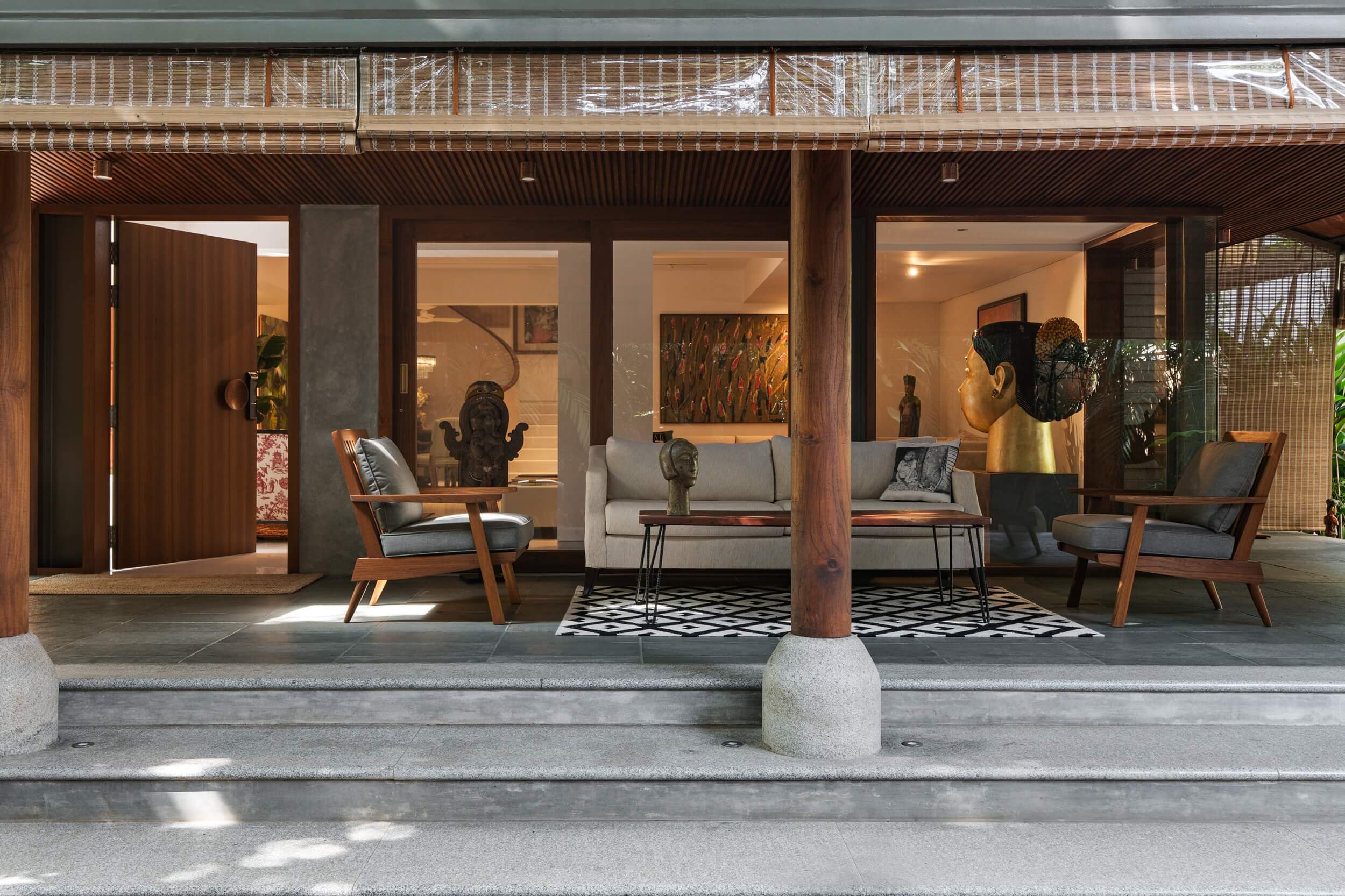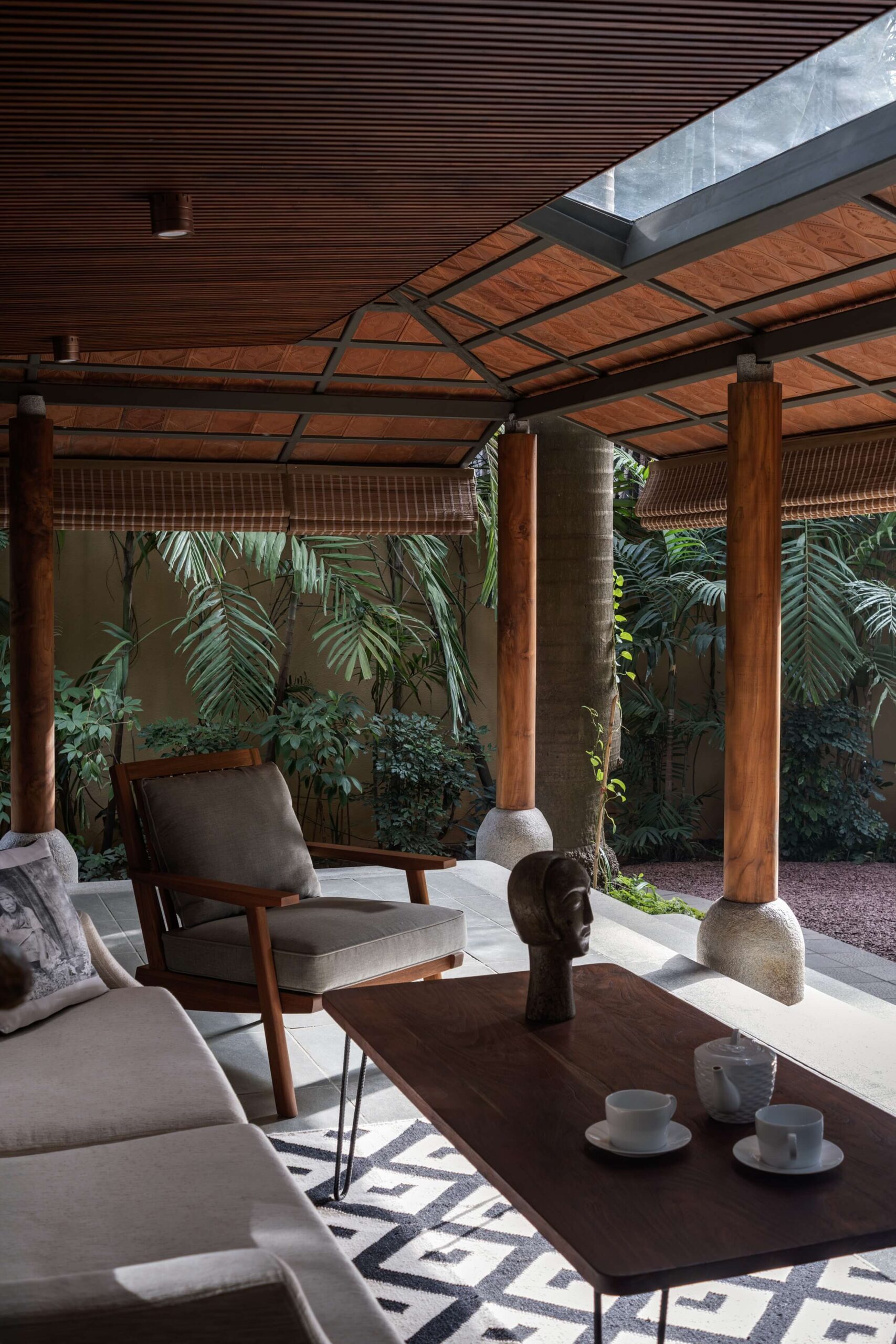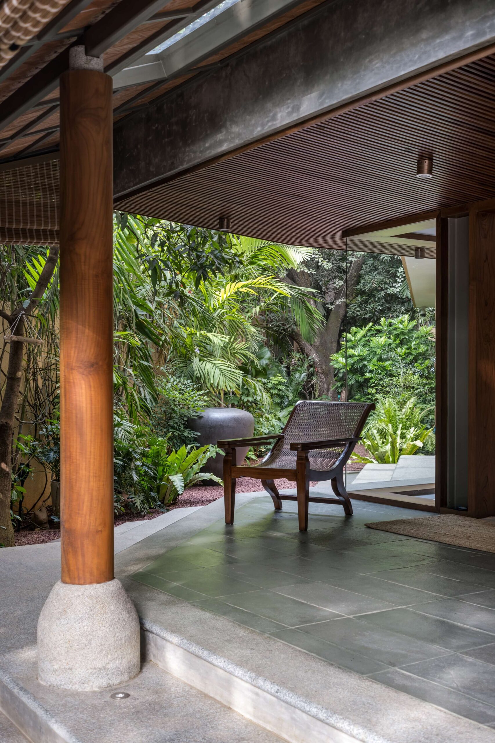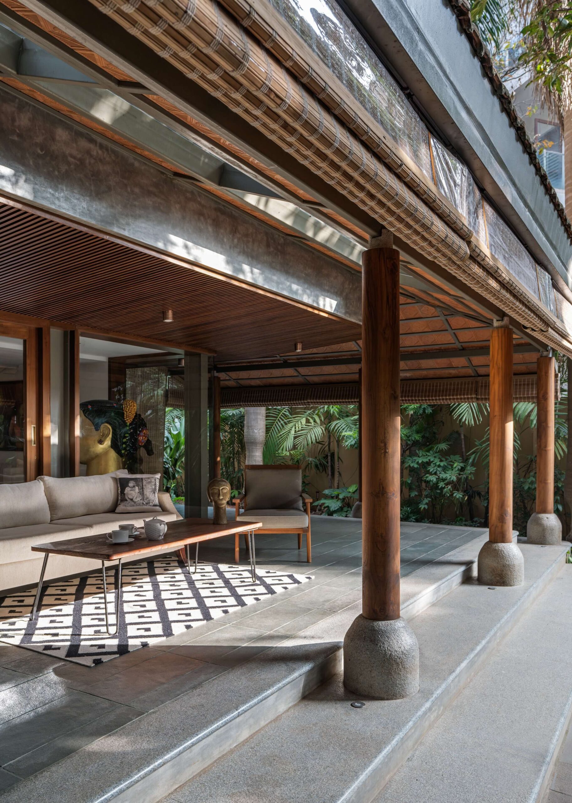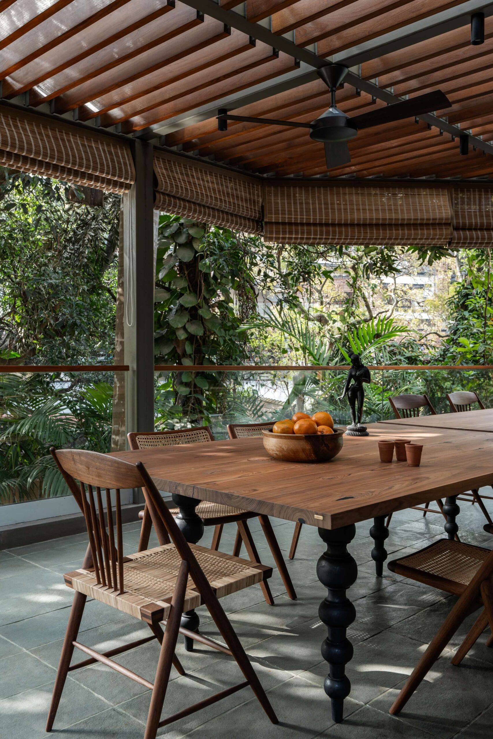 The first-floor sit-out features a wooden pergola topped with glass and bamboo blinds to protect from rain. This space interacts beautifully with the canopy of nearby trees. A large dining table sourced from Beruru sits here, surrounded by cane and wood chairs from Phantom Hands.