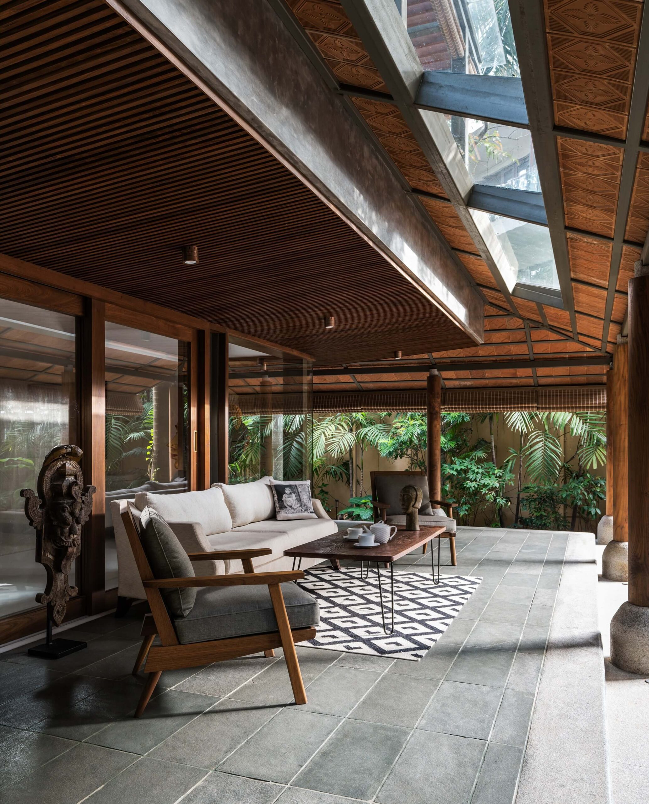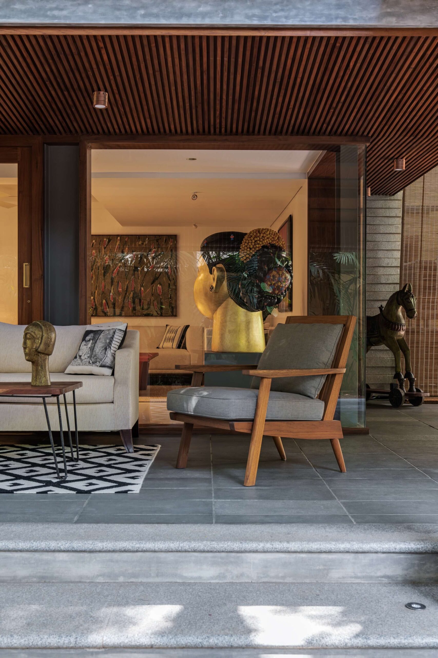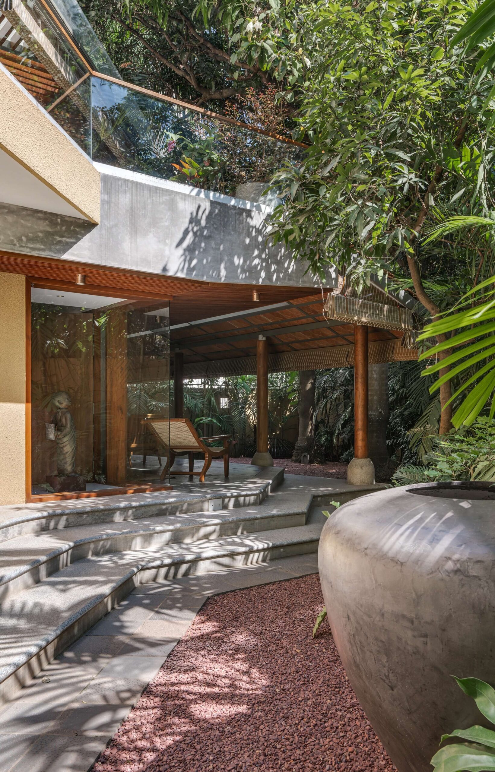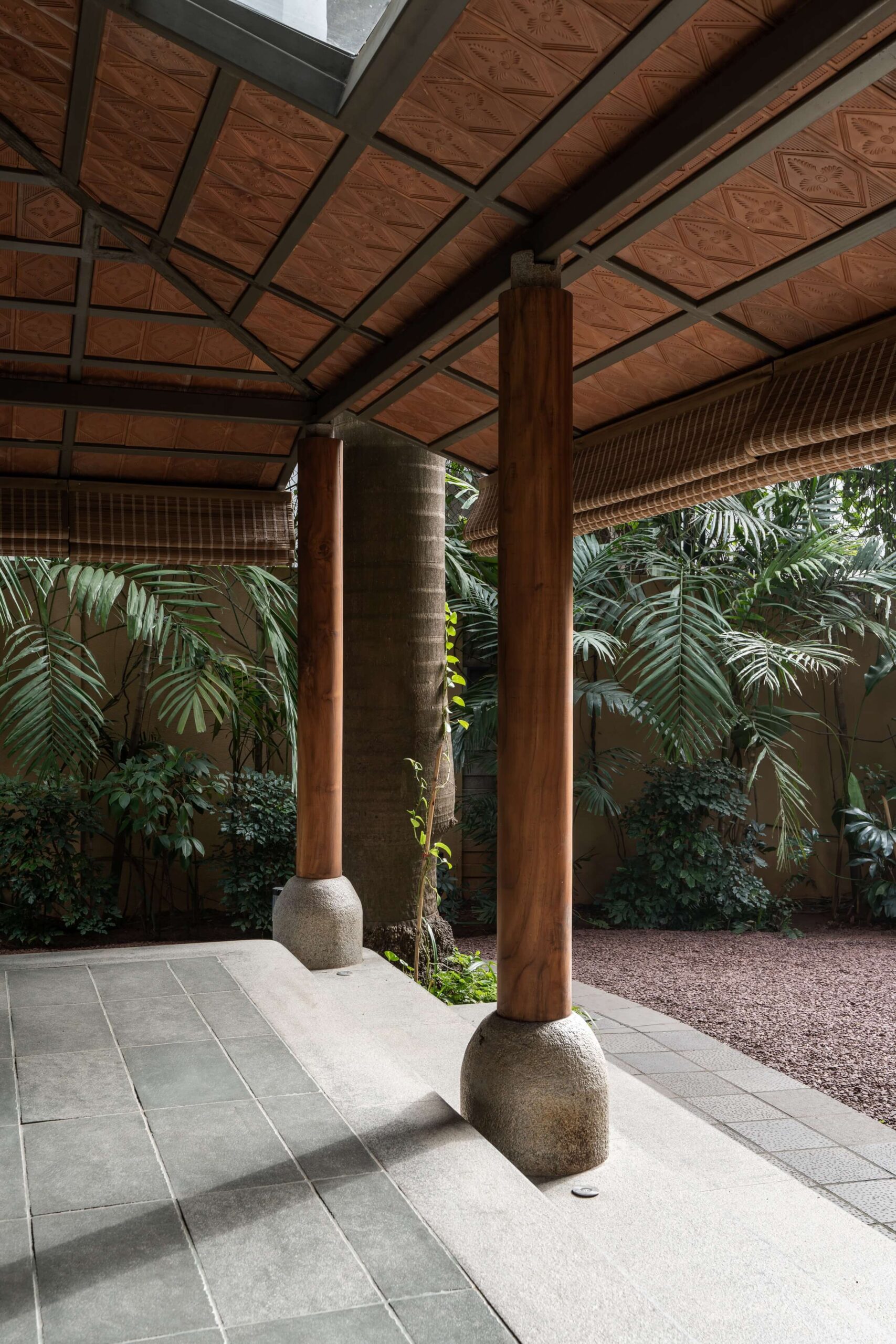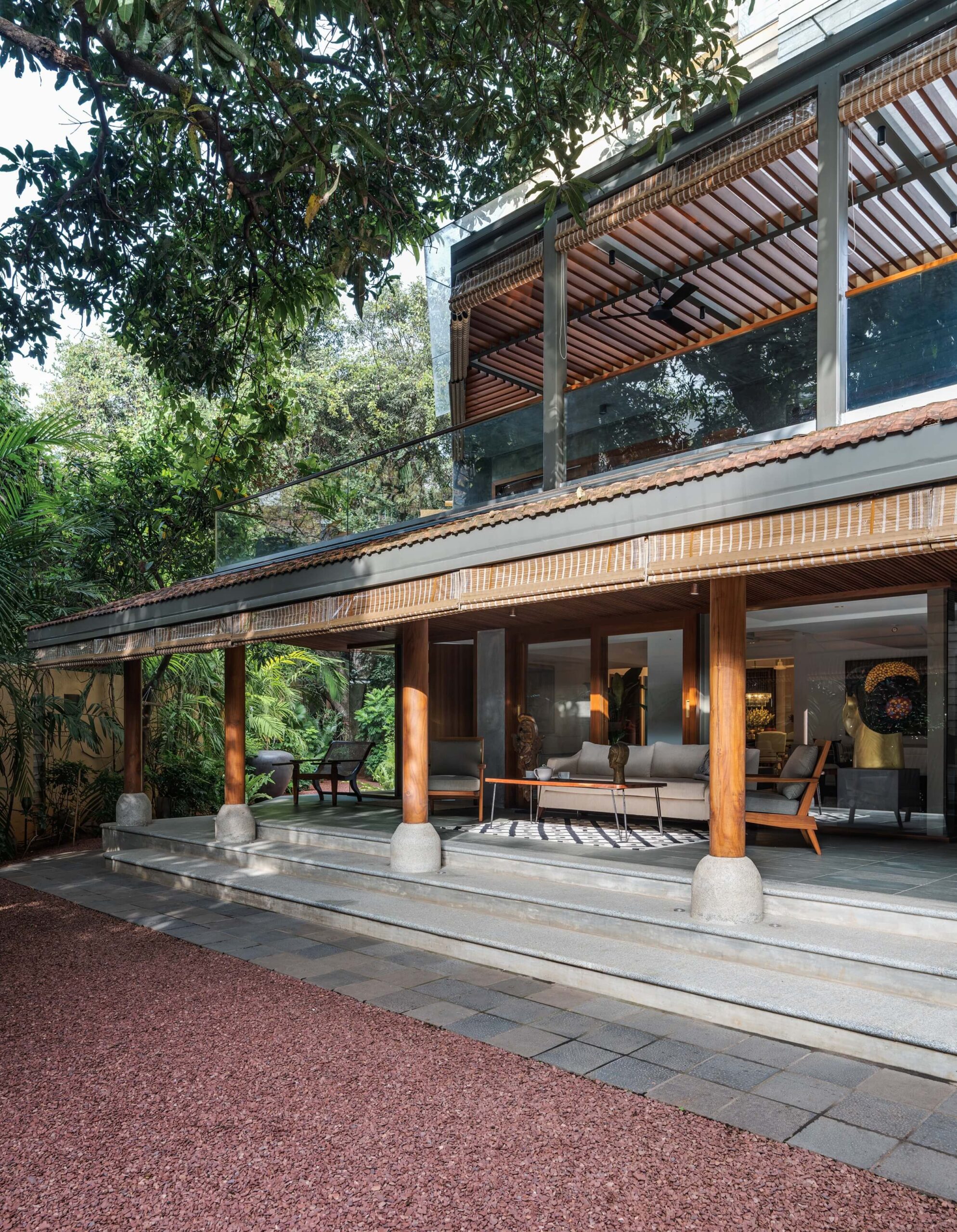 The first-floor sit-out features a wooden pergola topped with glass and bamboo blinds to protect from rain. This space interacts beautifully with the canopy of nearby trees. A large dining table sourced from Beruru sits here, surrounded by cane and wood chairs from Phantom Hands.