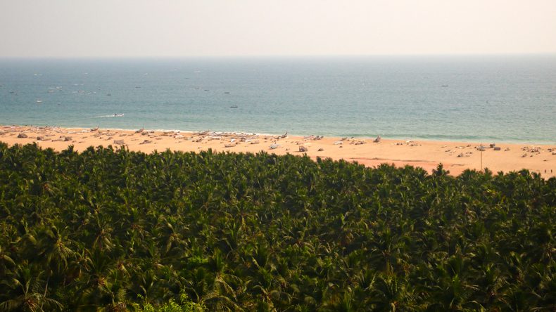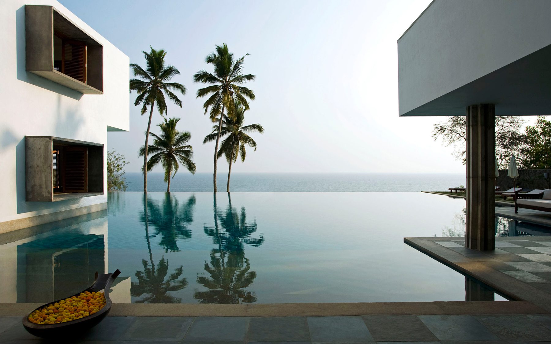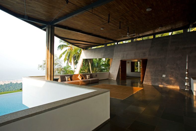 Perched on a cliff in Kerala with a 200ft drop to an expansive grove of coconut trees, beach and the Arabian sea, the house derives it’s form from an emotive response to the site. A skewed sheer concrete wall 45m long supports a single triangulated canopy roof that lunges out towards the view.