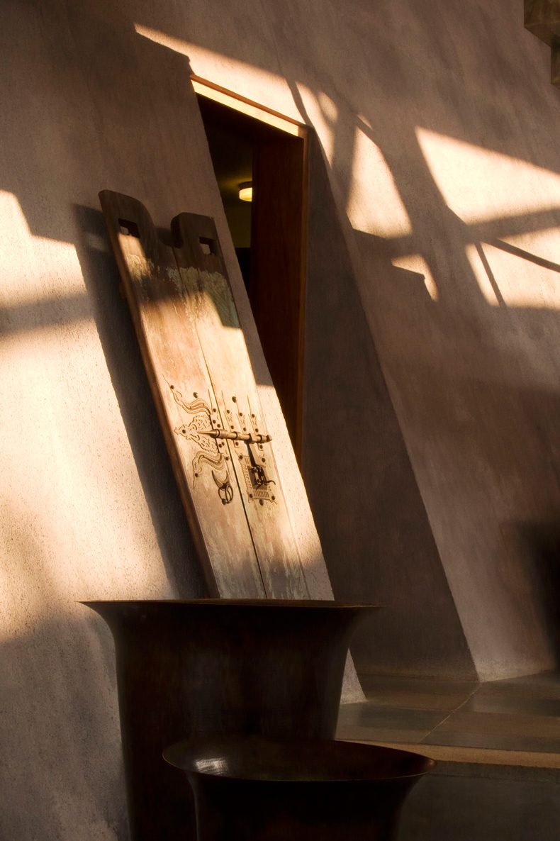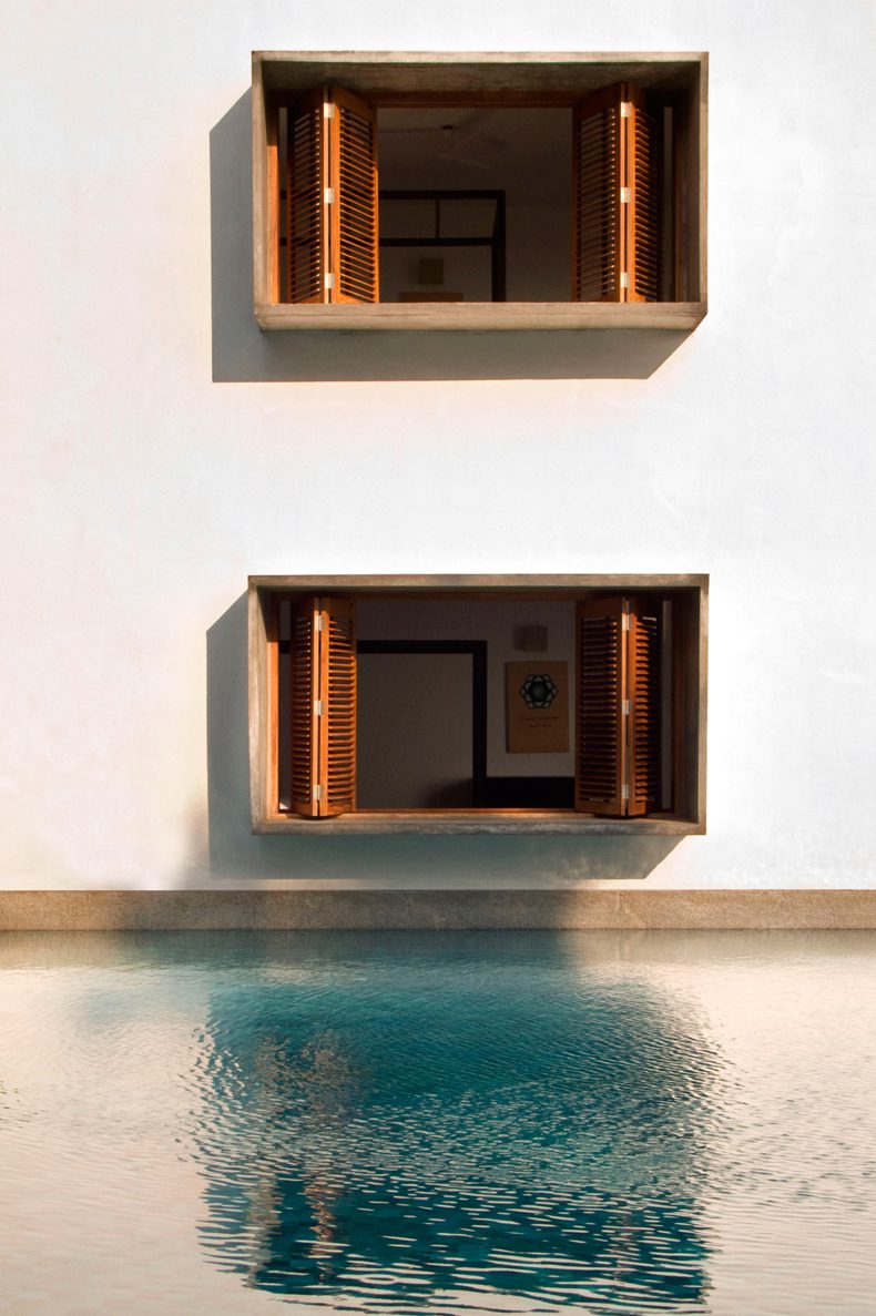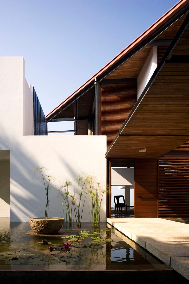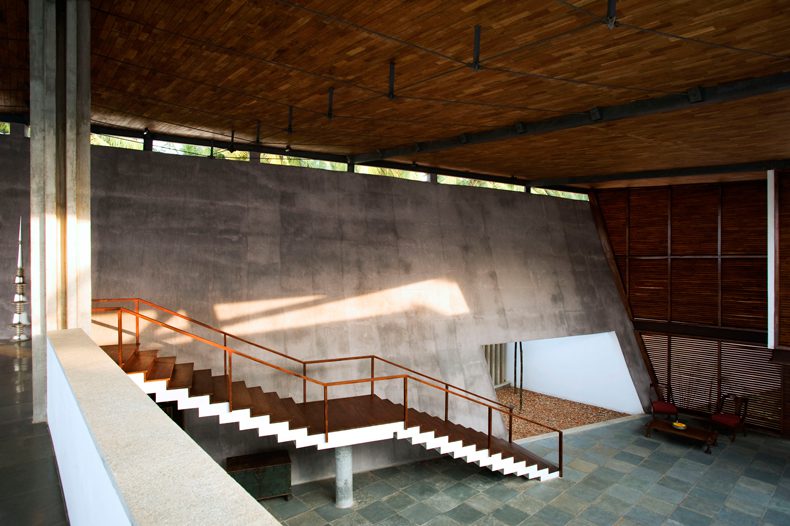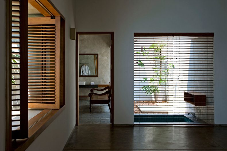 Ample overhangs were provided specially on the main roof to protect against the fierce western sun and monsoon rain. Since large expanses of glass would trap the heat in this environment, we devised a system of louvered wooden sliding and folding shutters for the doors and windows to let the sea breezes right through.