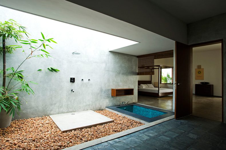 Bathrooms have open to sky courtyards that connect visually to the bedrooms, and furniture and accessories are kept to a minimal few so as not to stray from the natural environment and views.