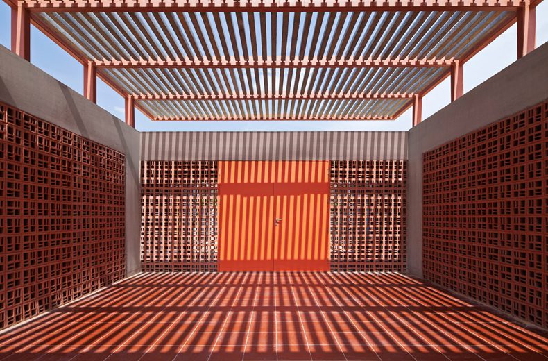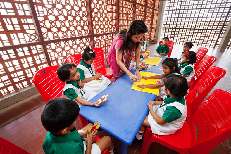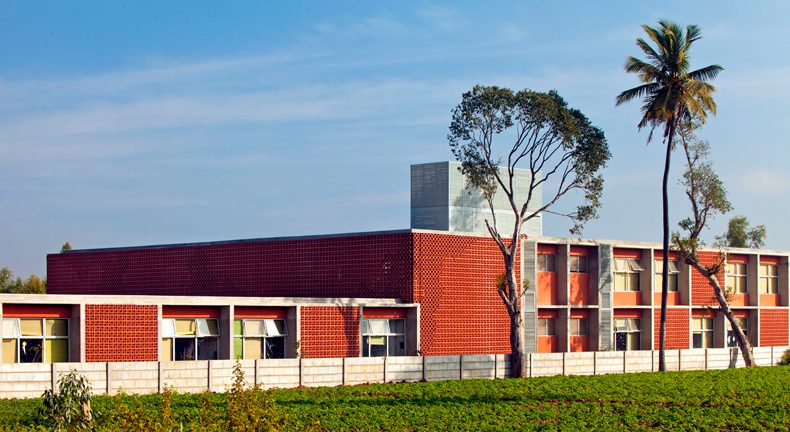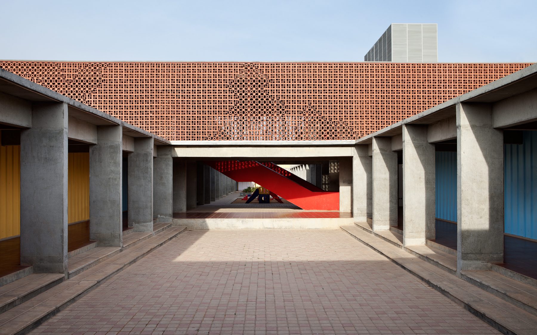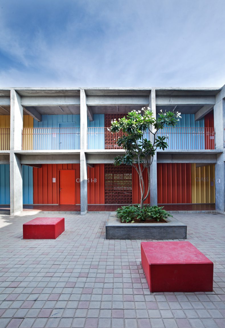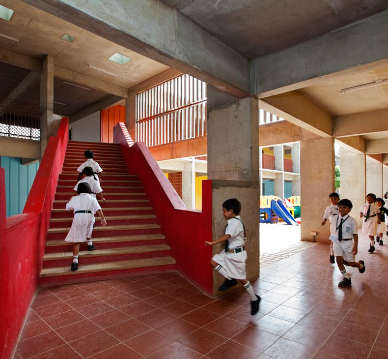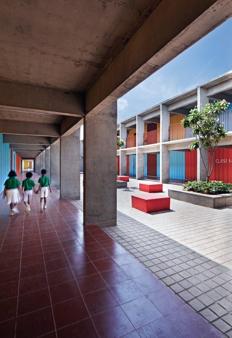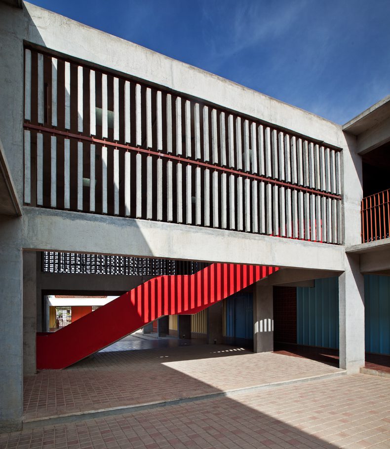 The brief called for us to design a franchise for one of the largest north Indian school chains, Delhi Public School. Since the high volume model was to be potentially replicated across several schools in South India, we were asked to create a simple and cost effective language that could be adapted easily to different site conditions and slightly varying programs. Our primary challenge was to formulate and construct a 35,000 sq ft kindergarten block ( part of an overall school masterplan) catering to 1,000 children, within six months and at an efficient cost of `1,200 per sq ft (USD $20/sft). We adopted a basic 35×20 ft classroom module, stacked it horizontally and vertically like building blocks, with a repetitive exposed concrete structure to which we added layers of intervention. Classrooms flank an eight ft wide, single loaded corridor that holds durable, brightly painted corrugated sheets. The building’s key features include a rich colour palette inspired by regional architecture and textiles; terracotta jaalis as a perforated external building skin that facilitate adequate cross ventilation and cut down the harsh western sun; and the passageway that draws you to a central, linear open-to-sky courtyard, which is the soul of the space and takes education “out of the box”. In an age of air- conditioned schools becoming increasingly popular in India, we have attempted a climate sensitive, energy efficient and cost effective approach that utilizes minimal electrical load during the day due to effective harnessing of breezes and adequate natural light. It is our hope as architects that we are able to take this simple yet effective typology further to other franchises in the region.