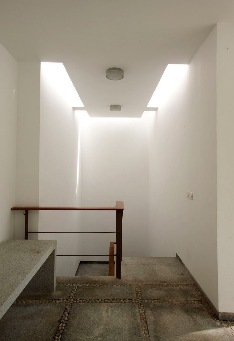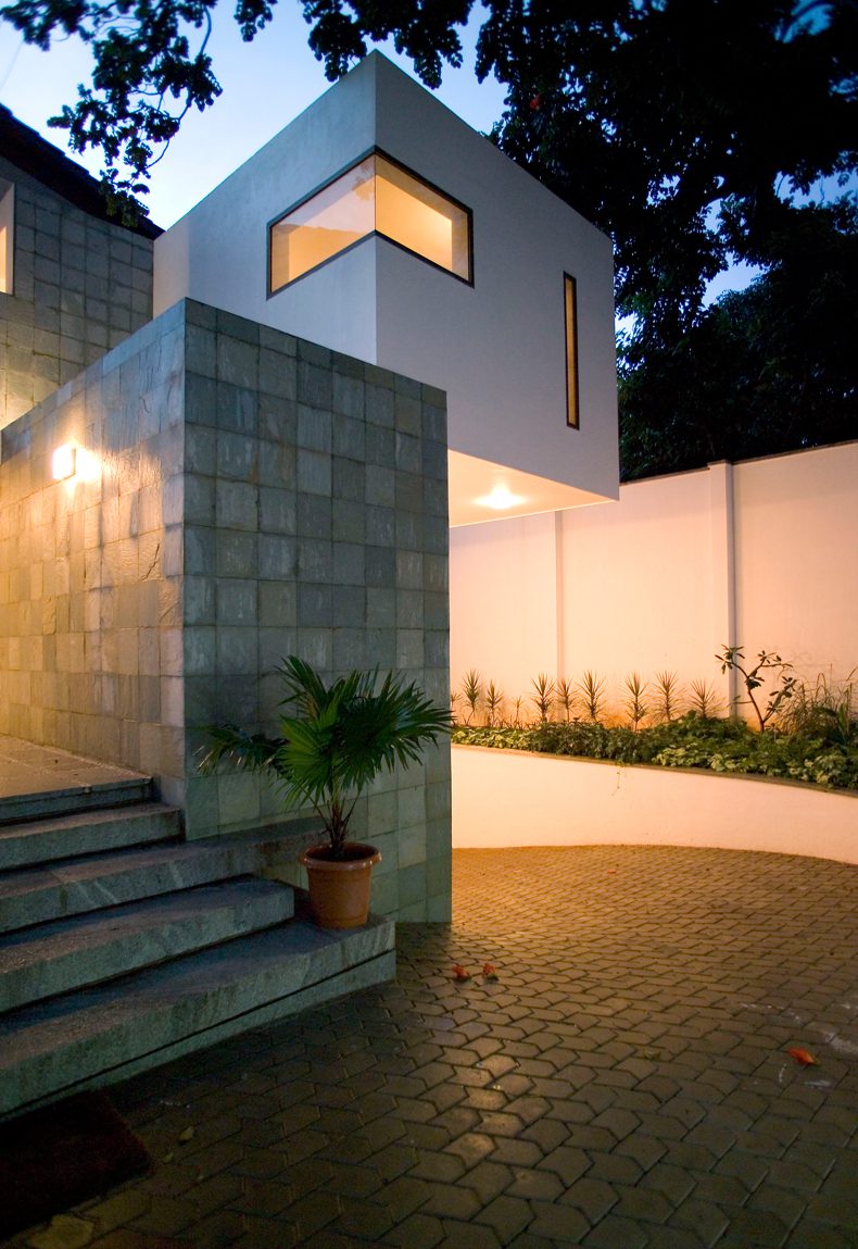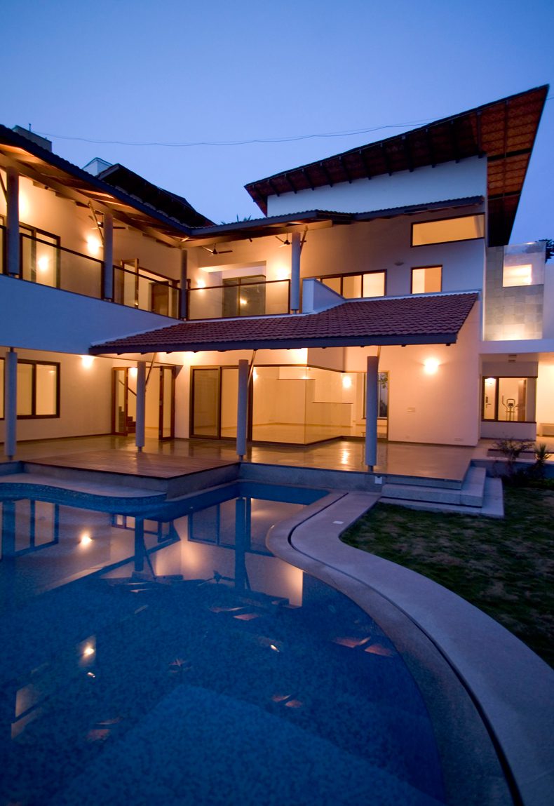 The house is situated in the heart of Bangalores commercial district so it was essential to provide a sense of calm. The constrained views on the north and east of the plot prompted a design that was L shaped, facing the south western lung space created by the garden, the swimming pool and a large shady rain tree.