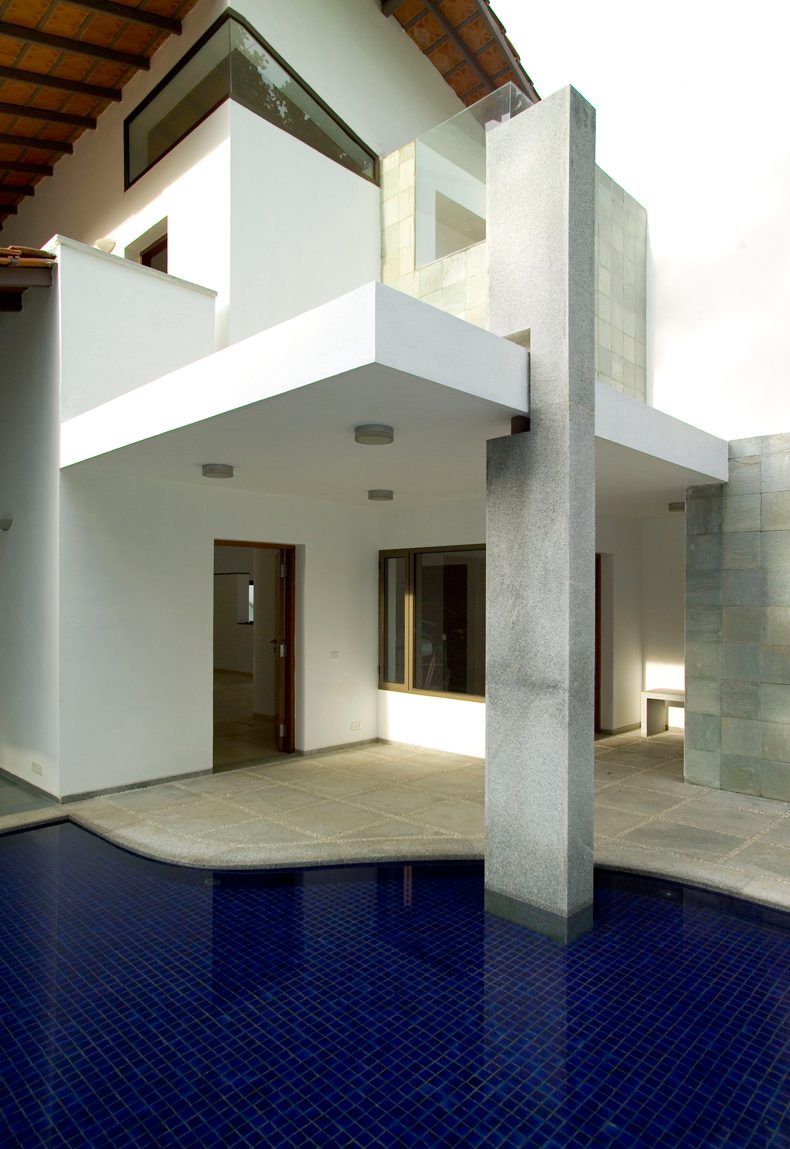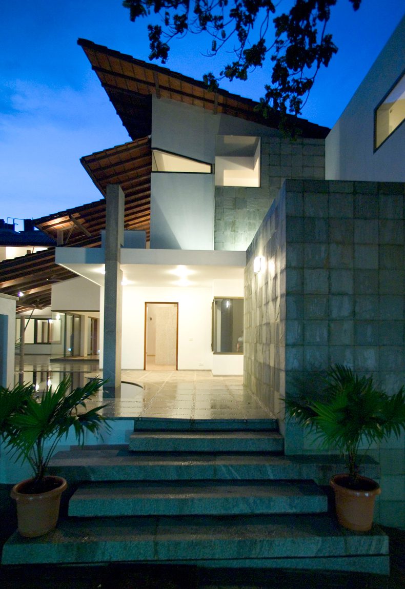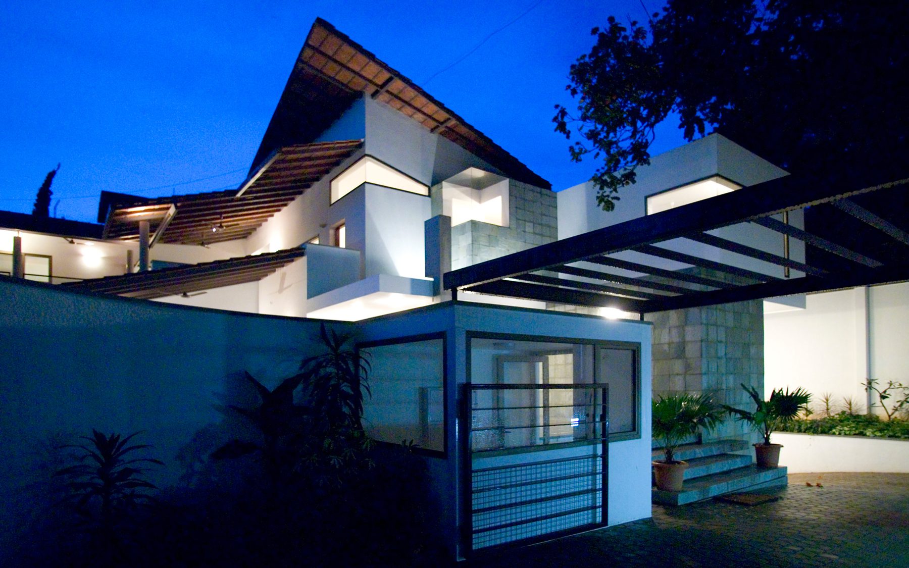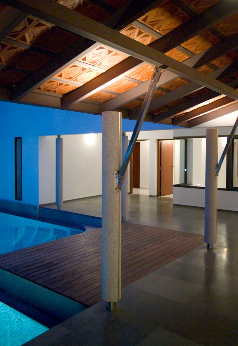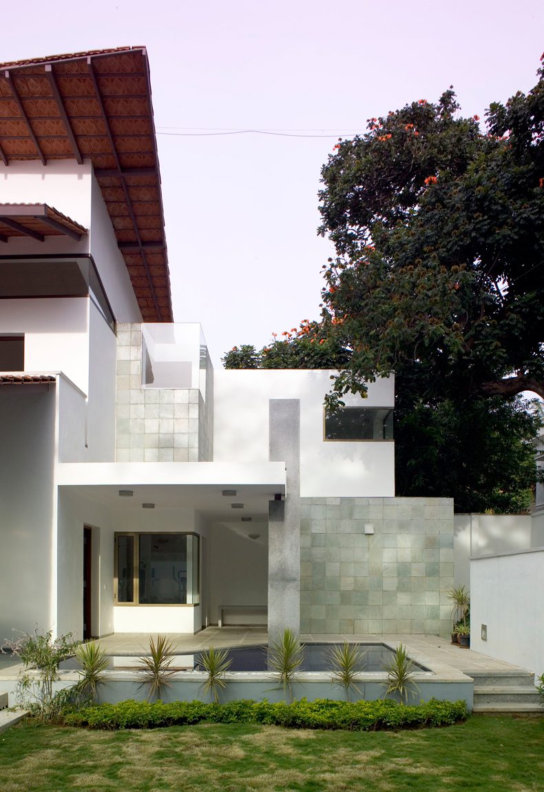 The architecture of the house is climate and context-sensitive. Skewed sloping vernacular tiled roofs with large overhangs combat the heavy monsoons, and the sweeping expanse of covered verandah protects the house from the fierce south sun.