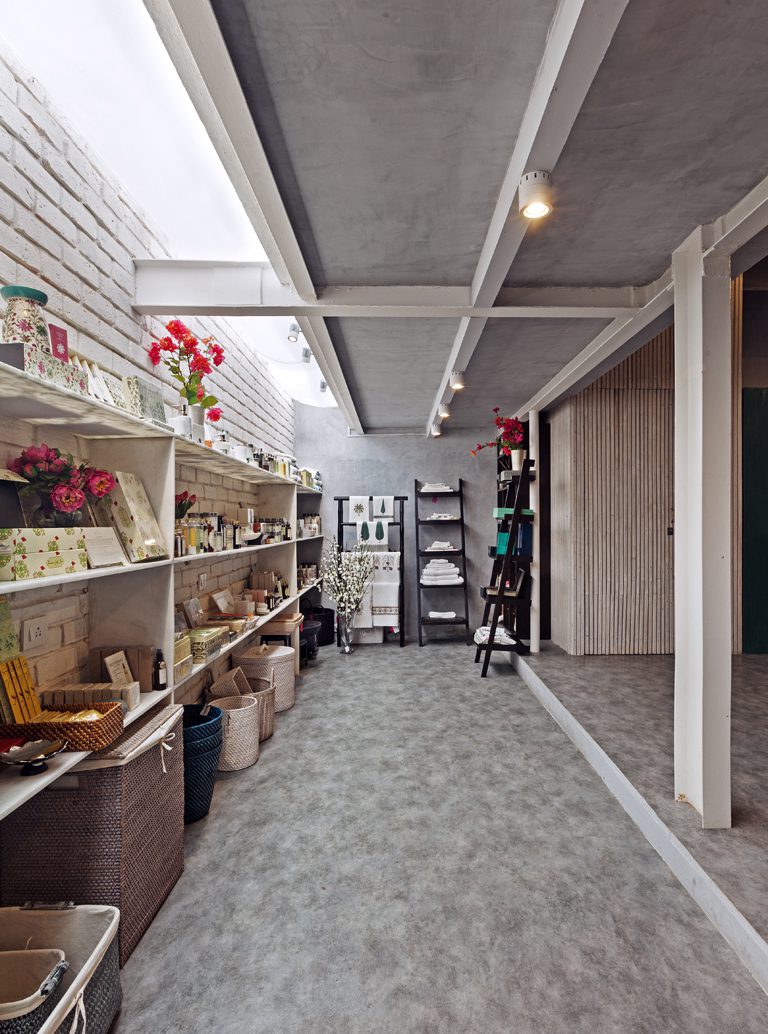 The upper floor is an airy space on two split-levels focusing on apparel and accessories. One of the highlights of the space is a screen of vertical jute that gently demarcates both levels. At the far end is the display of spa products set against a white brick wall and bathed gently with natural light via a skylight.