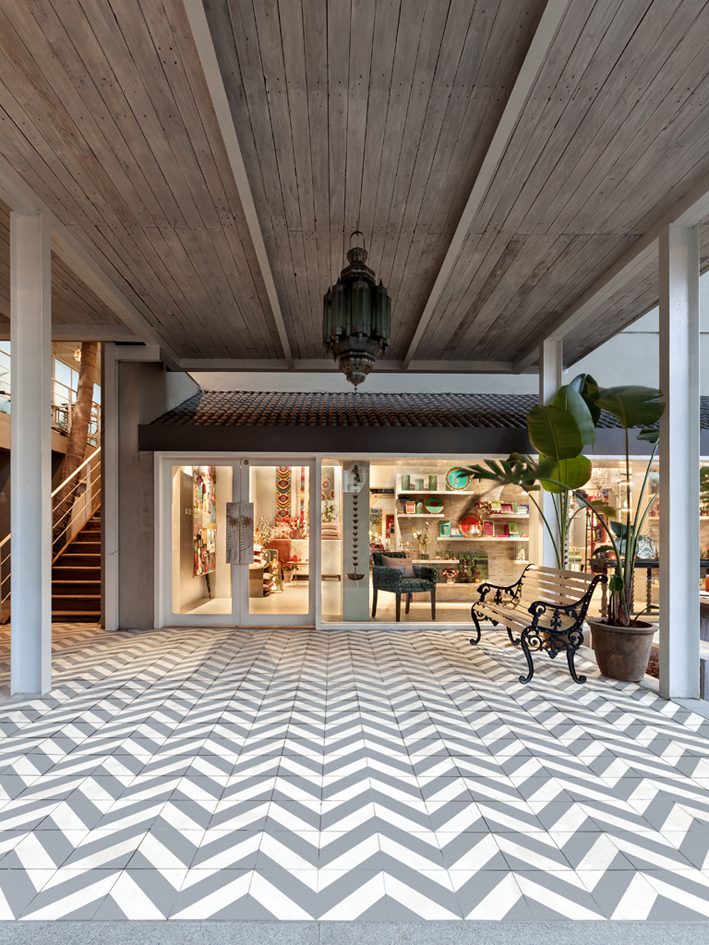 The materials used are natural and recycled. The undersides of the roofs are in recycled crate wood and internal walls rendered in polished cement. Certain highlight walls are punctuated in white painted brick while the display fixtures are crafted in exposed steel and recycled timber. The flooring is an intentional patchwork of the existing terrazzo restored with areas of cement.