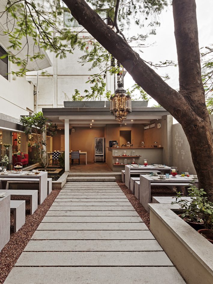 The site, located in Bangalore’s’ most fashionable shopping district features an open-to –sky courtyard at its entrance. We intervened by inserting a covered pavilion and a verandah at its two ends; one accommodates an organic juice and salad bar/cafe while the other acts as a generous entry to the store and a connector between its two levels
