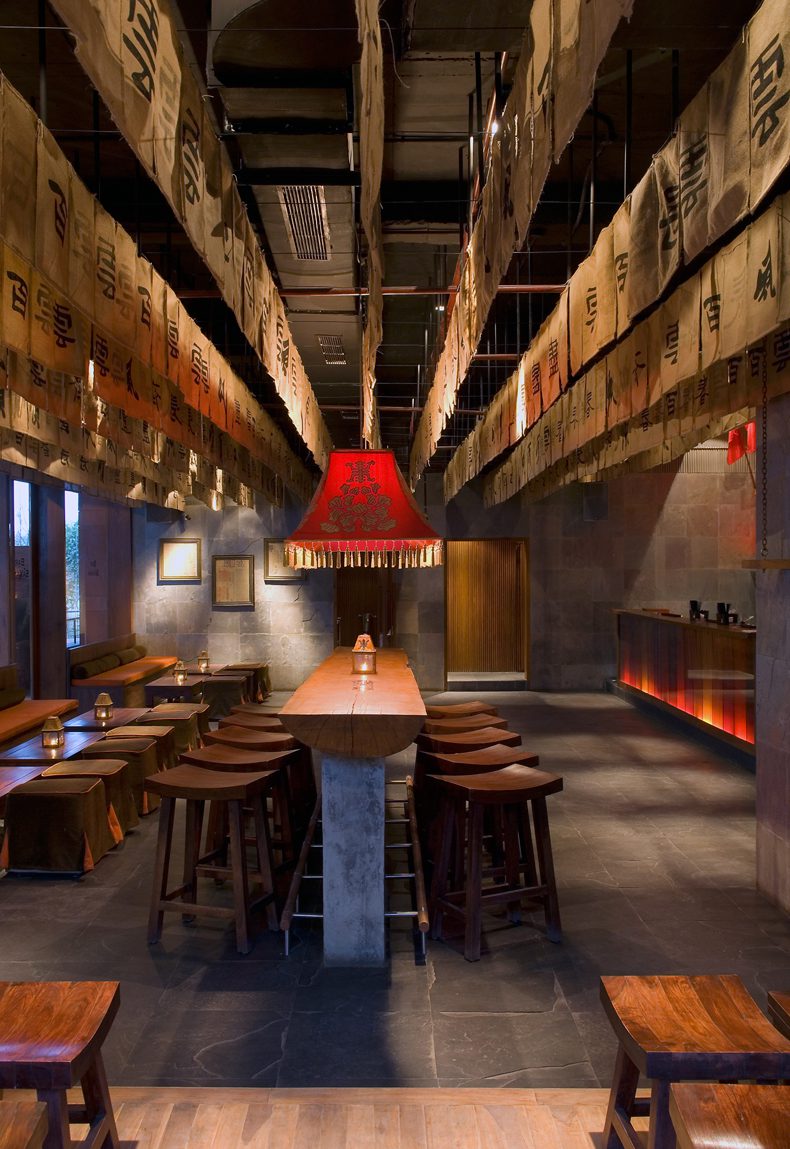The grey and black slate shell inside Bar Savahn was livened with splashes of bright red from the silk and brocade lamp hanging above a rough log table, while the long bar counter was dressed with a backdrop of marching terracotta warriors illuminated in a red glow. Silk panels in tones of garnet, fuchsia and red were sandwiched between glass and backlit forming the bar front. The ceiling was the highlight with hundreds of jute flags suspended by cables, each flag screen printed with ancient Chinese calligraphic symbols of the five elements – metal, wood, water, fire and earth.