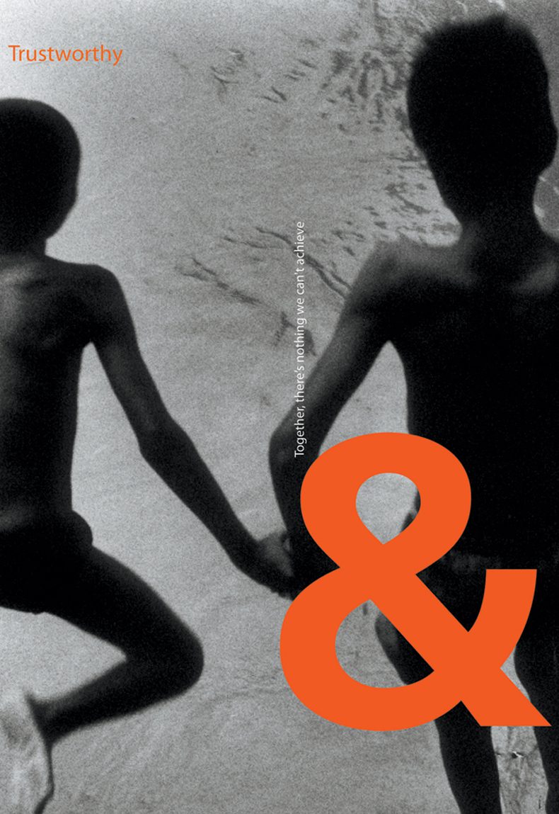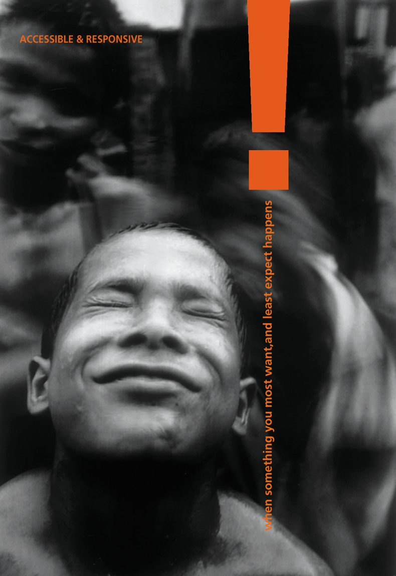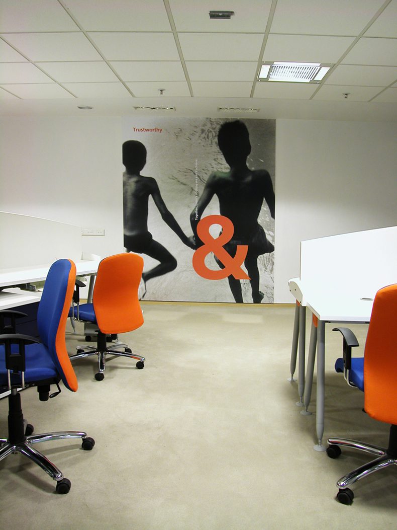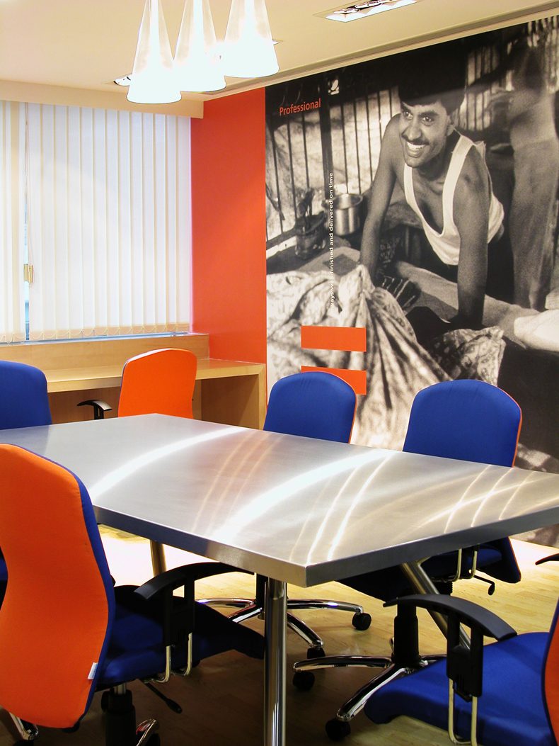 The brand intents and corporate values are brought into the minimal space by graphic design firm tsk design. Larger-than-life visuals of black and white Indian street imagery create and emotive connect with the local context while bold graphic interventions in orange reinforce the brand color and intent and engage with the viewer.