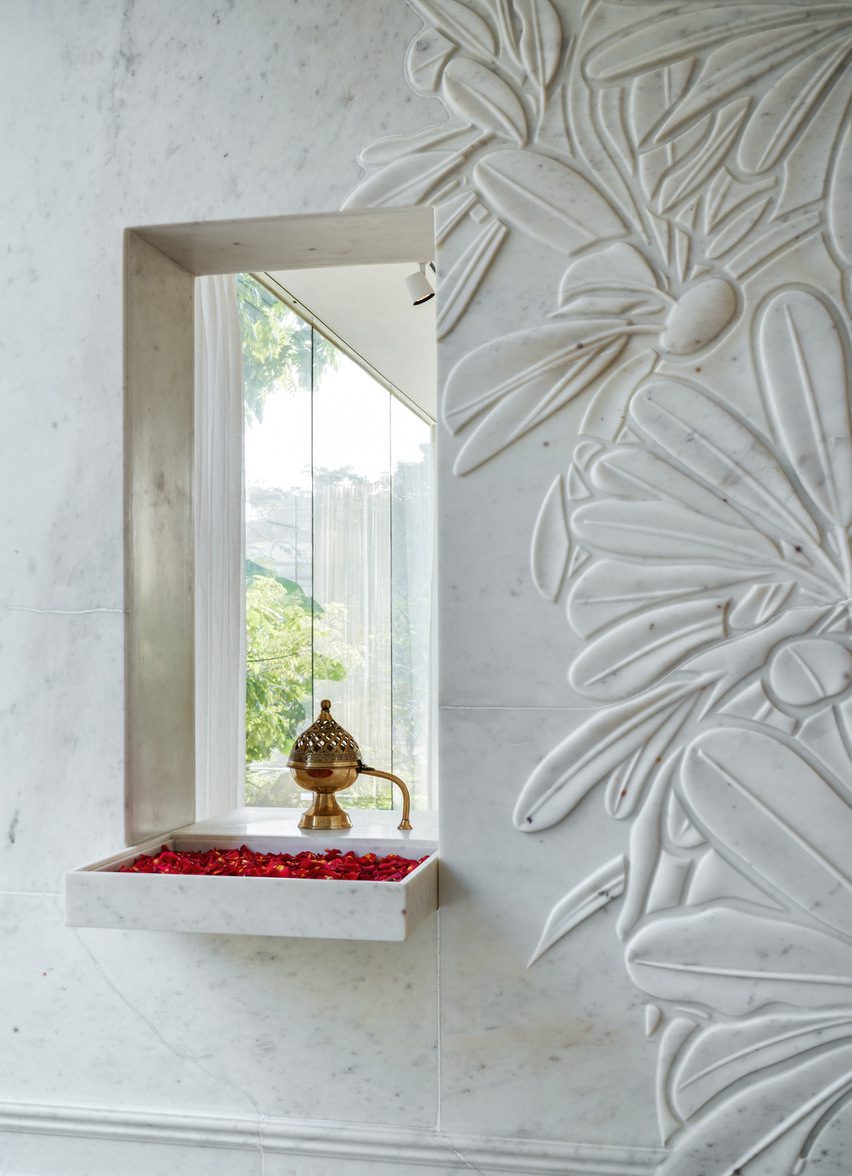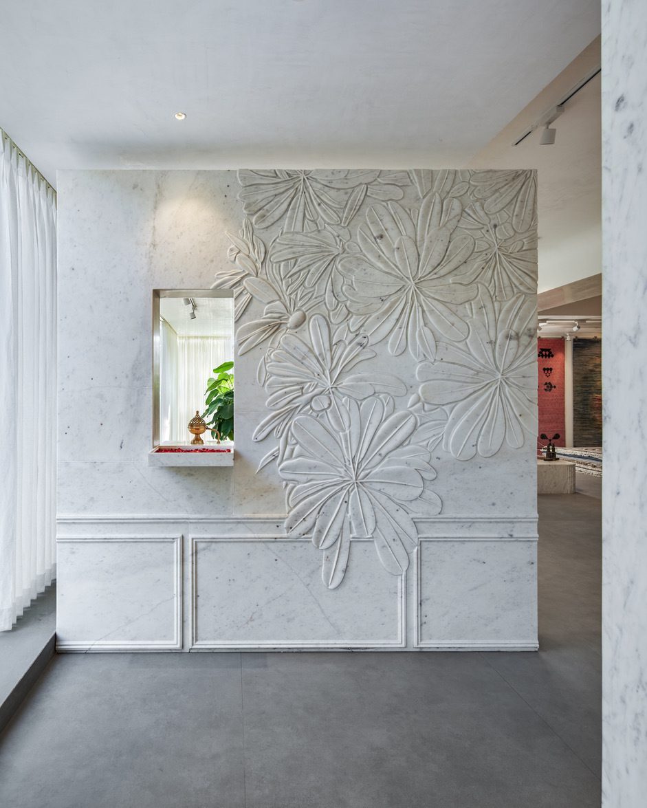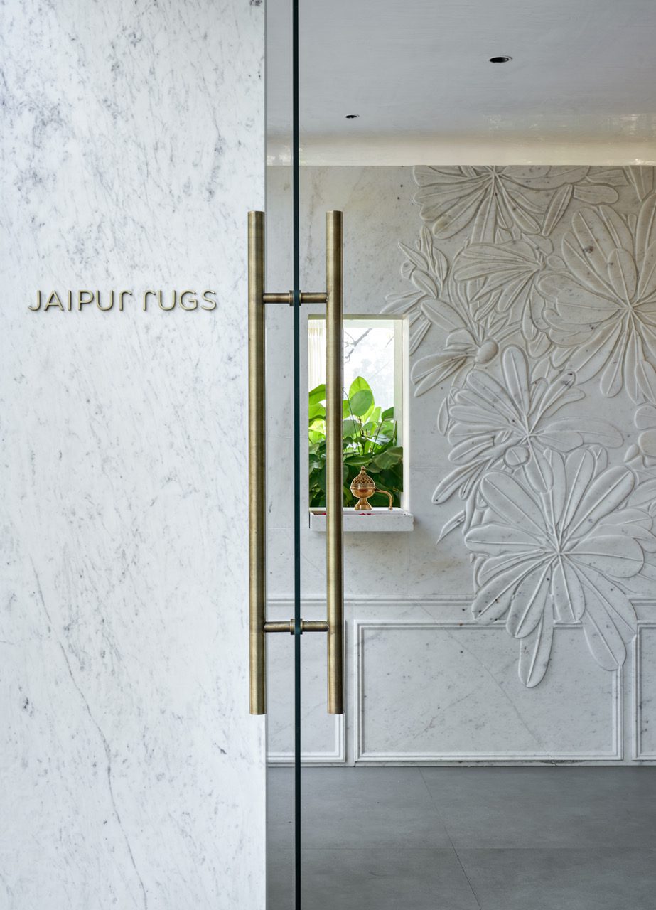 At the entrance of the store, one is greeted by an imposing free-standing wall clad in local Banswara white marble. The wall welcomes the visitor with a rectilinear cutout and a projecting marble tray filled with rose petals. Marble relief work depicting a flourish of frangipani leaves was inspired by a rug from the collection and the intricate hand carving was executed by artisans in Jaipur.
