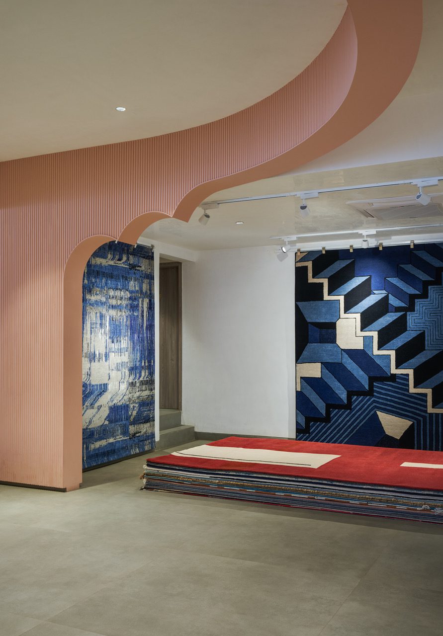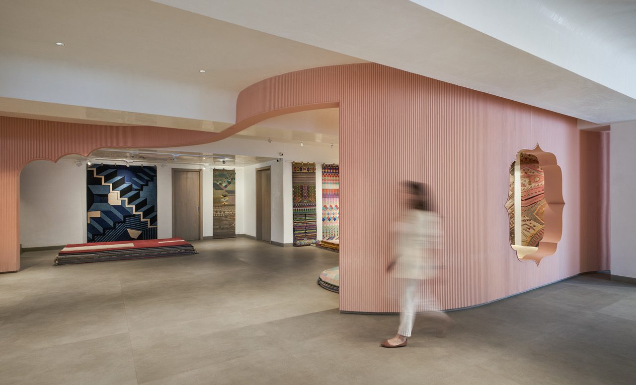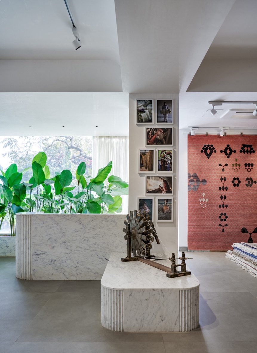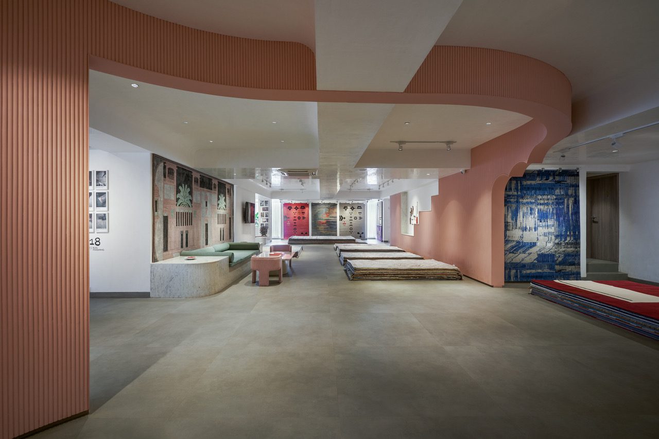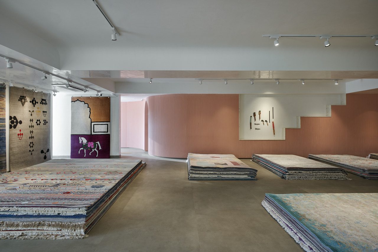An important part of the brief was to showcase the ethos of the brand in the visual language of the store. We referenced the ‘Pink City’ of Jaipur with a dynamic and sensual fluted wall that gently demarcates work areas from the display space. The wall references motifs from the forts, palaces and stepwells of the old walled city and playfully weaves itself across the orthogonal dimension of the store. Feature walls and ledges are hand crafted in local Banswara marble from Rajasthan, and the white stucco walls and ceilings form a muted backdrop to the hand knotted and tufted rugs on display.