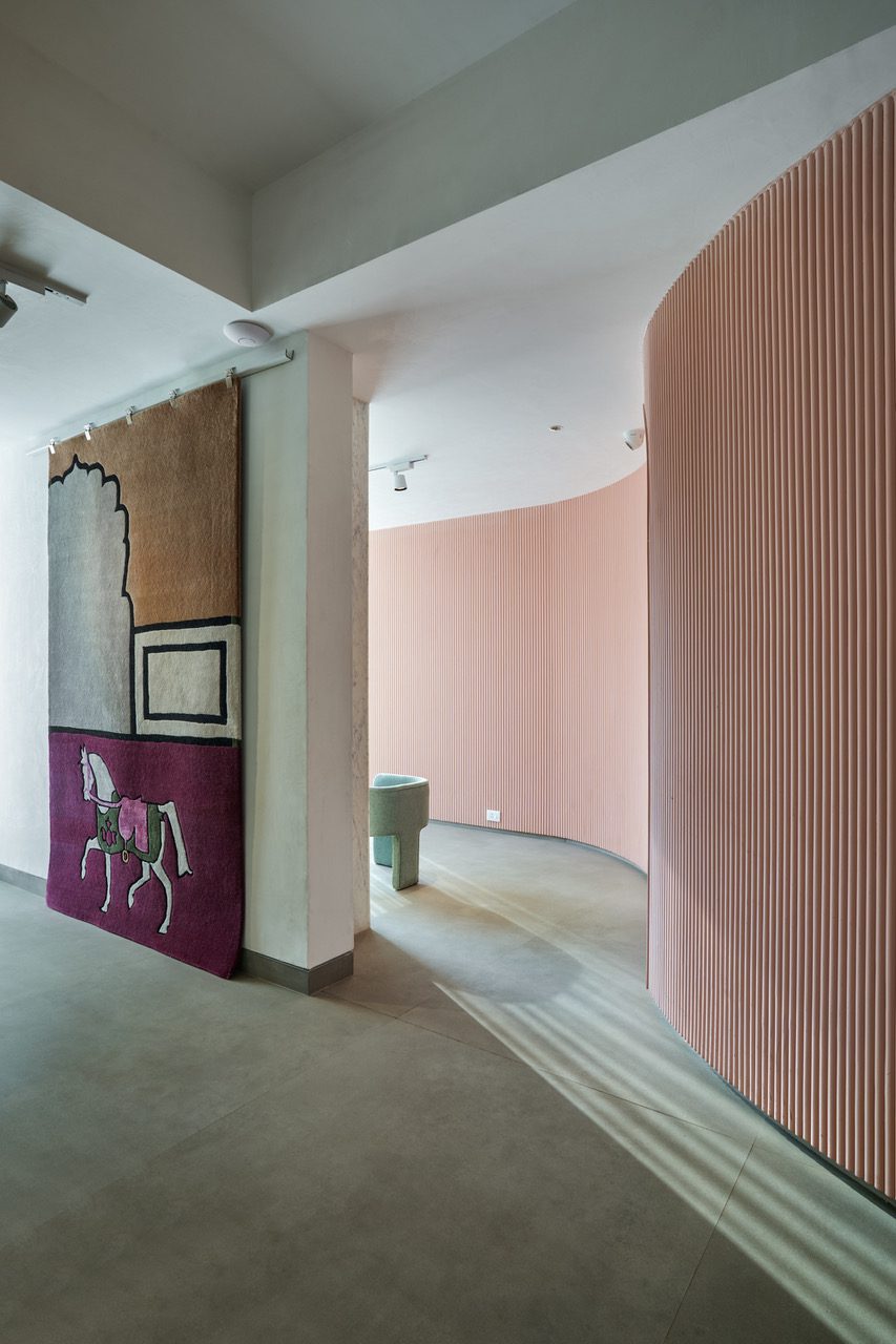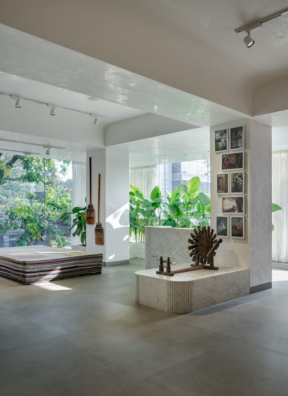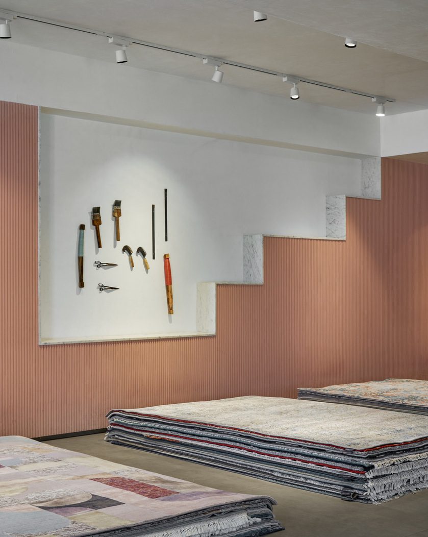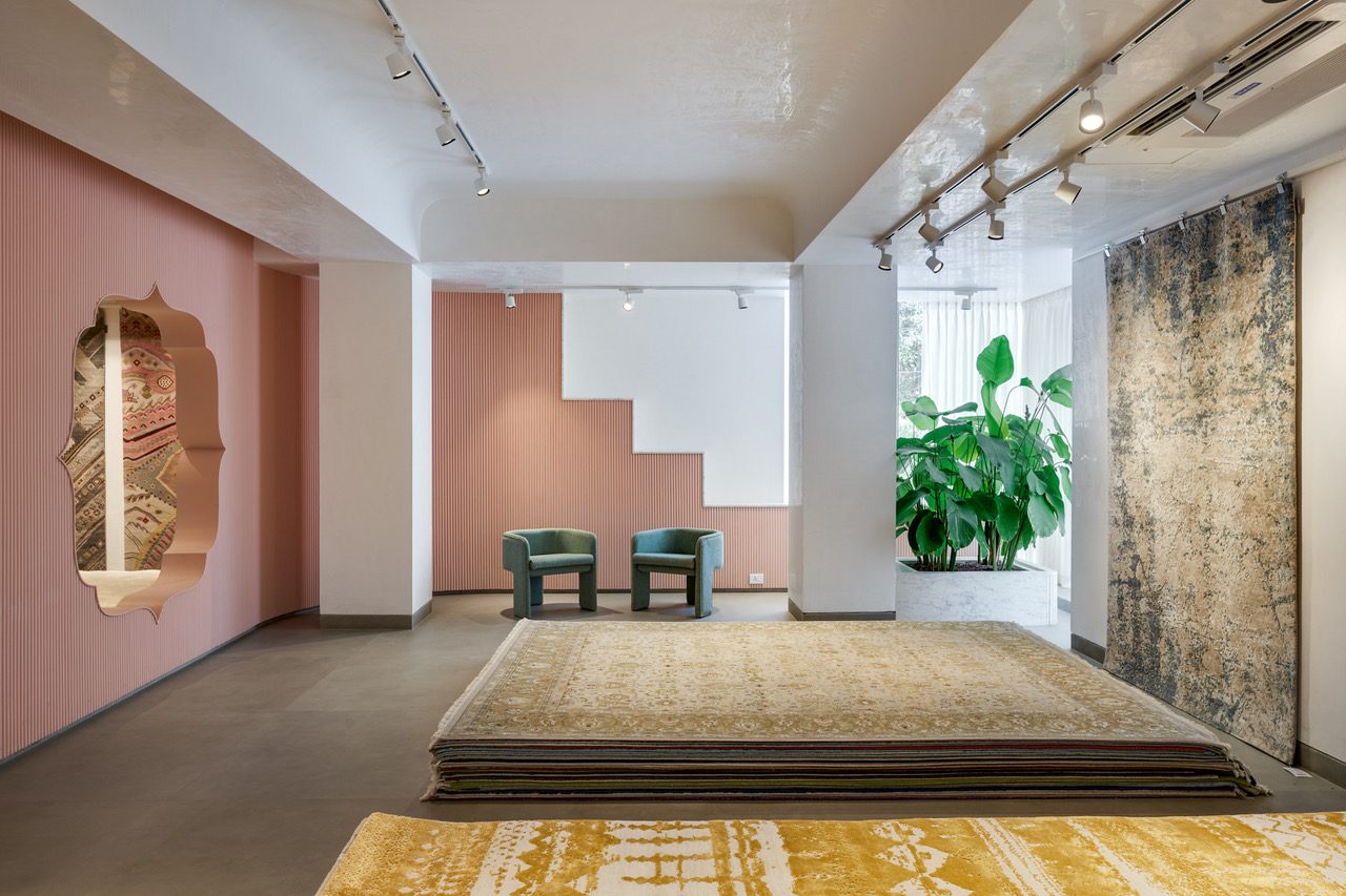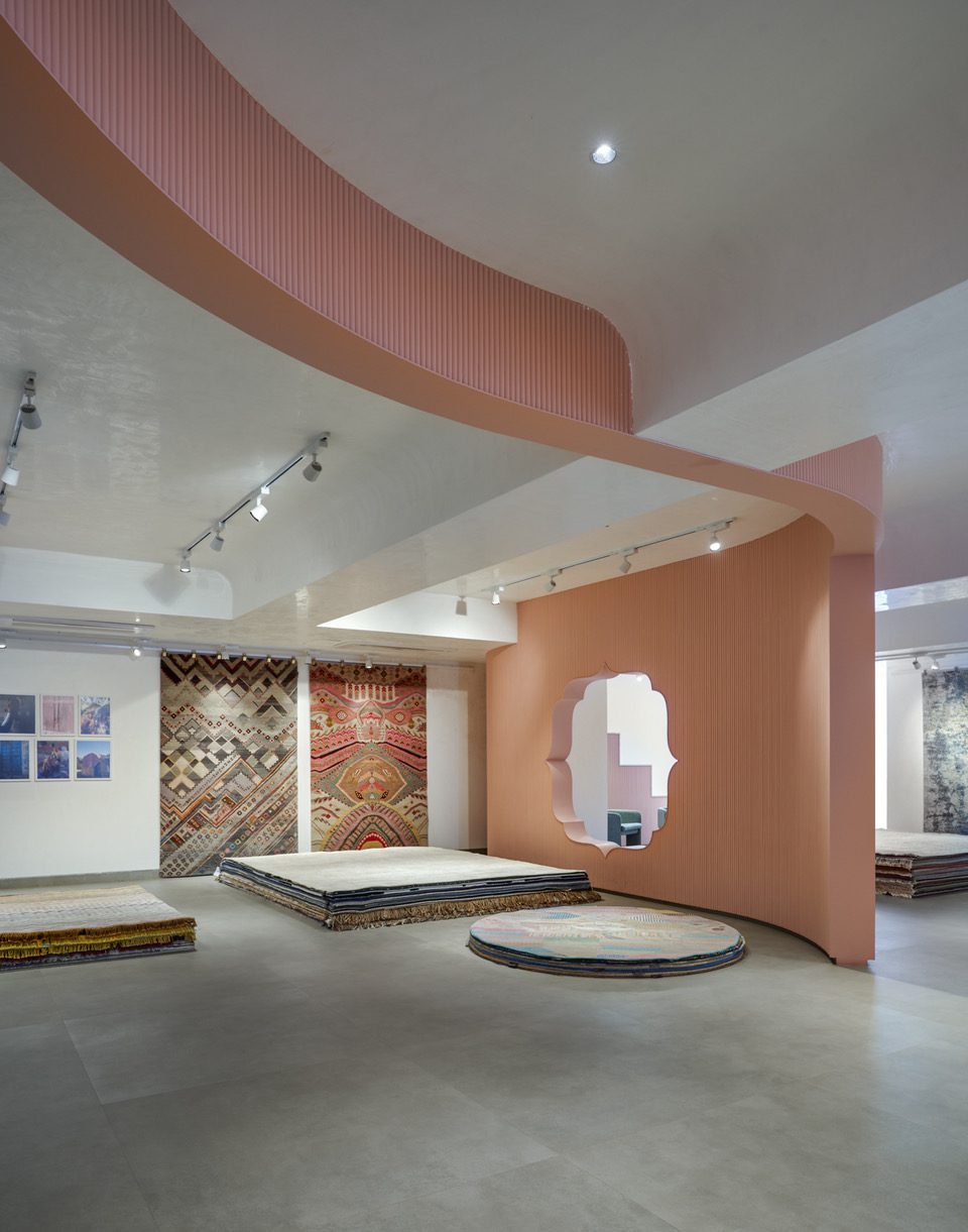 An important part of the brief was to showcase the ethos of the brand in the visual language of the store. We referenced the ‘Pink City’ of Jaipur with a dynamic and sensual fluted wall that gently demarcates work areas from the display space. The wall references motifs from the forts, palaces and stepwells of the old walled city and playfully weaves itself across the orthogonal dimension of the store. Feature walls and ledges are hand crafted in local Banswara marble from Rajasthan, and the white stucco walls and ceilings form a muted backdrop to the hand knotted and tufted rugs on display.