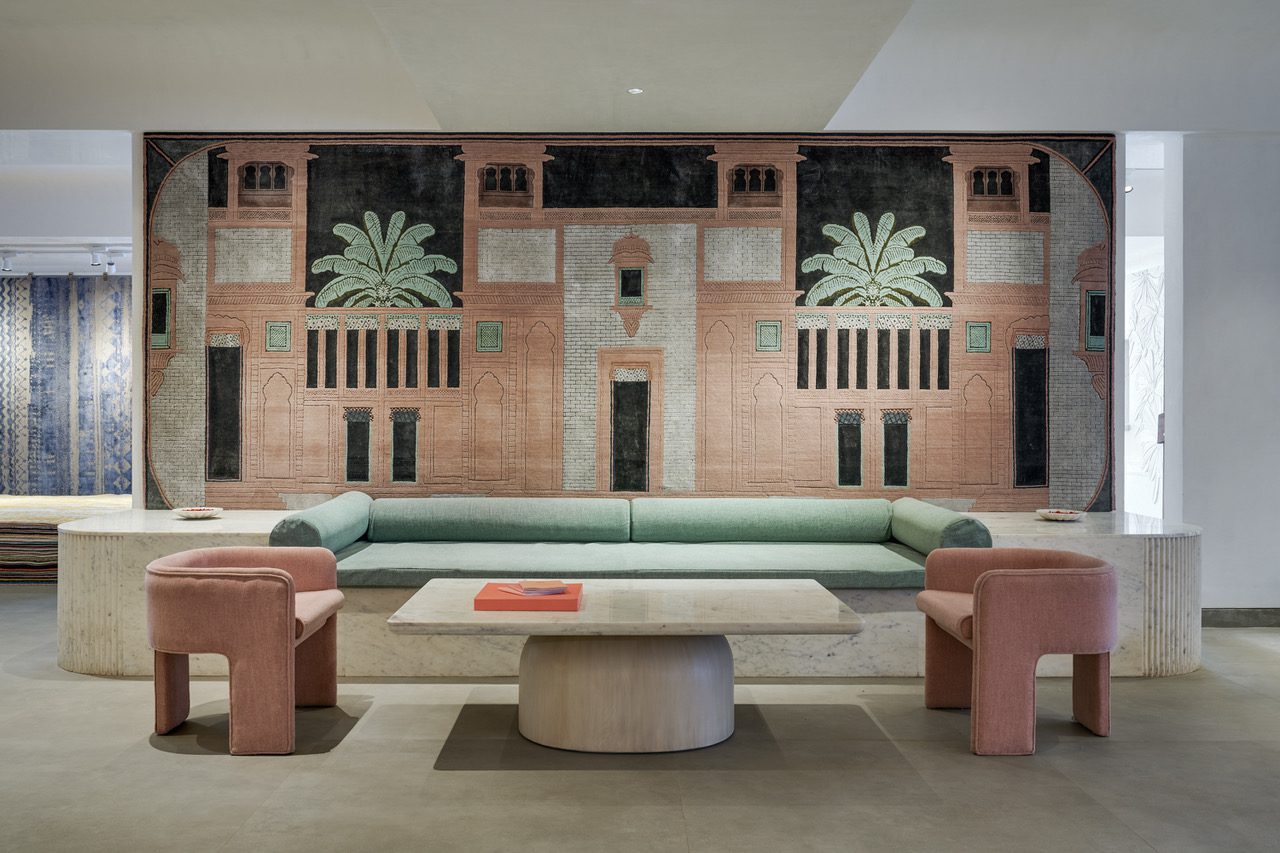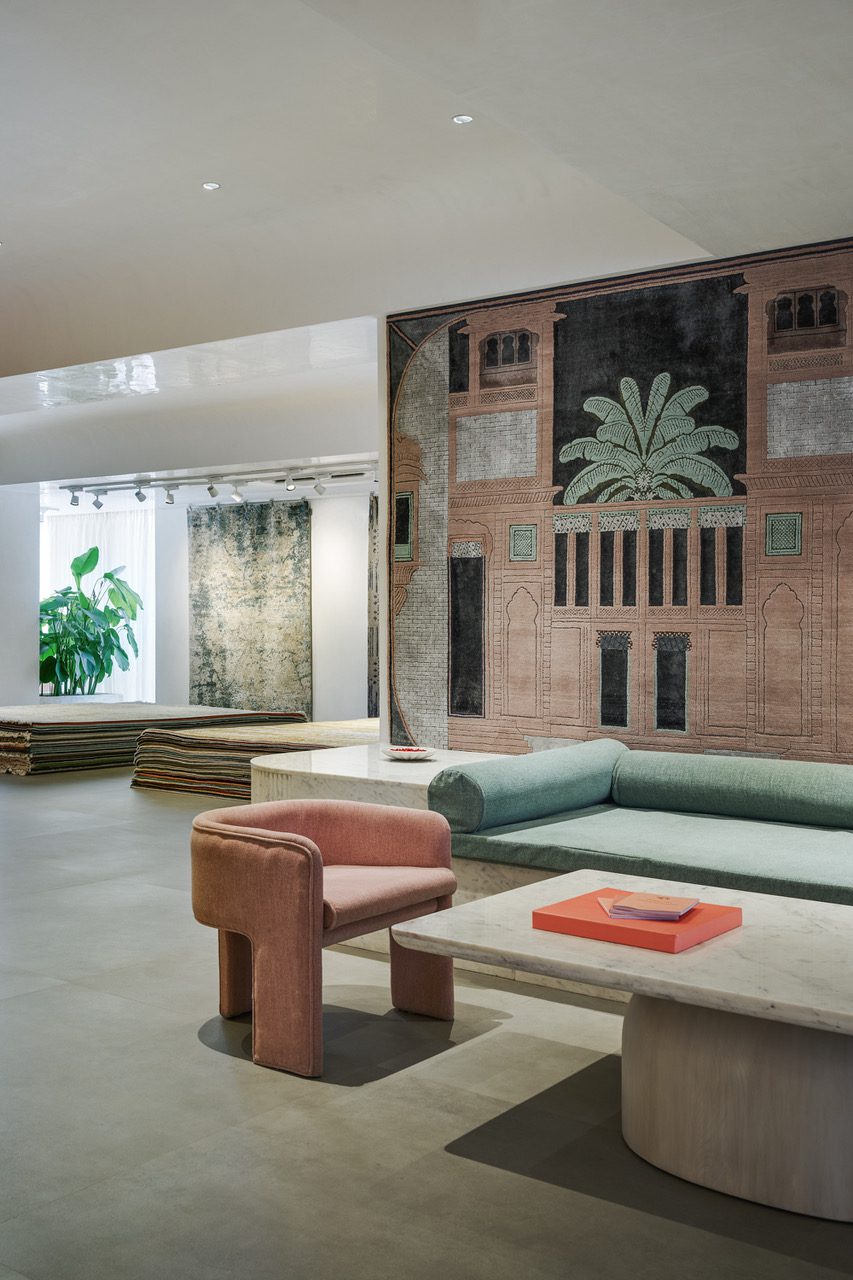 At the center of the store we created a traditional marble ‘Diwan’ seating for customers. For its backdrop we custom-made a 37 ft wide hand-knotted carpet designed by Matteo Cibic acting as a wall mural. The soft colours of this mural in Salmon, mint and grey echo the colour scheme in the rest of the shell. The flooring, a matt grey porcelain tile was deliberately chosen as the appropriate neutral surface to view the plethora of rugs on display.