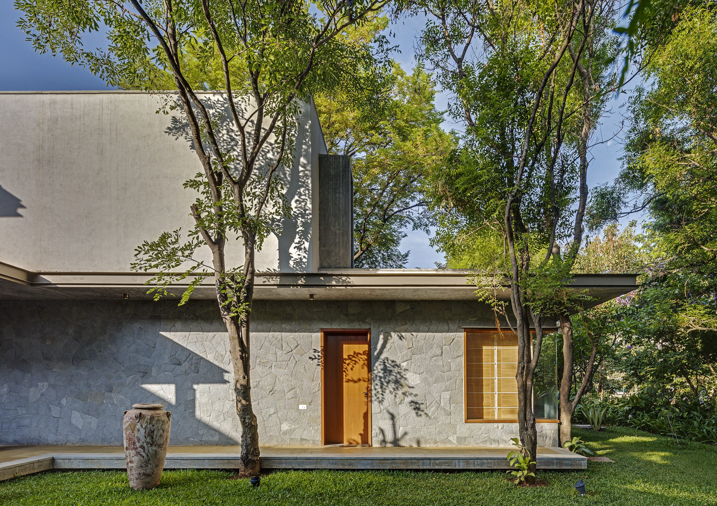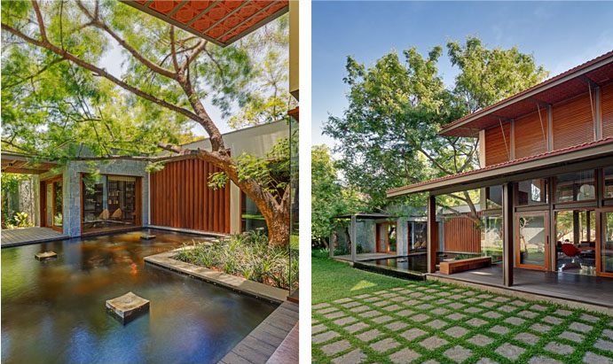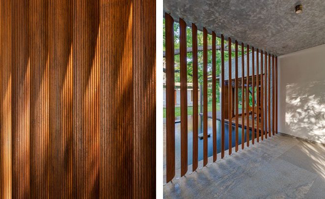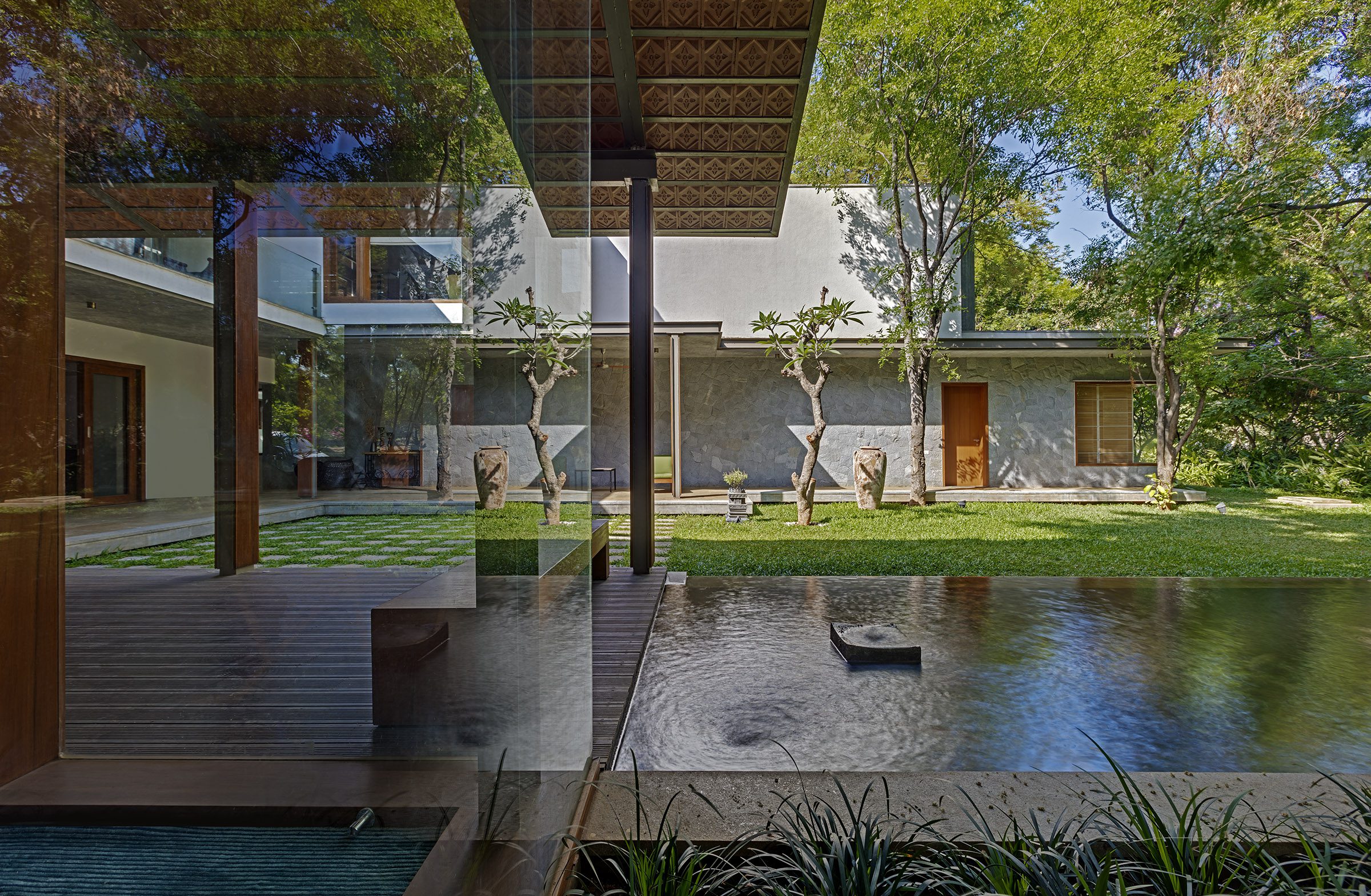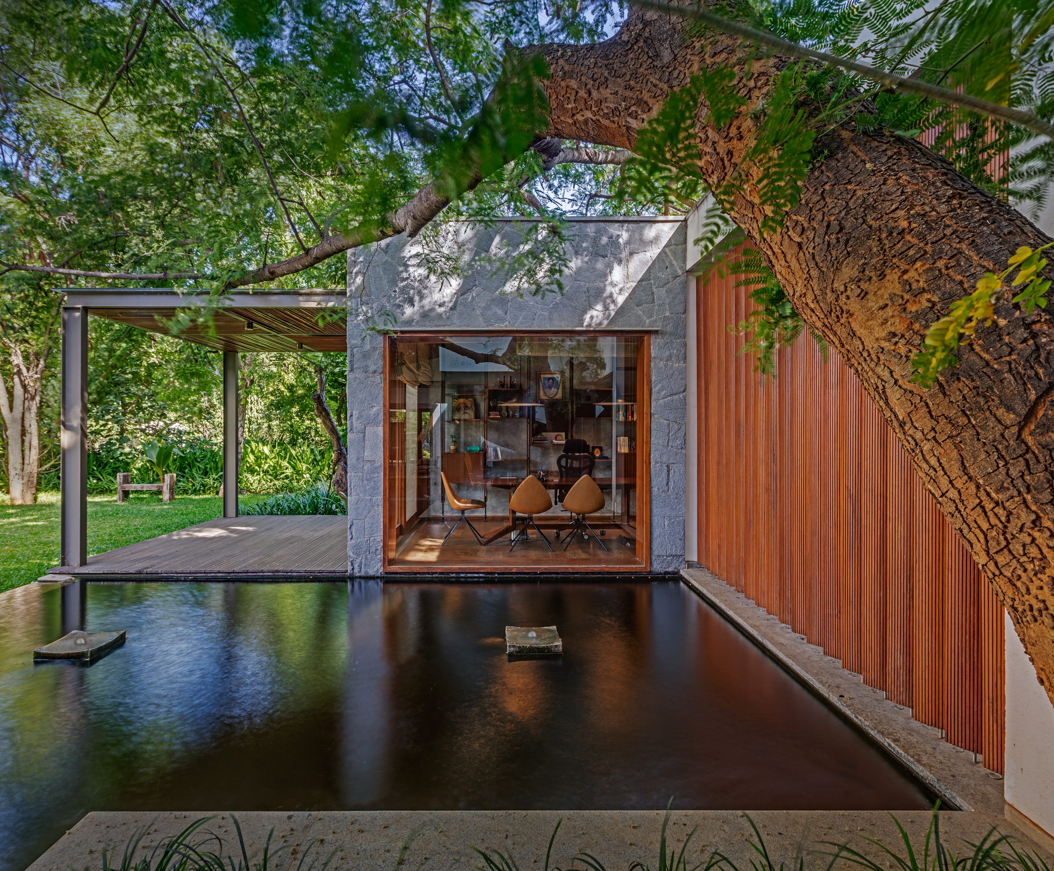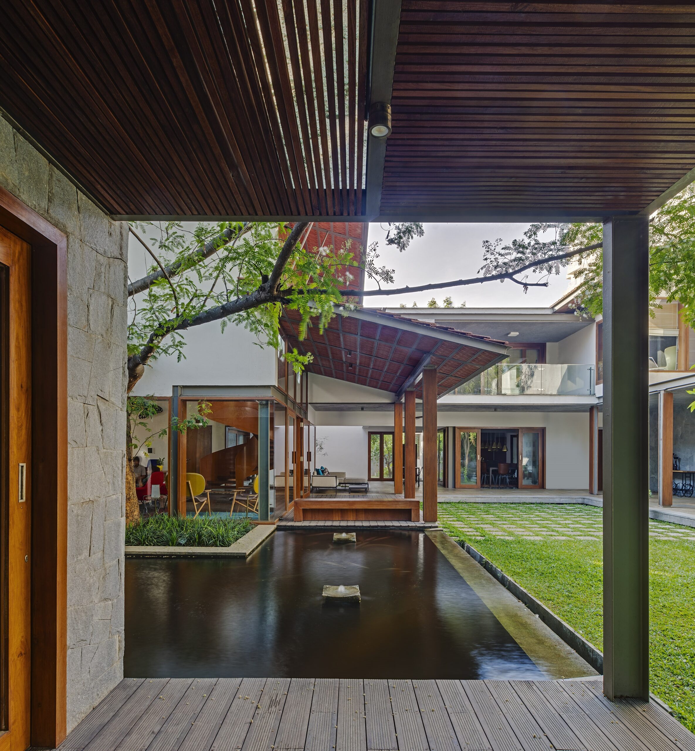 On the garden side, the study and the living rooms flow into their respective verandahs that hug a large pebbled fishpond. An existing tree emerges from the water and is uniquely framed by the built form of the house on either side and by pivoted vertical timber slats as a backdrop that gently separate it from the house entrance.