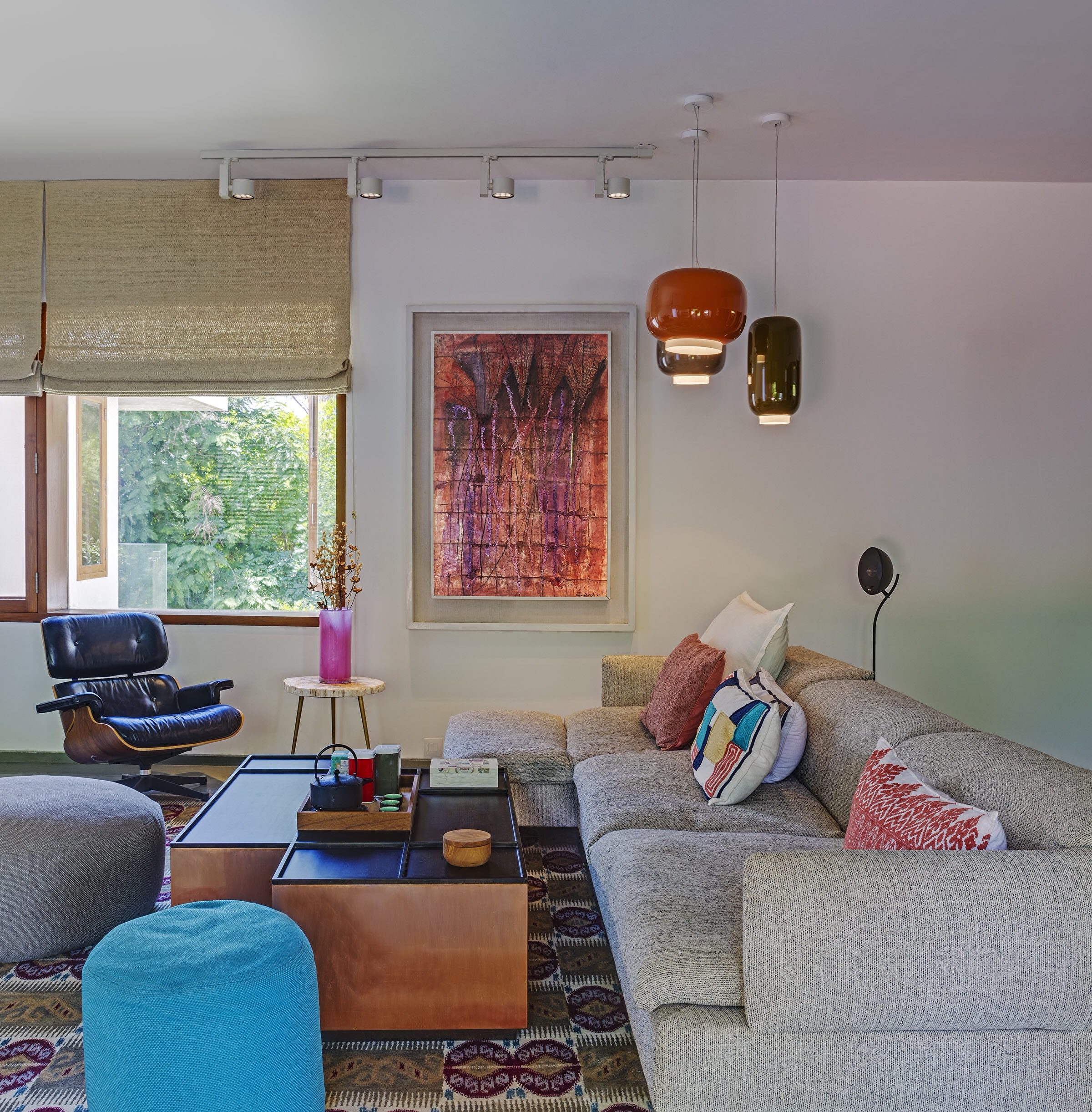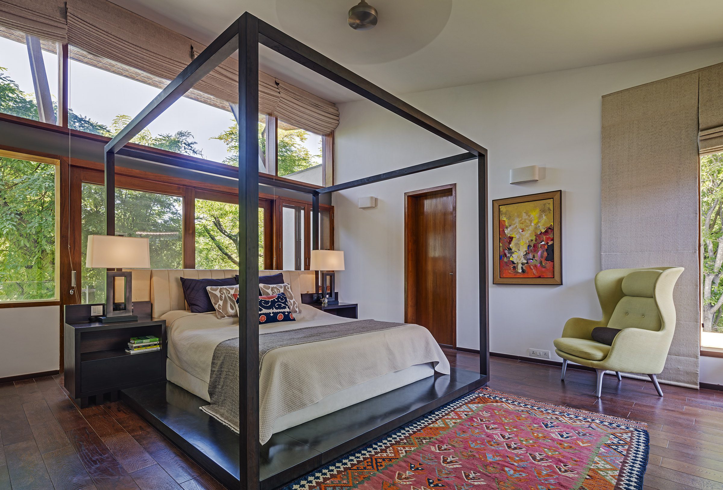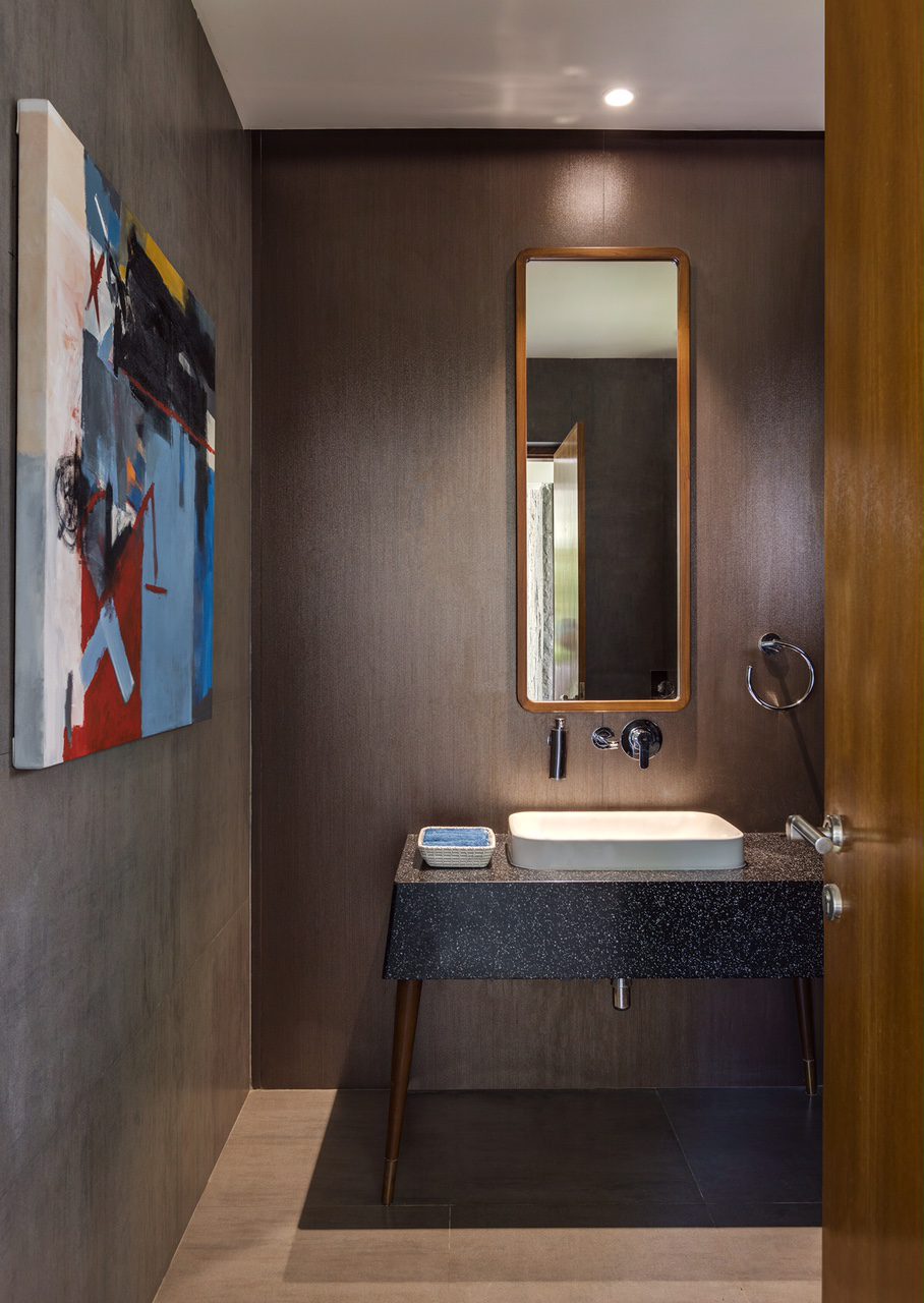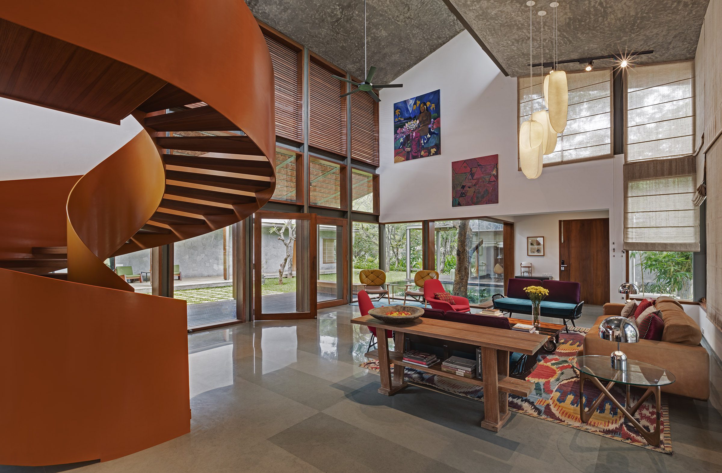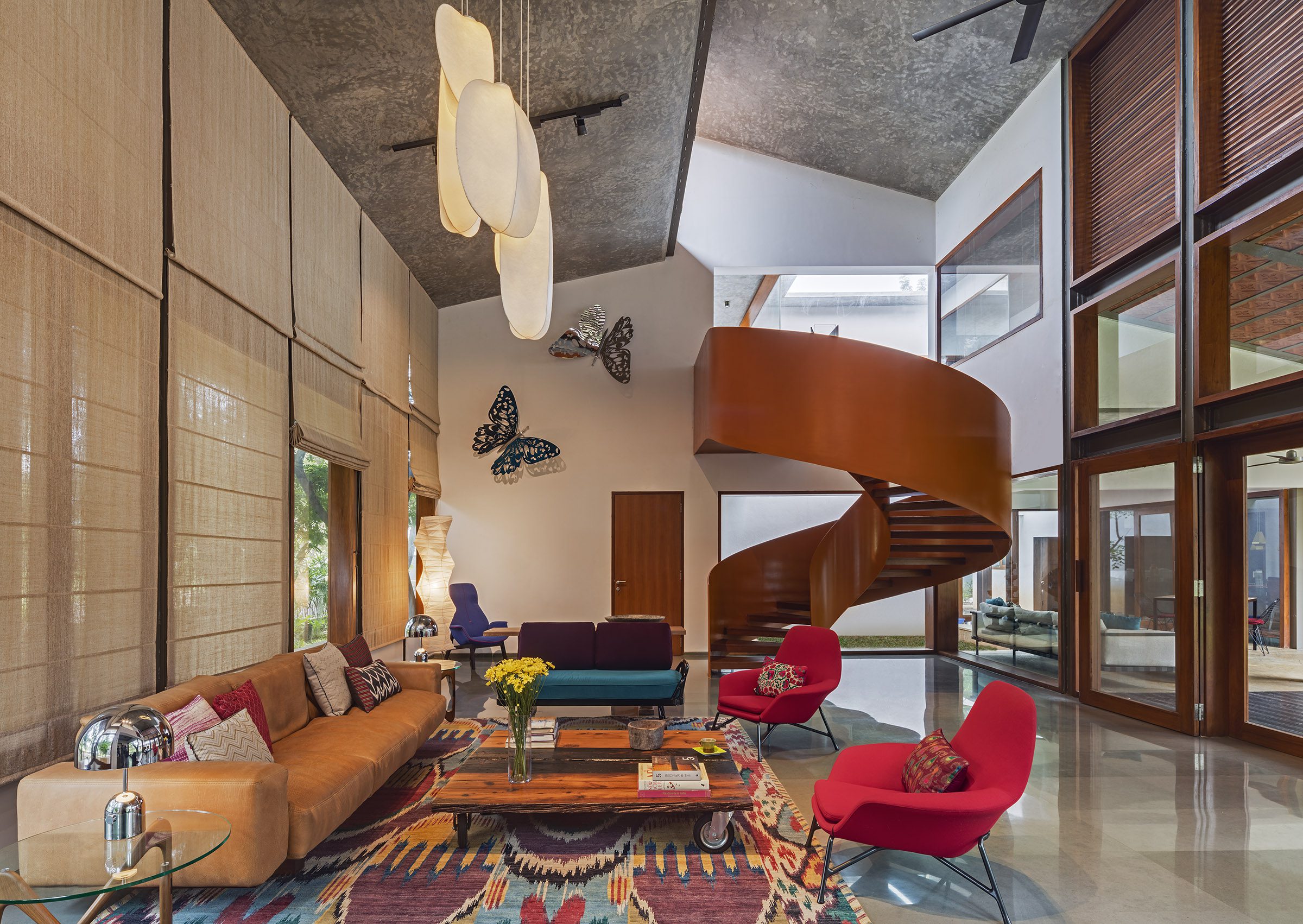 The central feature of the living space is a burnt orange spiral staircase sculpted out of a shell of mild steel and housing timber treads. The Large expanses of grey Kota are contrasted with a bright color palette of turquoise, violet, red and mustard. The bold Ikat patterned carpet provides a vibrant base on which pieces by Moroso, Minotti, Riva and Poliform sit alongside other furniture designed by Khosla Associates. The central cluster of Mori fabric pendant lamps were sourced from New York based design house Rich Brilliant Willing, complemented by other light fixtures by Tom Dixon and Isamu Noguchi. The butterfly sculpture on the wall is Sunil Gawde’s ‘Secret Garden’ and other paintings are by young Bangalore based contemporary artists Shivkumar and Suresh Kumar.