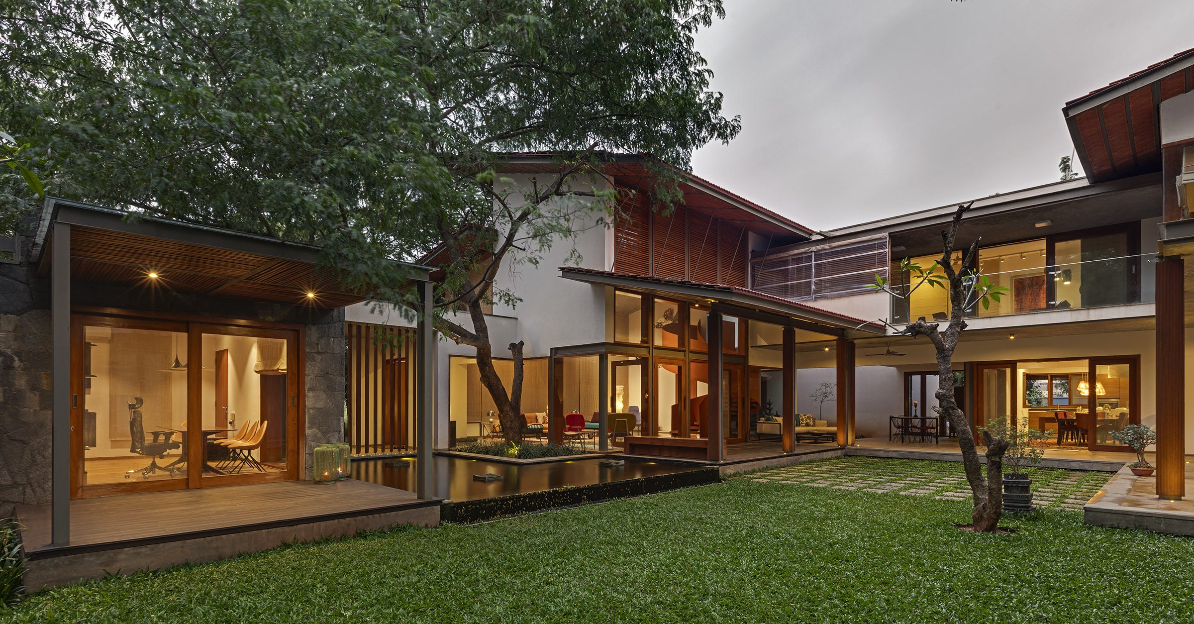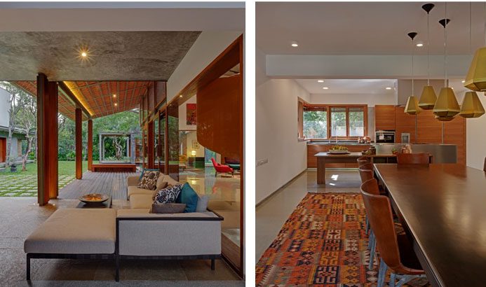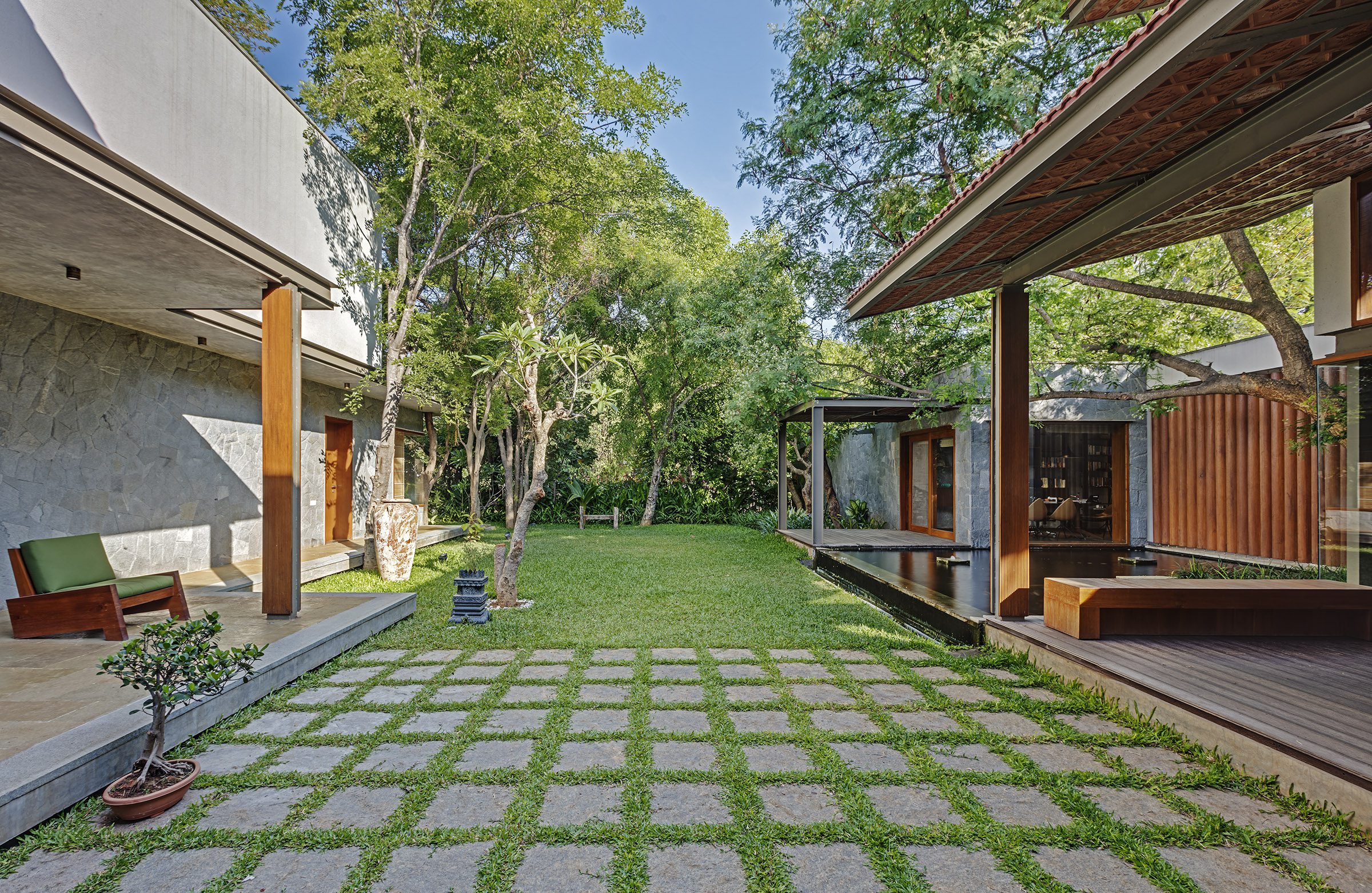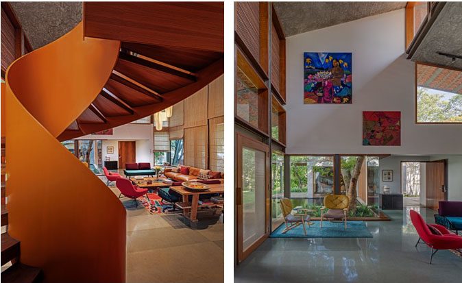 We were driven to create a contextually sensitive and sustainable design by maximizing local materials, using clay tiled roofs to keep the house cool, large overhangs to protect against sun and rain, and cross ventilation to keep the house breathing at all times. As firmly as our clients were rooted to their traditions , they were also global travellers equally open to an eclectic design aesthetic that is reflected in the house interiors.