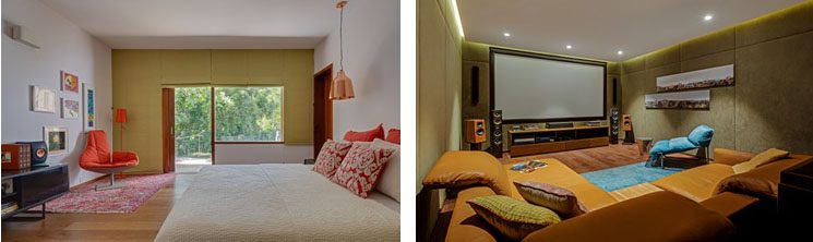 The spatial flow takes into consideration the family’s requirement of segregating public and private space. The ground floor has living, study, dining, puja, home theatre, 2 kitchens, and 2 guest rooms while the upper level has 3 bedrooms, a yoga and meditation space and a family room.