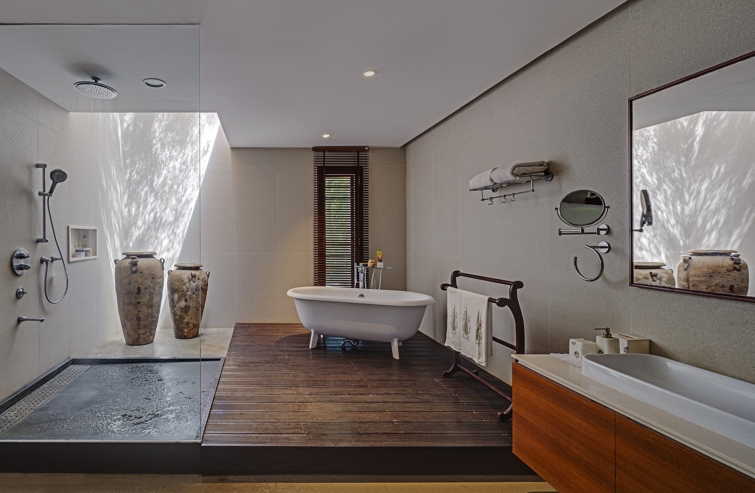 An architecture of sloped Mangalore tiled roofs and rough-cut Shira stone cladding contrasts with floors of rough and polished Kota and joinery of teak.