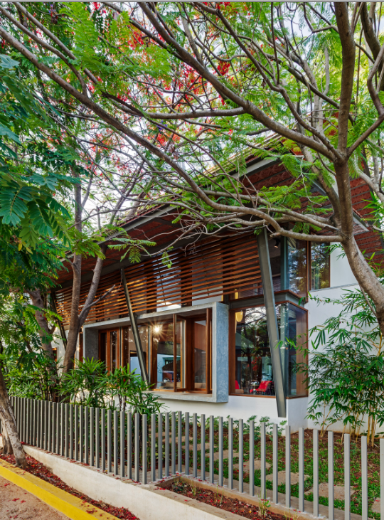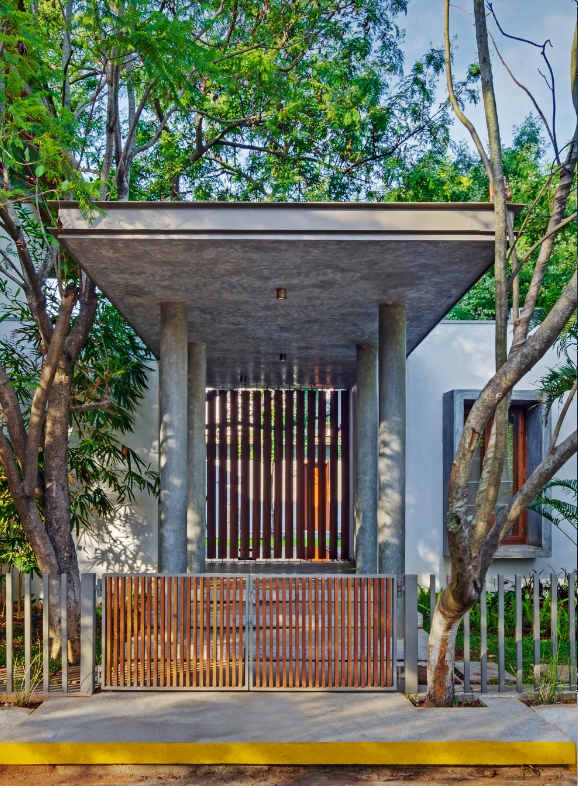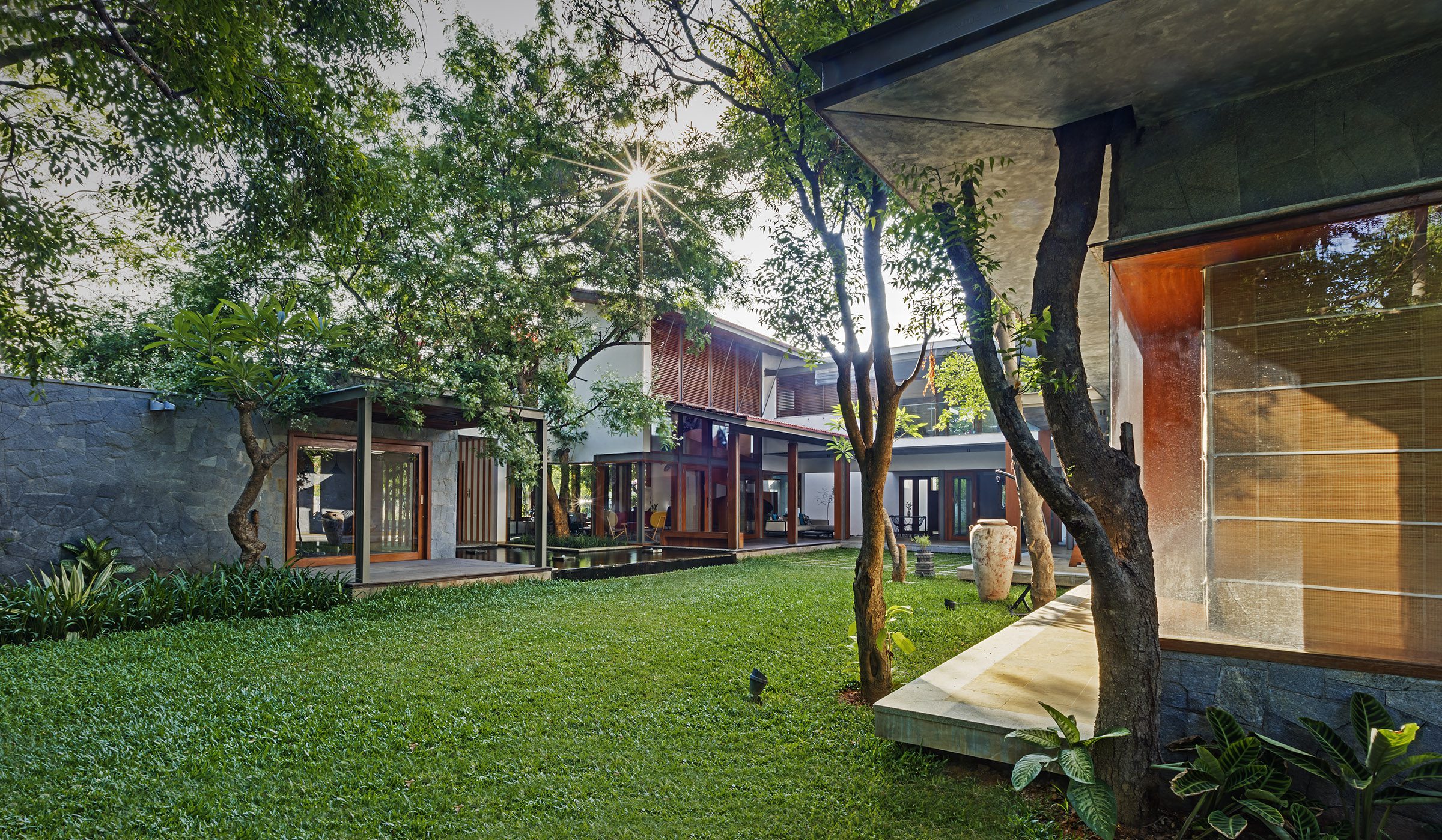 The 16,000 sft site of the Krishnan house had several existing trees and we envisioned a relatively low-slung architectural expression that would be interpretive of a vernacular aesthetic, while accommodating its green surroundings.