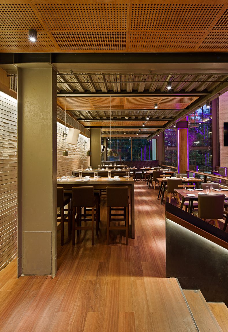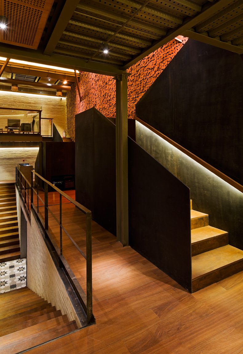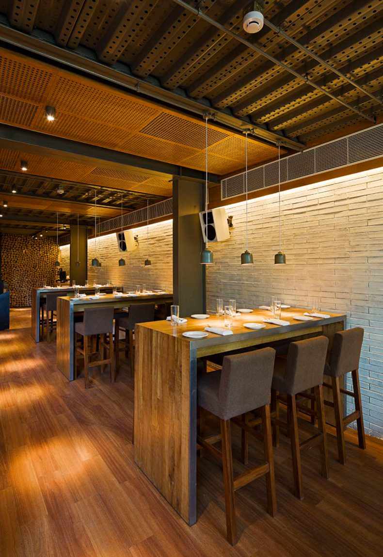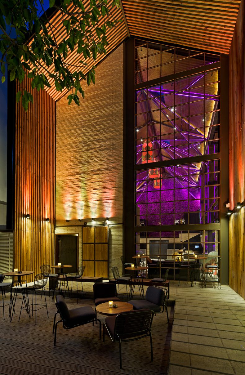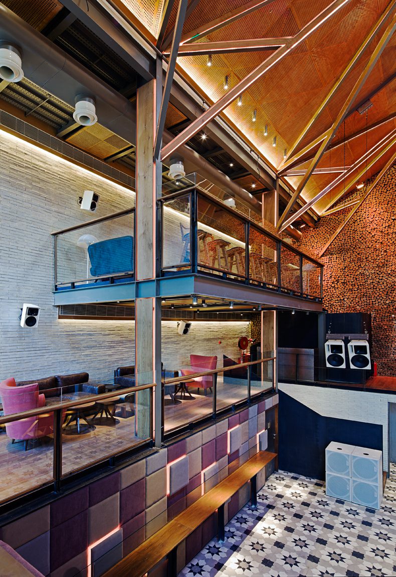 The roof at 38 ft. high envelopes a space that is articulated with a bar and dance floor on the ground floor and lounge and restaurant spaces on the successive two levels flanking either side of a dramatic atrium, looking down on the busy dance floor. The rear stage wall is clad entirely with rustic wooden logs stacked one atop the other, referencing the firewood stacked in barns.