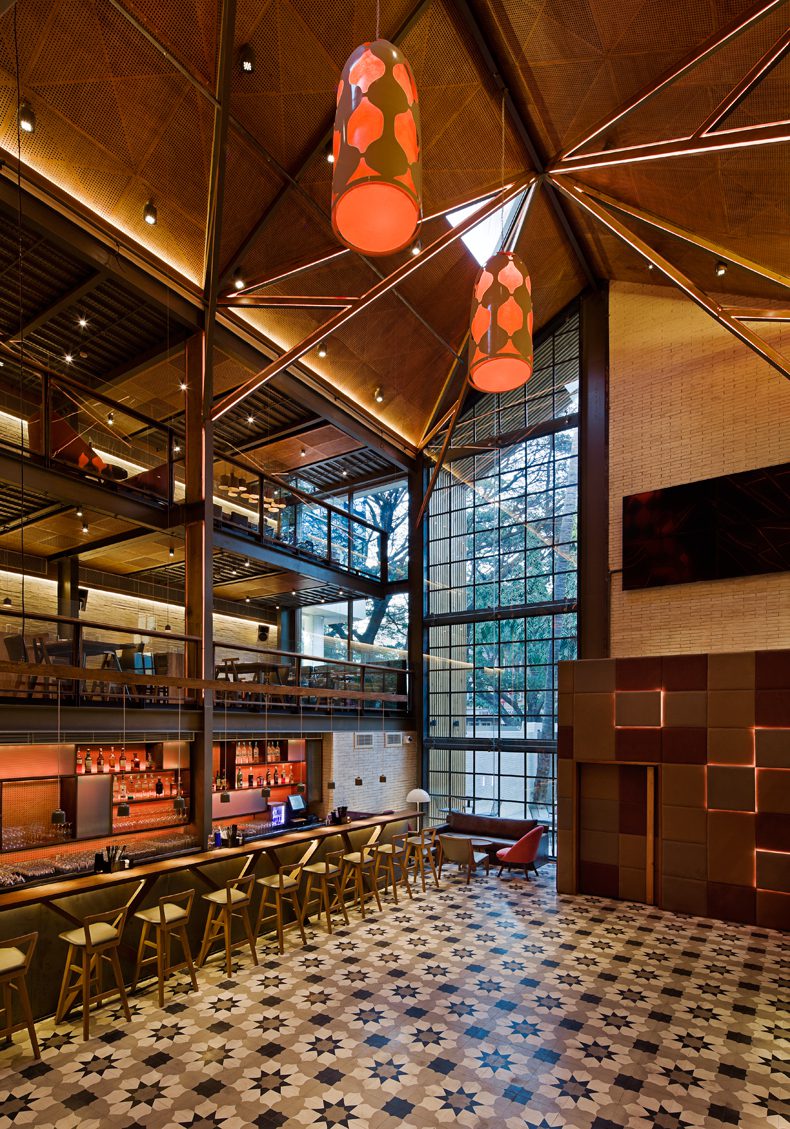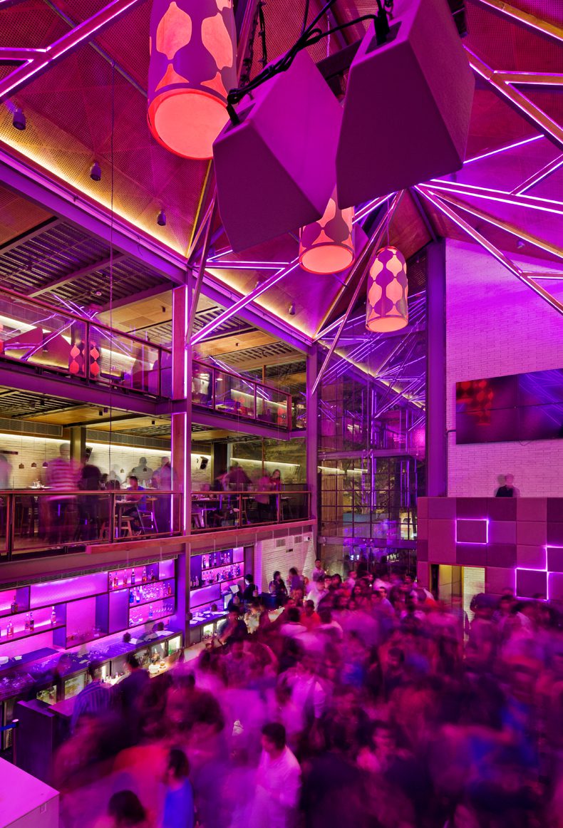 The dramatic interior volume steps out into a calm and intimate open-to-sky courtyard with its own bar and seating, for those seeking respite from the internal audio levels.