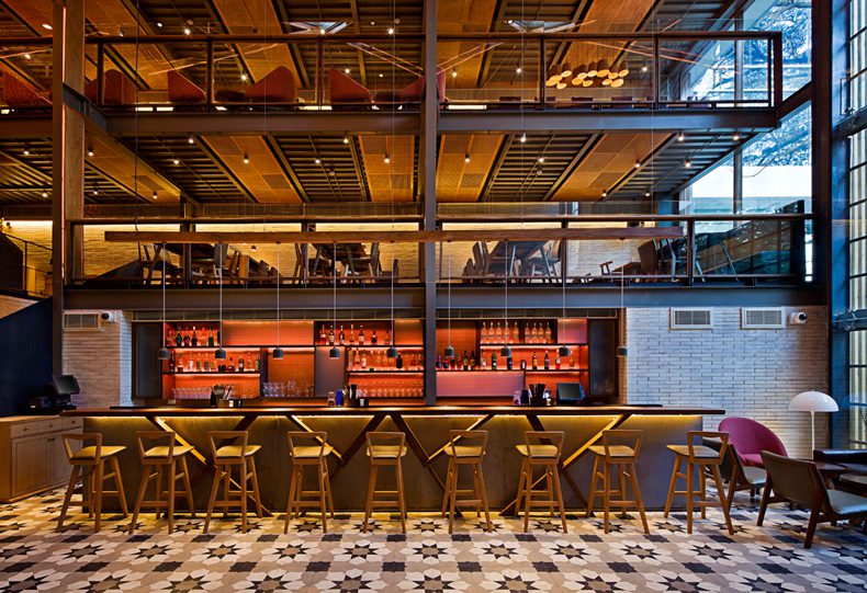 The furniture design, light fixtures, and other details are an eclectic mix intended for casual dining as well as lounging.