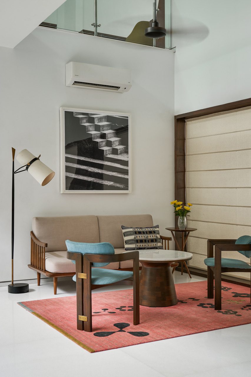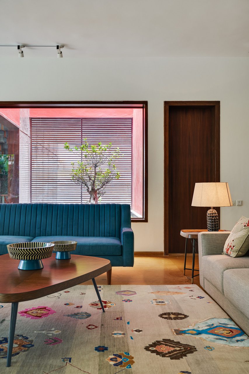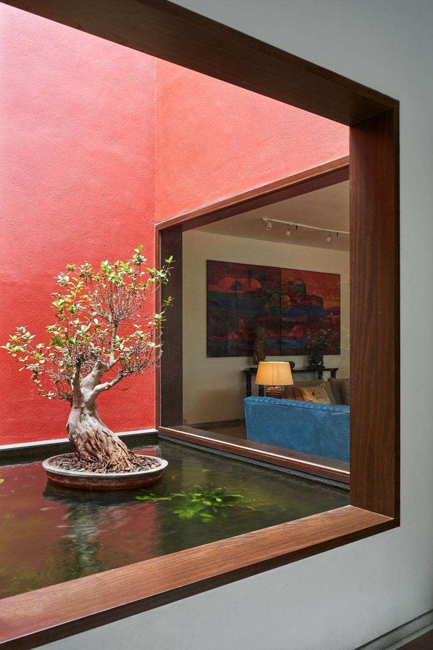 The other aspect of client brief that resonated with us was the homeowner’s penchant for keeping pet fish. What started off as discussions around having an aquarium integrated into the living spaces, evolved into a gentle design response of having a skylit fishpond with a sculptural Ficus Bonsai sitting atop it.