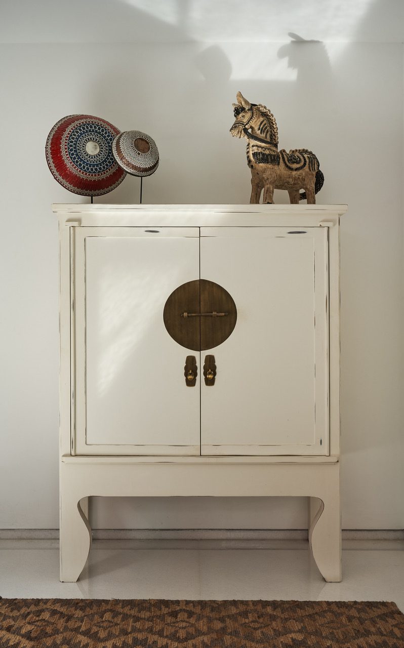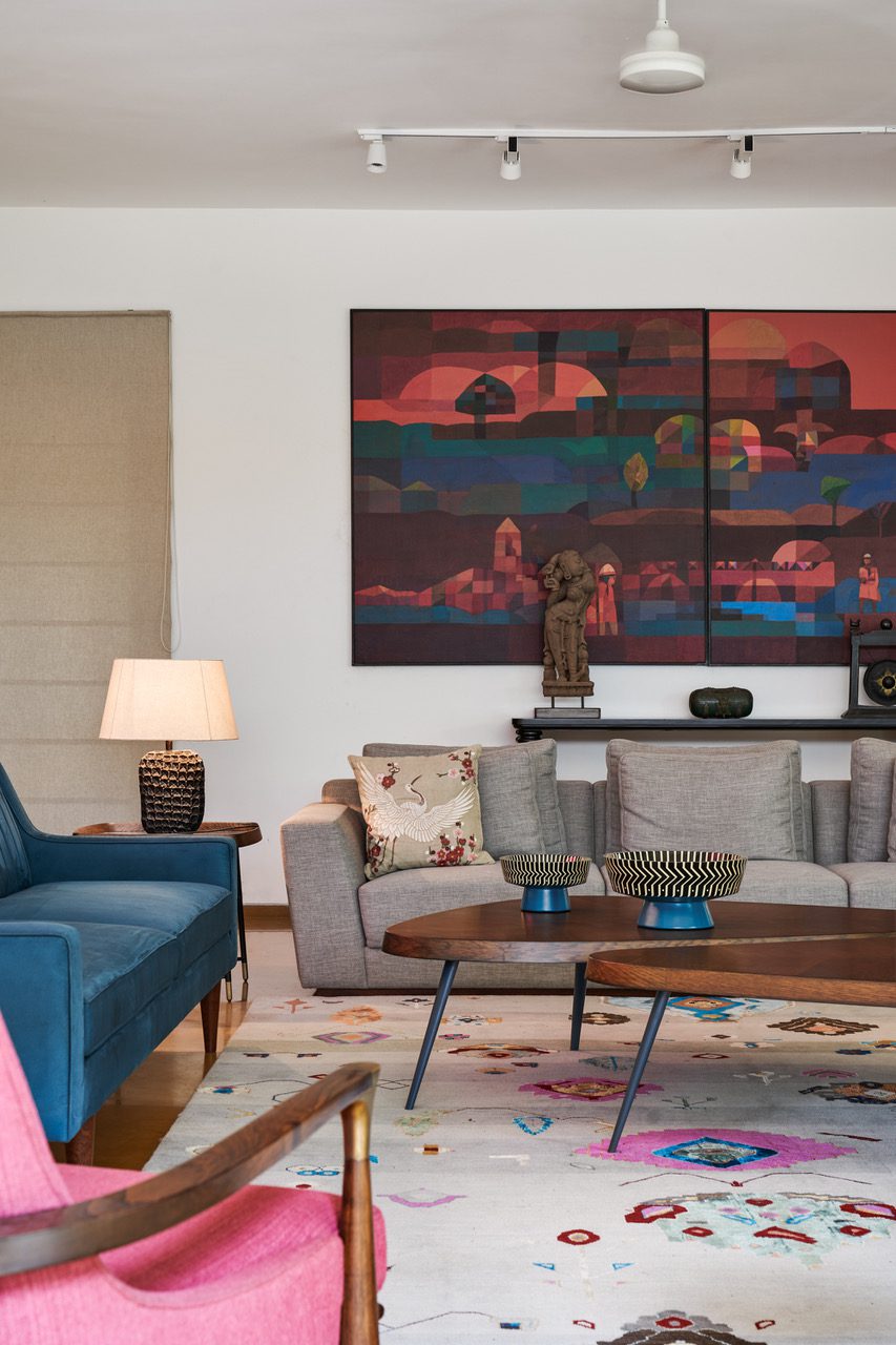 The white marble flooring in the foyer leads to a deep yellow Jaisalmer sandstone in the formal living and bar. Vibrant elements such as the artwork, a custom artisan hand knotted carpet, lacquered fruit bowls, and textured metal table lamps from find home in the warmth of this space. A window visually connects the living area back to the bonsai and skylit water feature.
