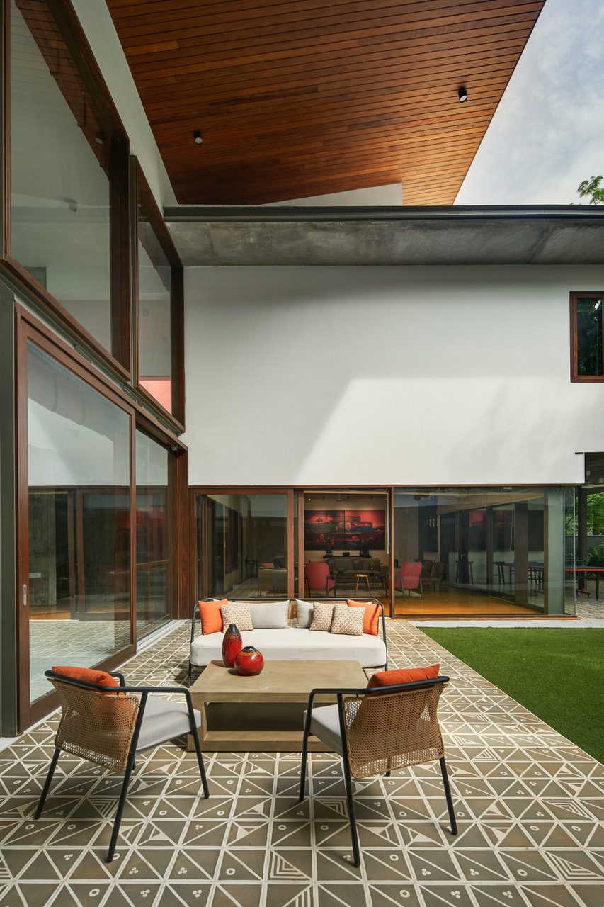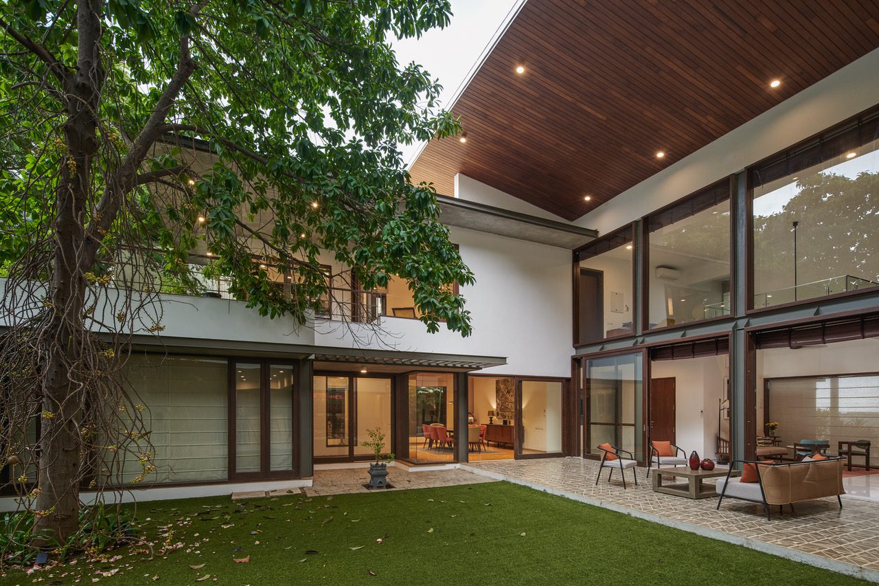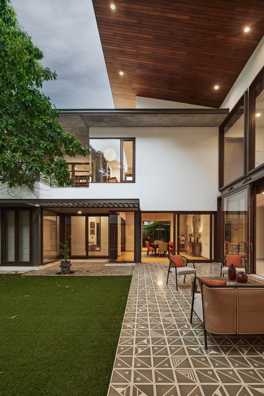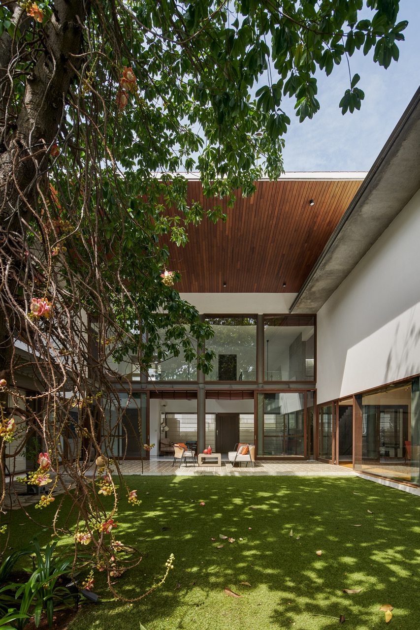 ‘Nagalingam Veedu’ responds to the cultural and religious needs of its owners while remaining climate sensitive to Chennai’s extreme monsoons and summers. The north garden provides respite, and the extent of glazing on this side is protected by the large timber clad overhang of the angular roof. The morning light is soft and the space is additionally shaded by the omnipresent tree, keeping it relatively cool.
