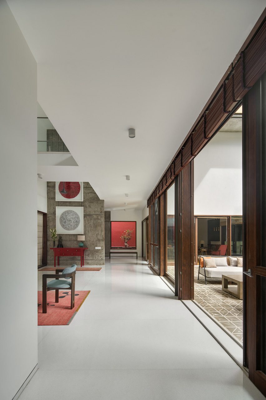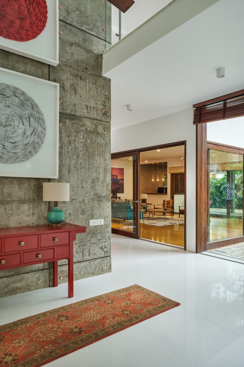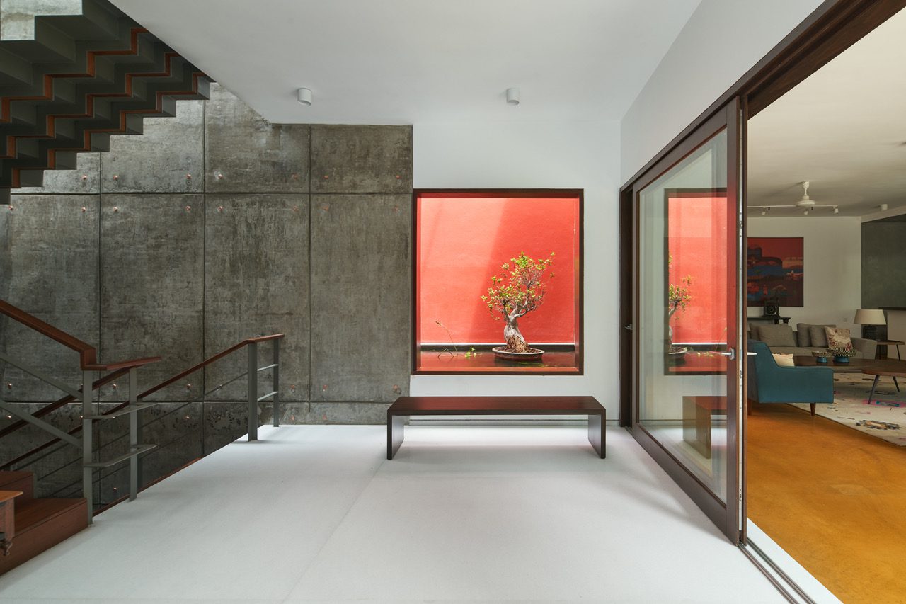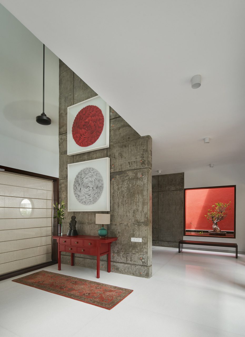 The spatial layout of the house gives importance on both levels to the private north-east garden and there is a transparency to it from both levels. The discreet entrance to the southwest makes way into a dramatic double height entrance foyer. The foyer has a cinematic quality to it with walls in distressed cast concrete and a floor in a seamless white marble. A long vista leading south to north culminates in a square cutout framing the water feature with its striking red backdrop. Two folded paper artworks depicting the ‘circle of life’ on the double height concrete wall complete the visual composition.