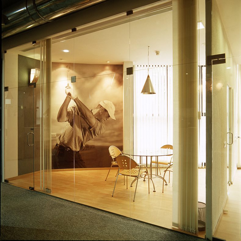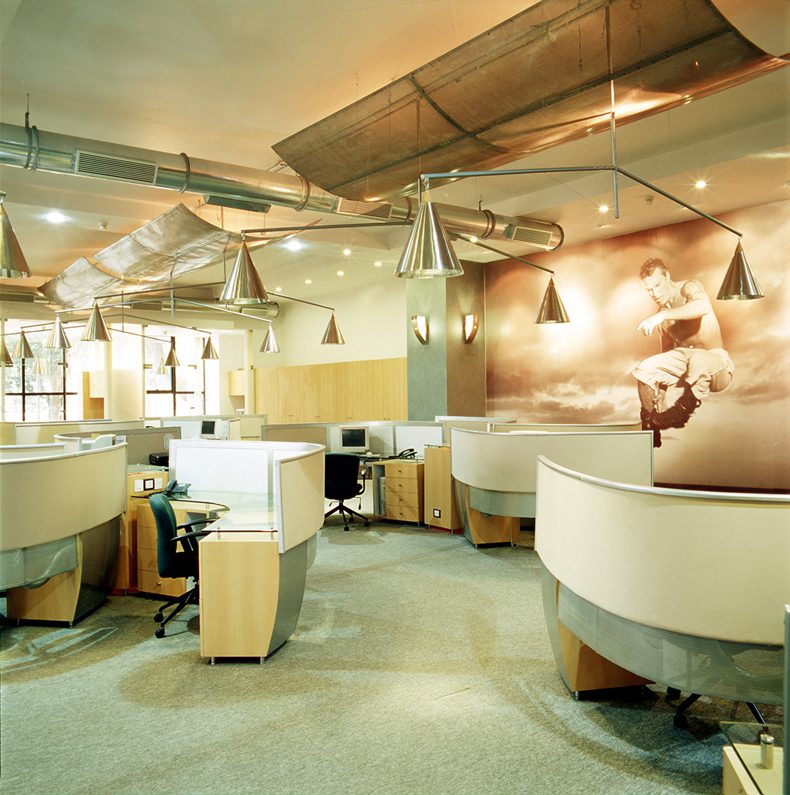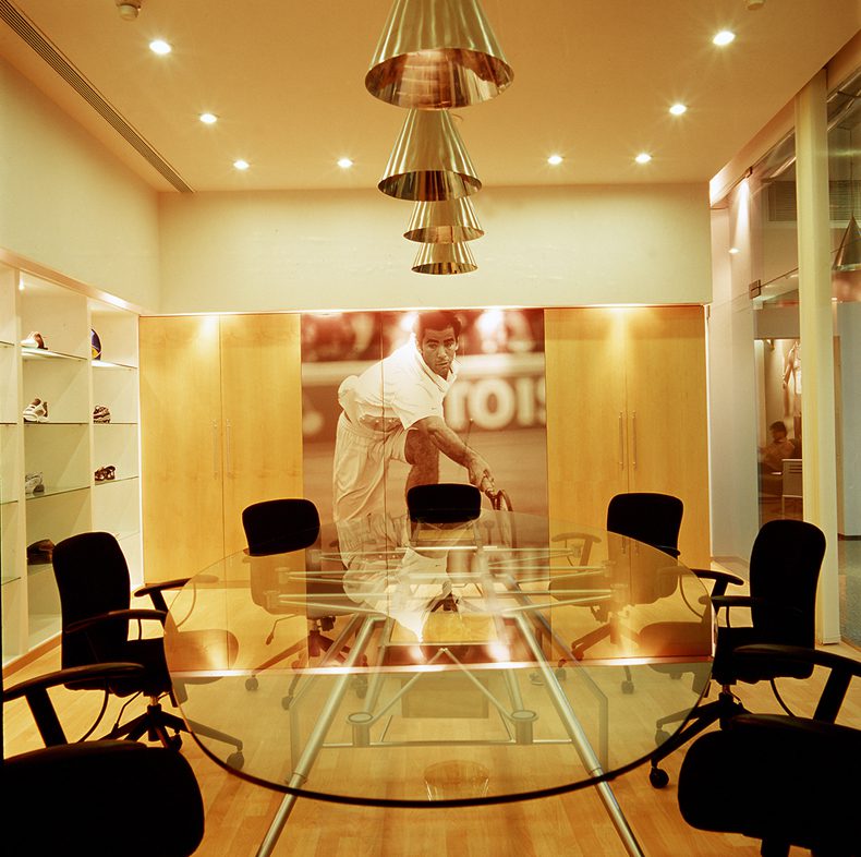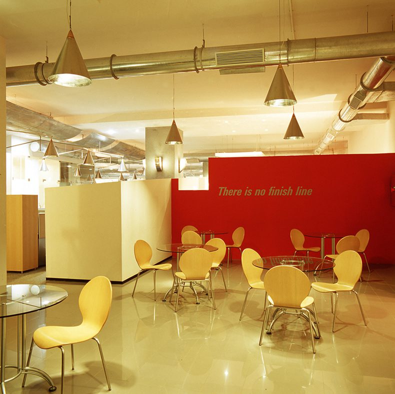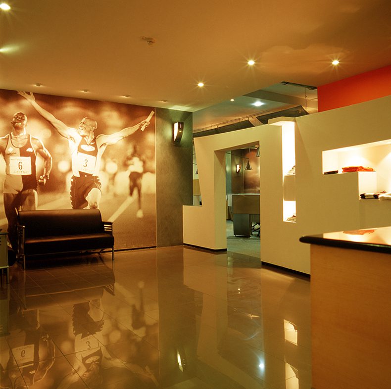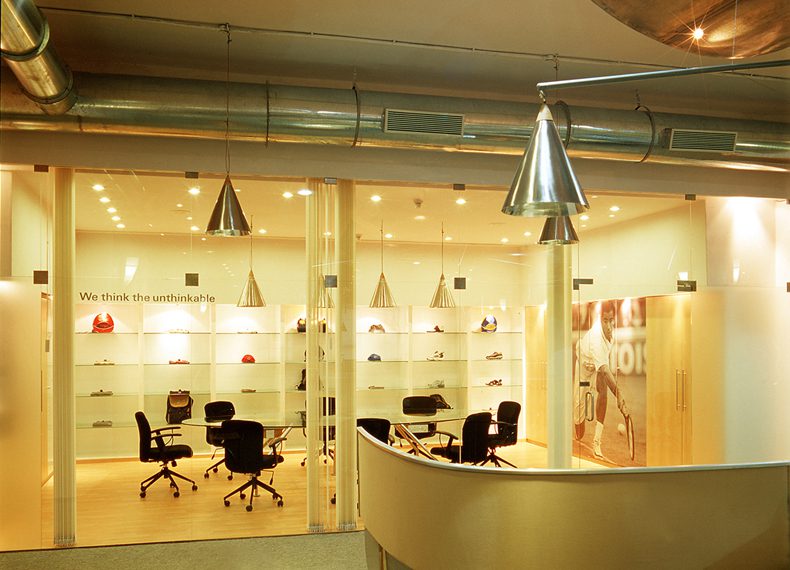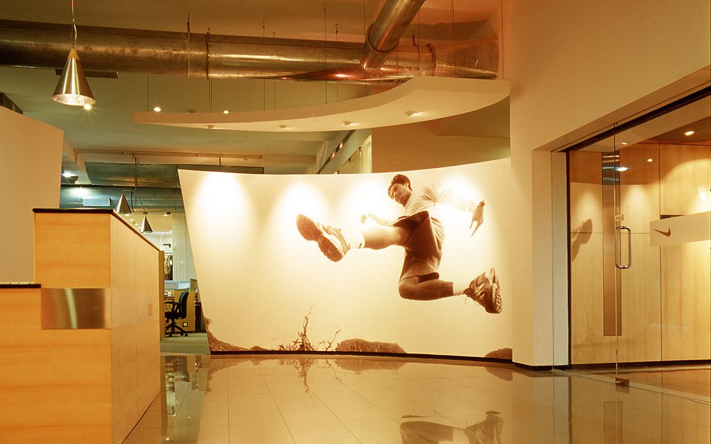 The shape of the walls, dividers, and the workstations suggest action, visual flow and dynamic movement. Coupled with the monotone images of famous athletes who have endorsed the Nike brand, they suggest forms frozen in mid-action.