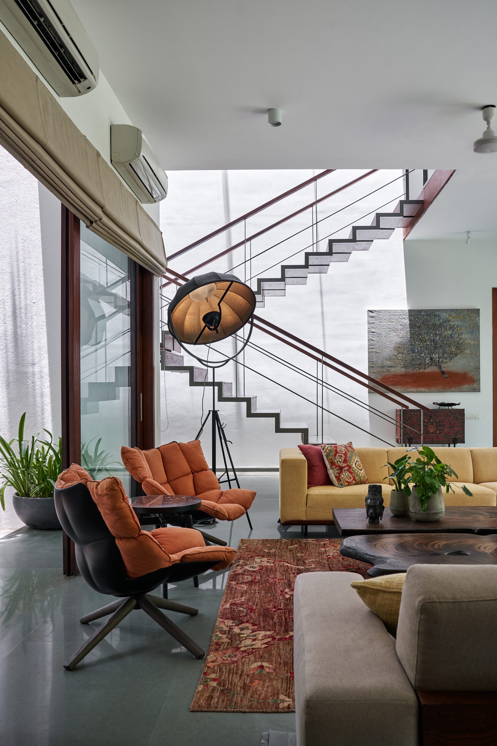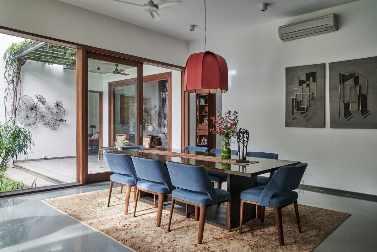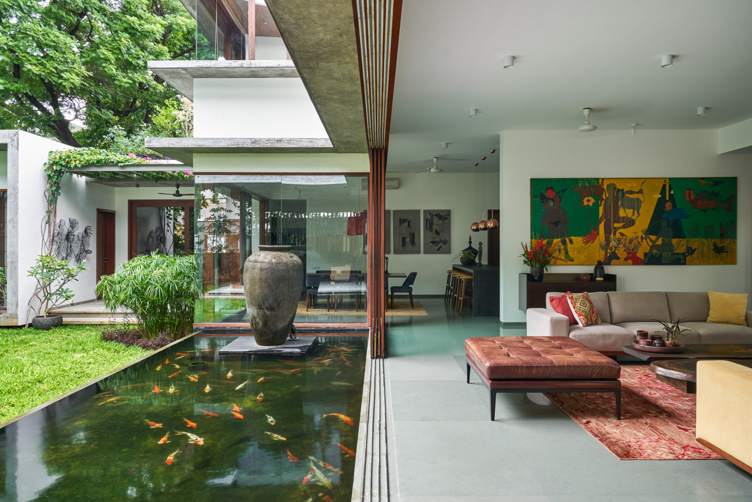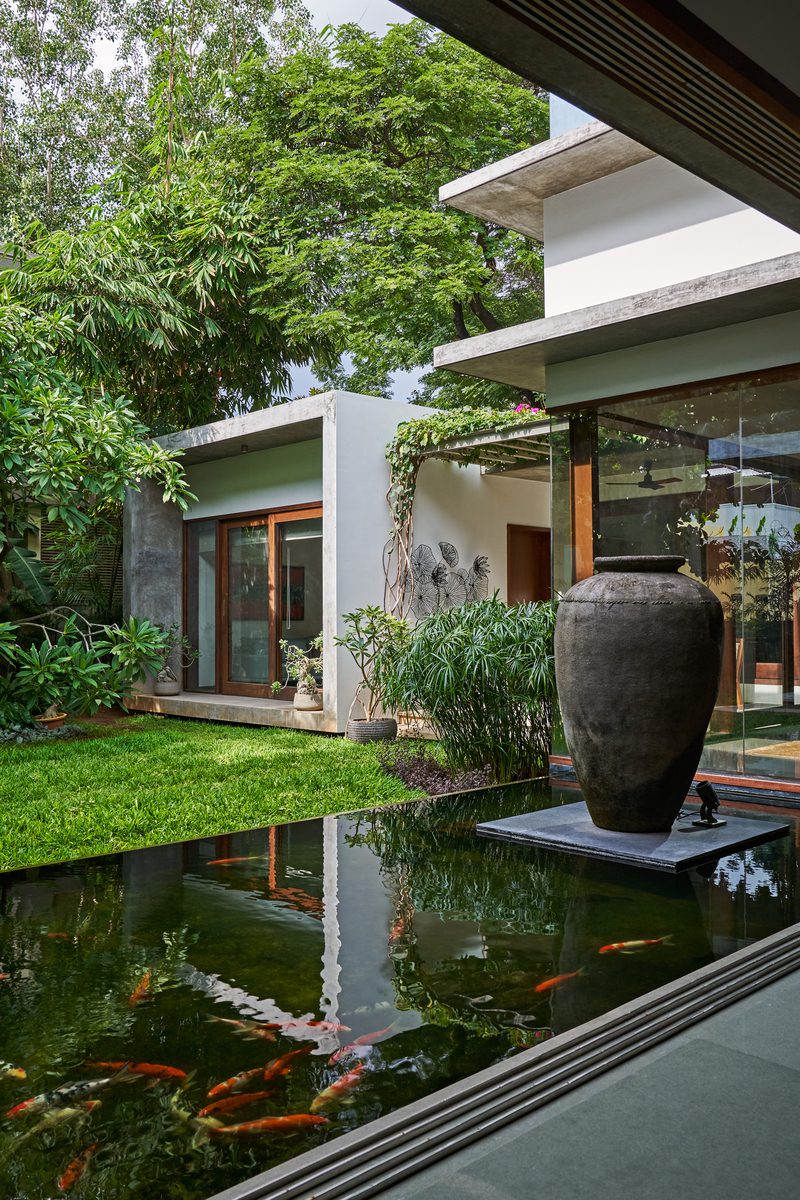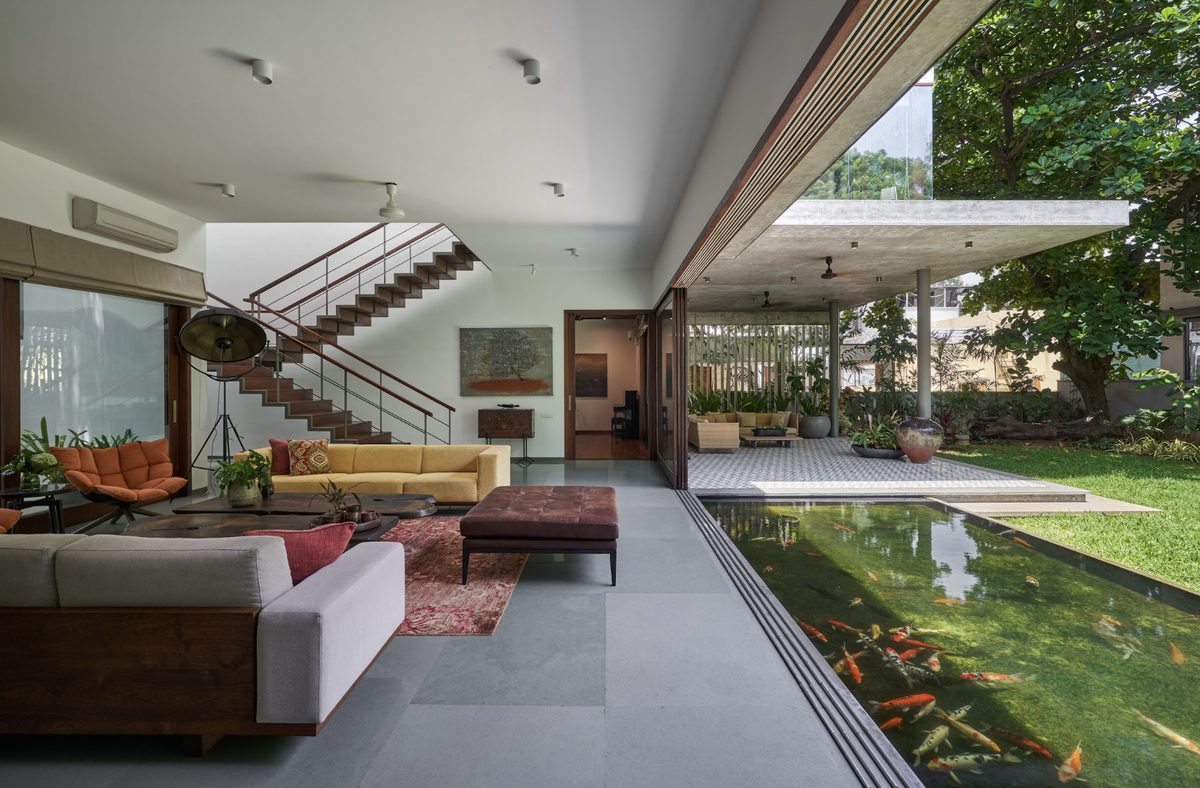 A series of 4 sliding doors gather at one end revealing the Koi Pond and garden and dissolving the threshold between interior living space and the outdoors. The strategic orientation also promotes cross-ventilation and breezes from south to north, keeping the living area cool in the intense Chennai summers.
