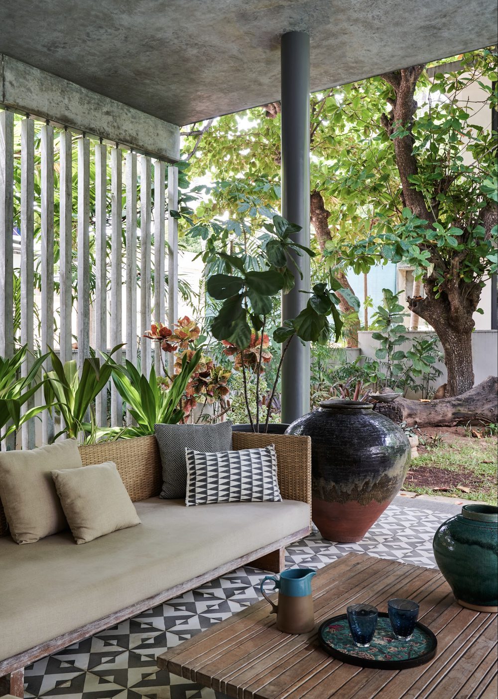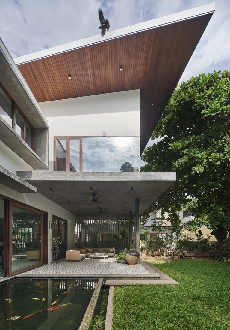 The L shaped plan of the house has a strong North-South axis with the living area assuming a central pavilion like location with views of nature on both sides. The south opening of the living area frames the giant Raintree while its north opens completely to a linear Koi pond and garden.