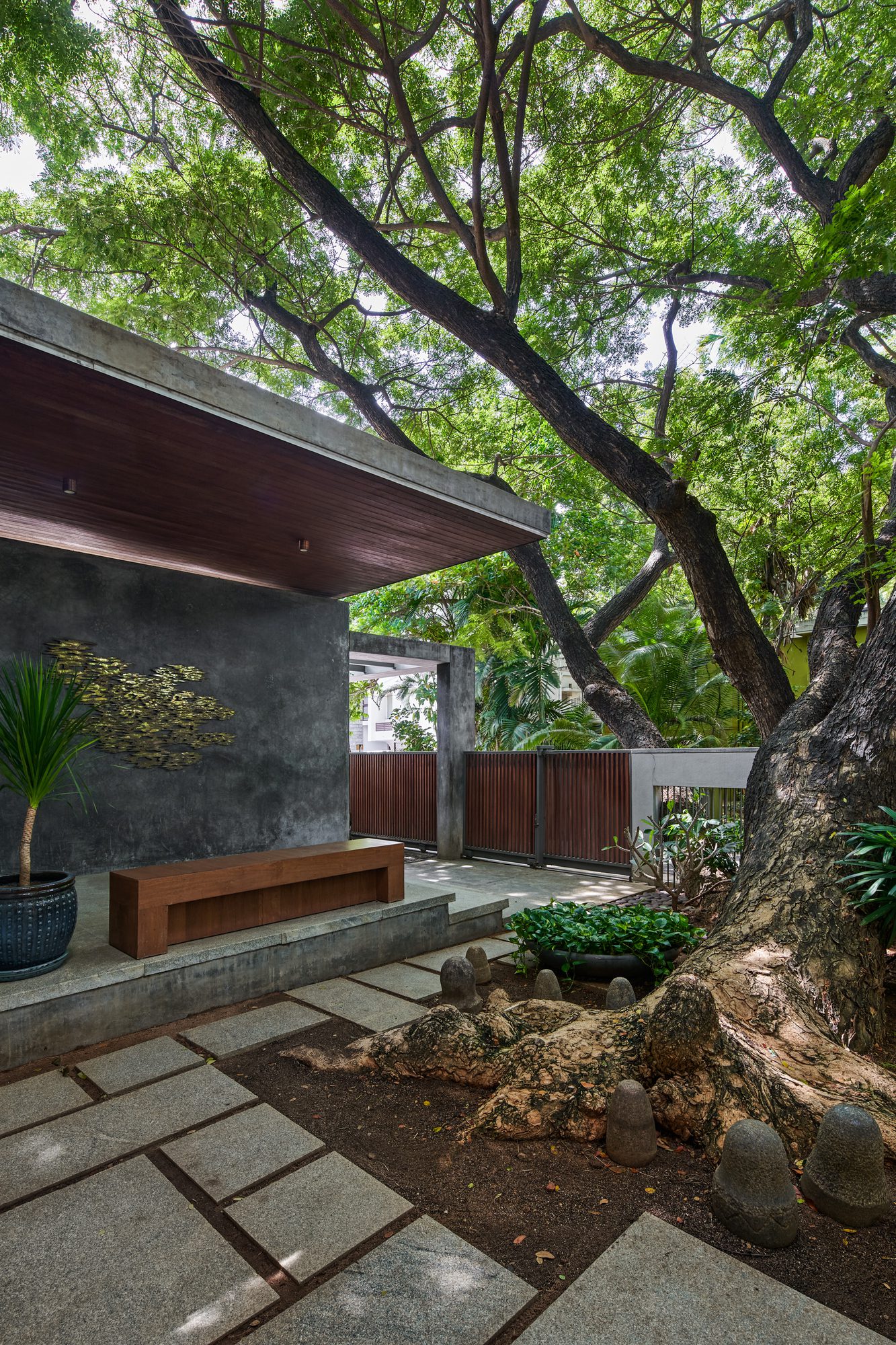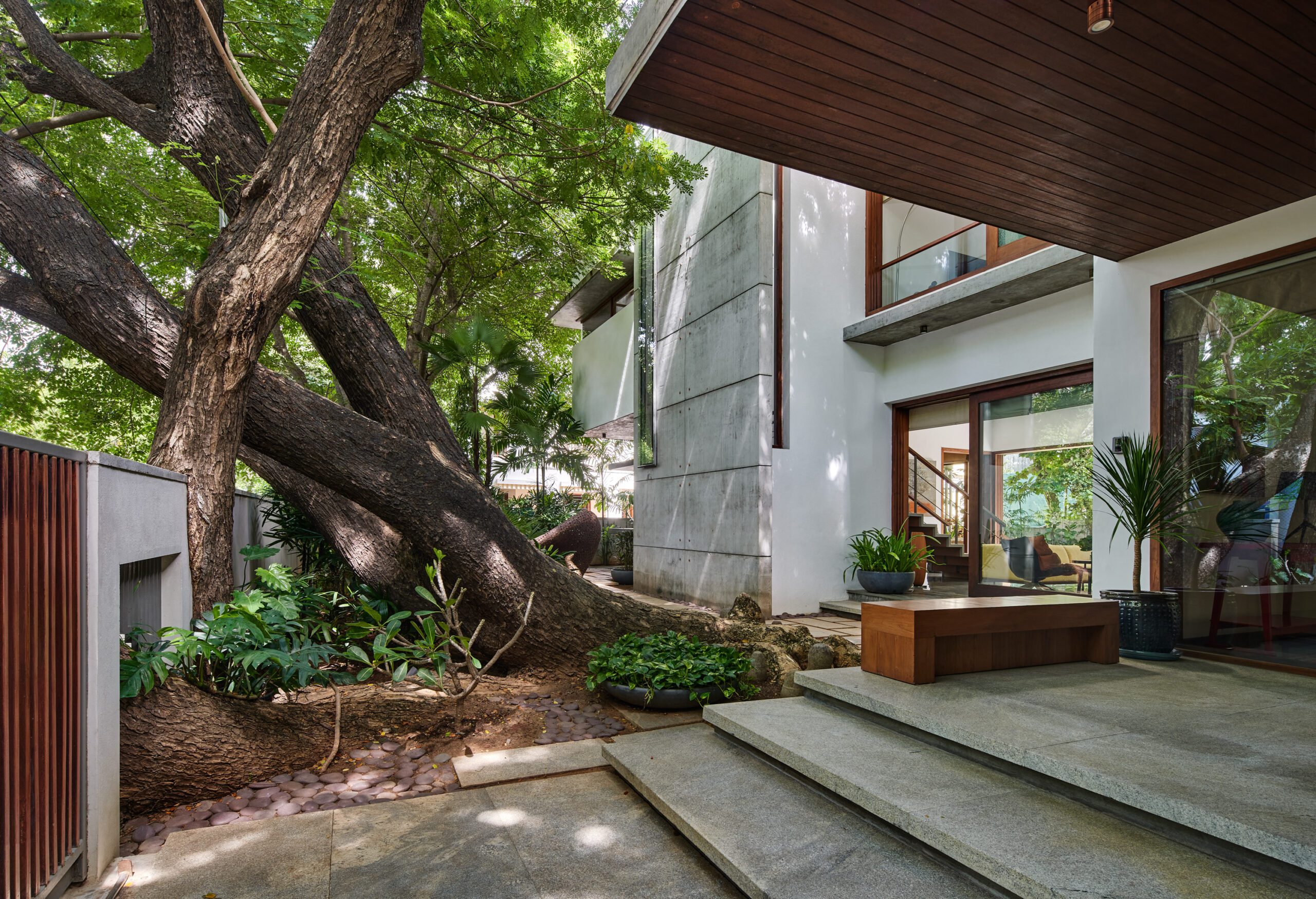 On the southern periphery of the site stood a magnificent and ancient Raintree that influenced the spatial layout of this 4 bedroom house in Chennai. The tree with its sculptural roots straddling the compound wall defines the entrance court of the home and influences its imprint and location on the site.