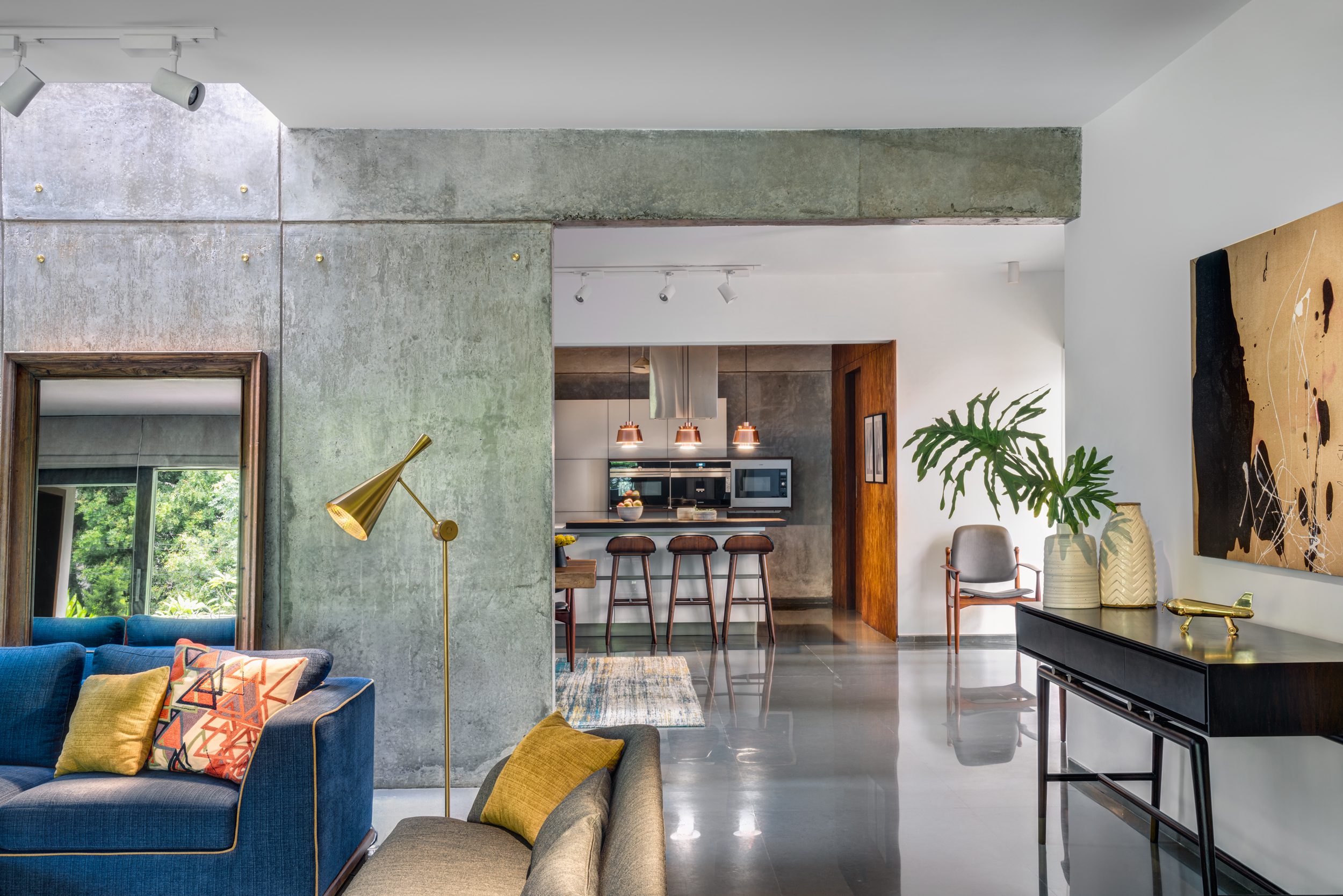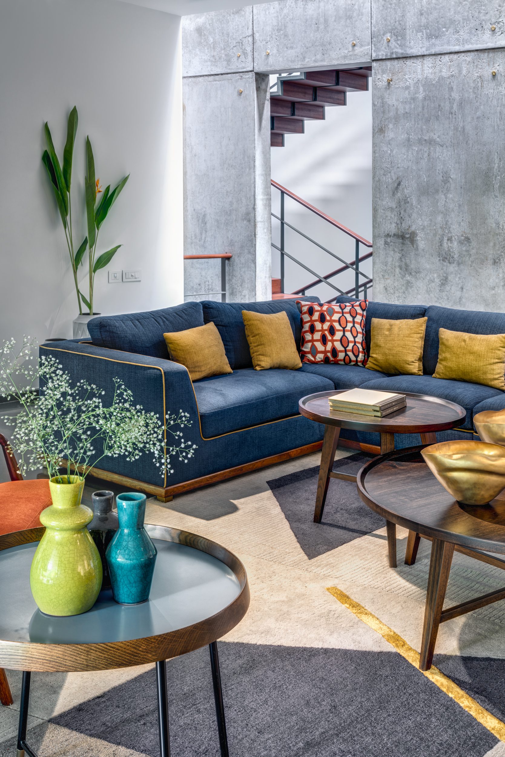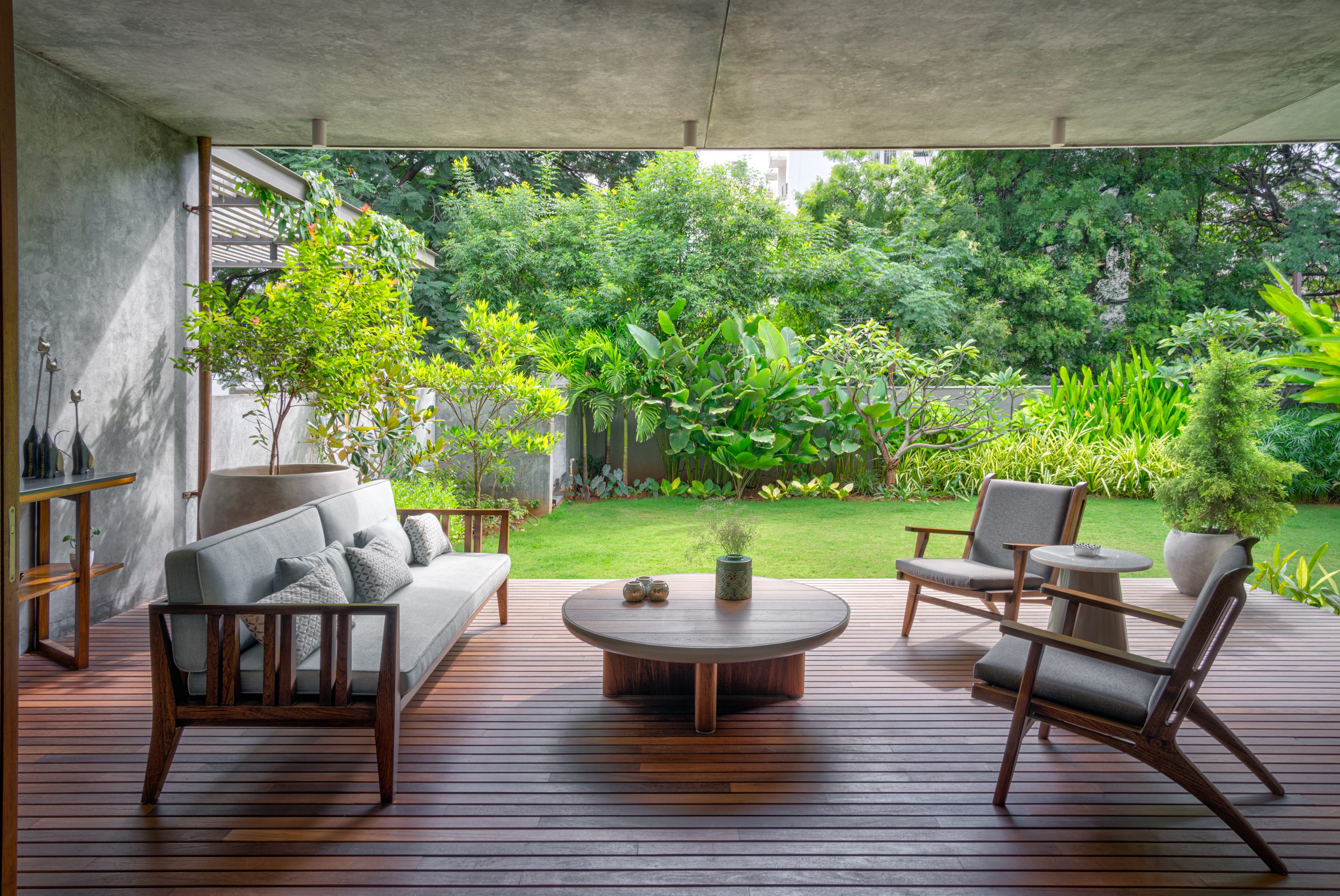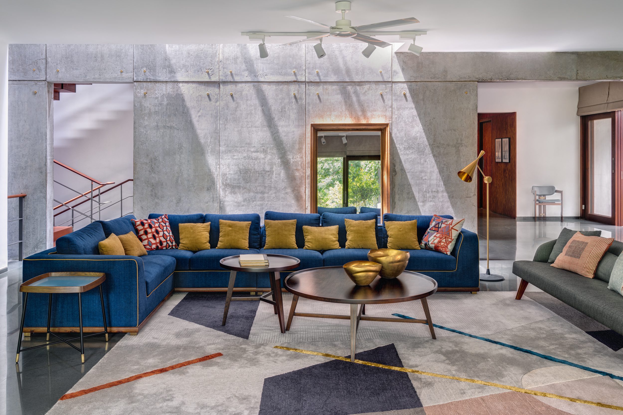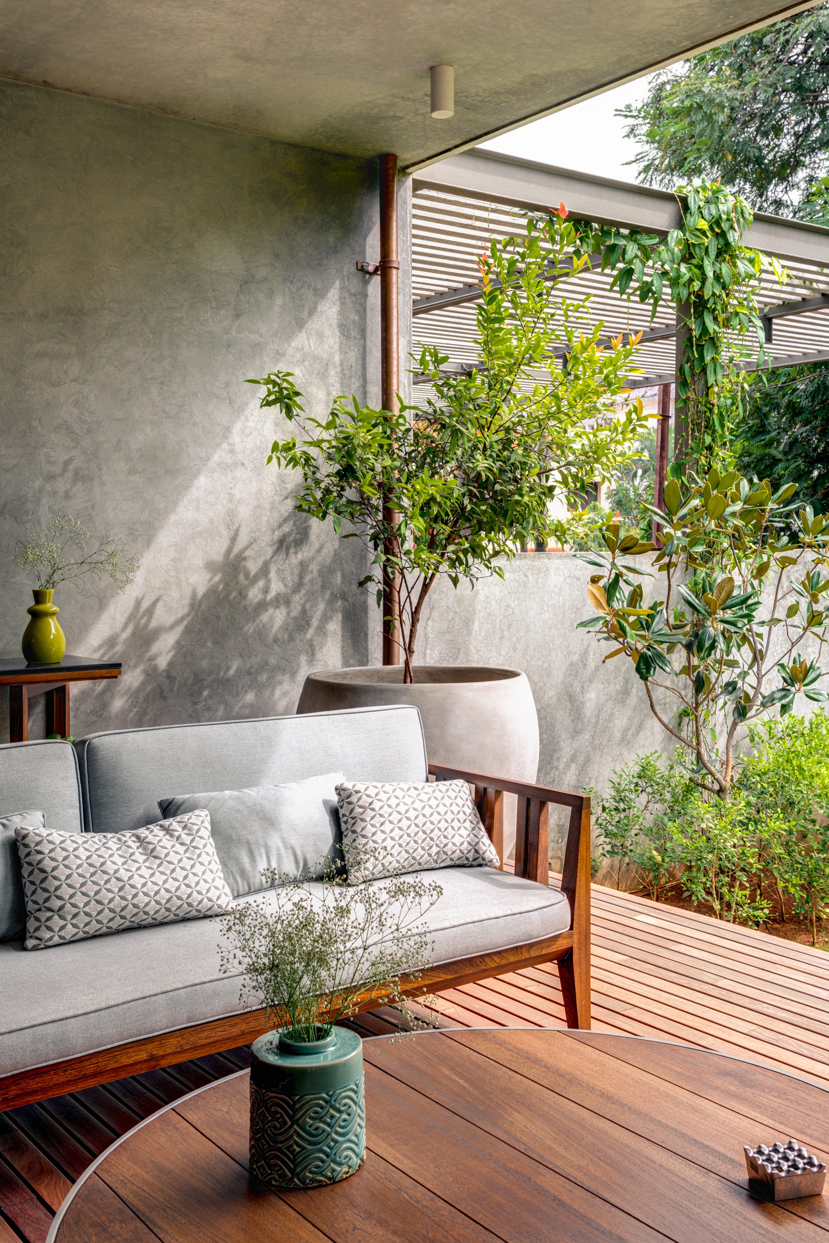 The lofty entrance pergola made of pre-cast concrete members acts as a shading device from the strong Coimbatore sun. The materiality of the house is a muted mix of grey kota stone floors, timber clad ceilings and polished cement and cast concrete surfaces. These are juxtaposed with strong tropical colours in the textiles like a neel blue, fuchsia pink and deep ochre.