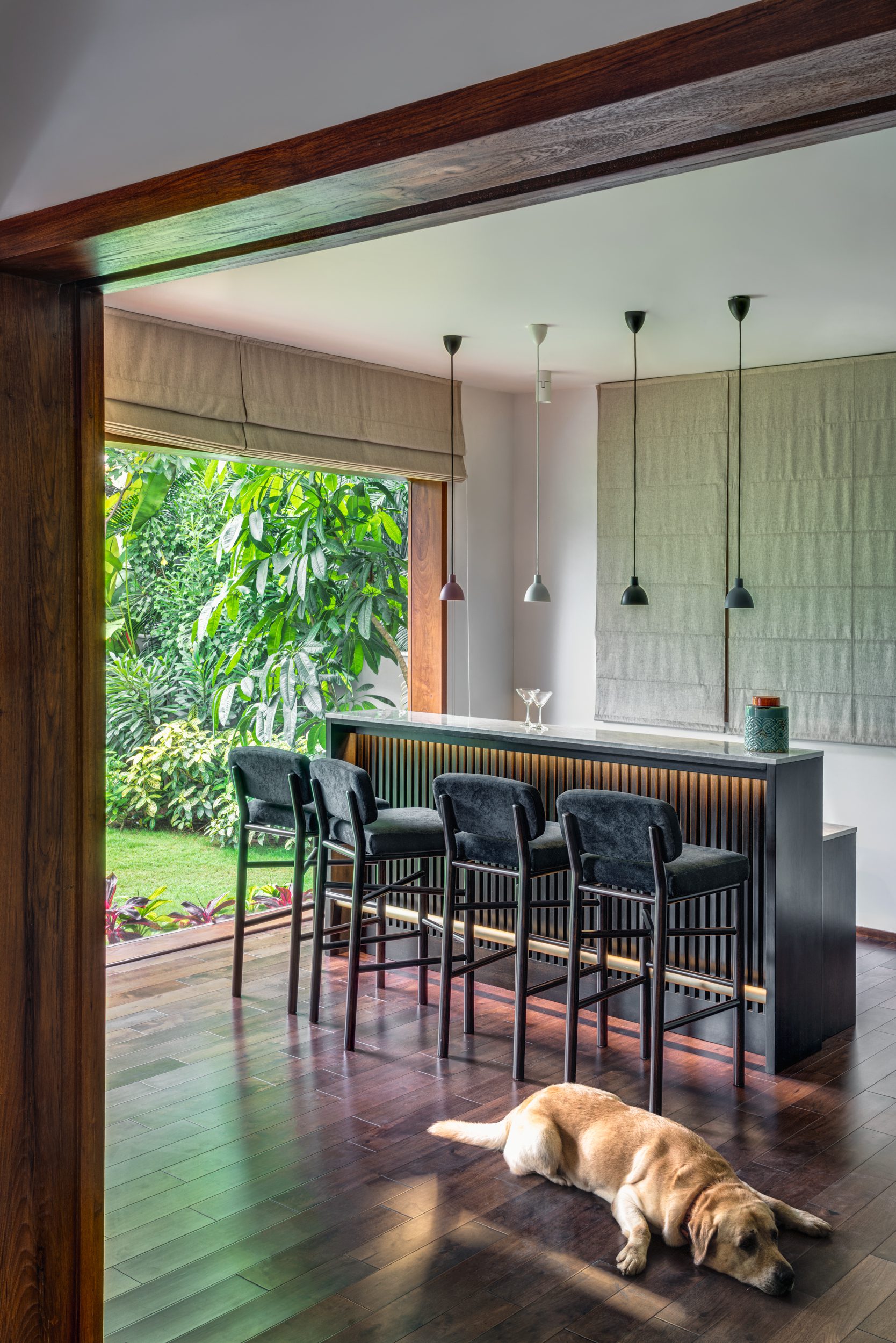 The spatial arrangement on the ground floor allows for free visual movement between living and dining areas and a constant connect to the outdoors. The living room and bar areas open eastward into a wooden decked verandah and a verdant tropical garden. The dining room and open kitchen step out northwards into an intimate outdoor court with fixed seating around a tree.