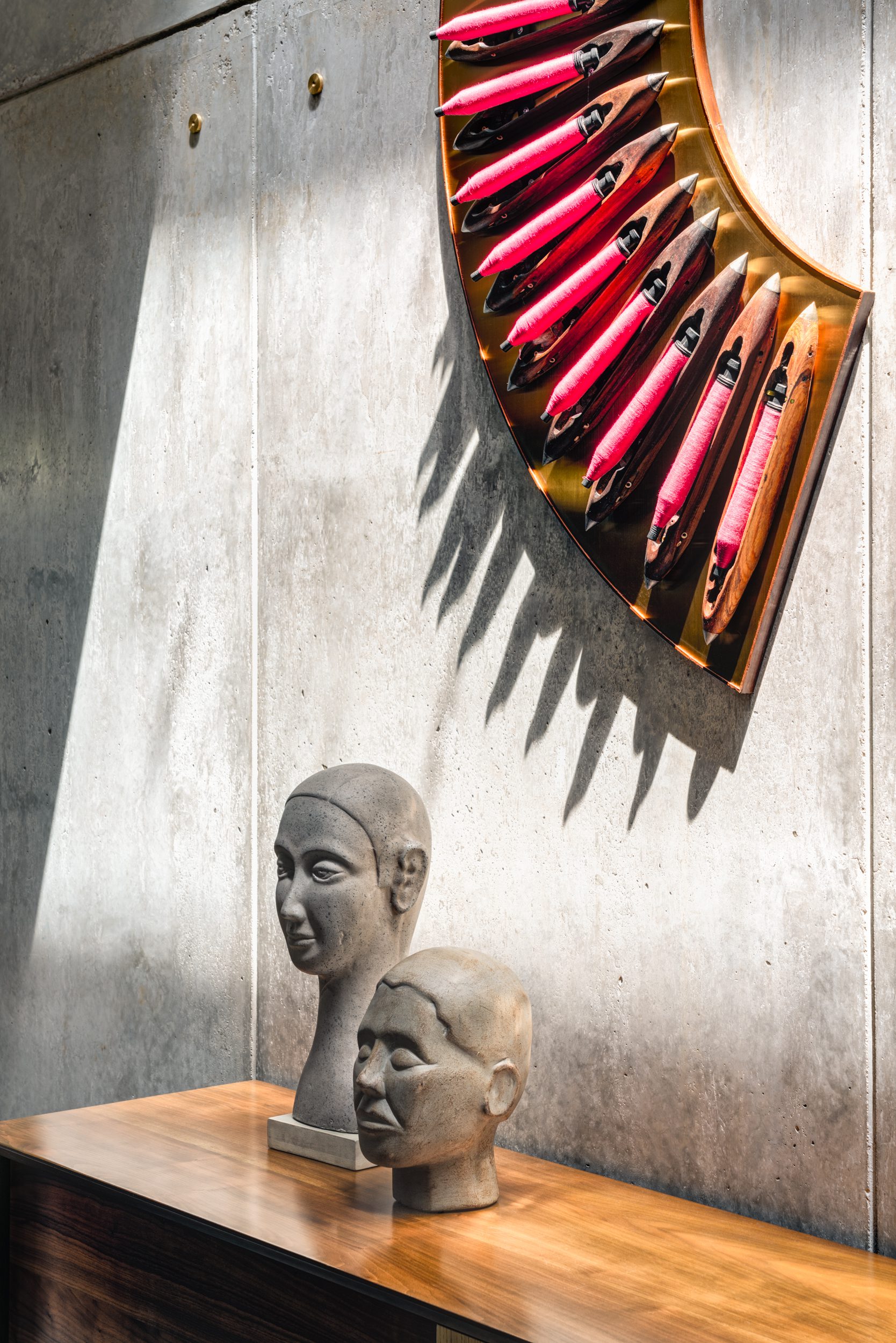 In order to create a layer of meaning and context for our clients, we created a large art installation out of 109 wooden shuttles used in handloom weaving. In a sweeping and sinuous gesture, the artwork climbs up the dining face of the concrete wall and can be viewed from differing vantage points on both levels. The multiple shuttles were mounted on a brushed brass base and strung with a vibrant fuschia coloured thread. The artwork assumes a further dimensionality as the shuttles rise and dip with fluidity in a wave like flow.