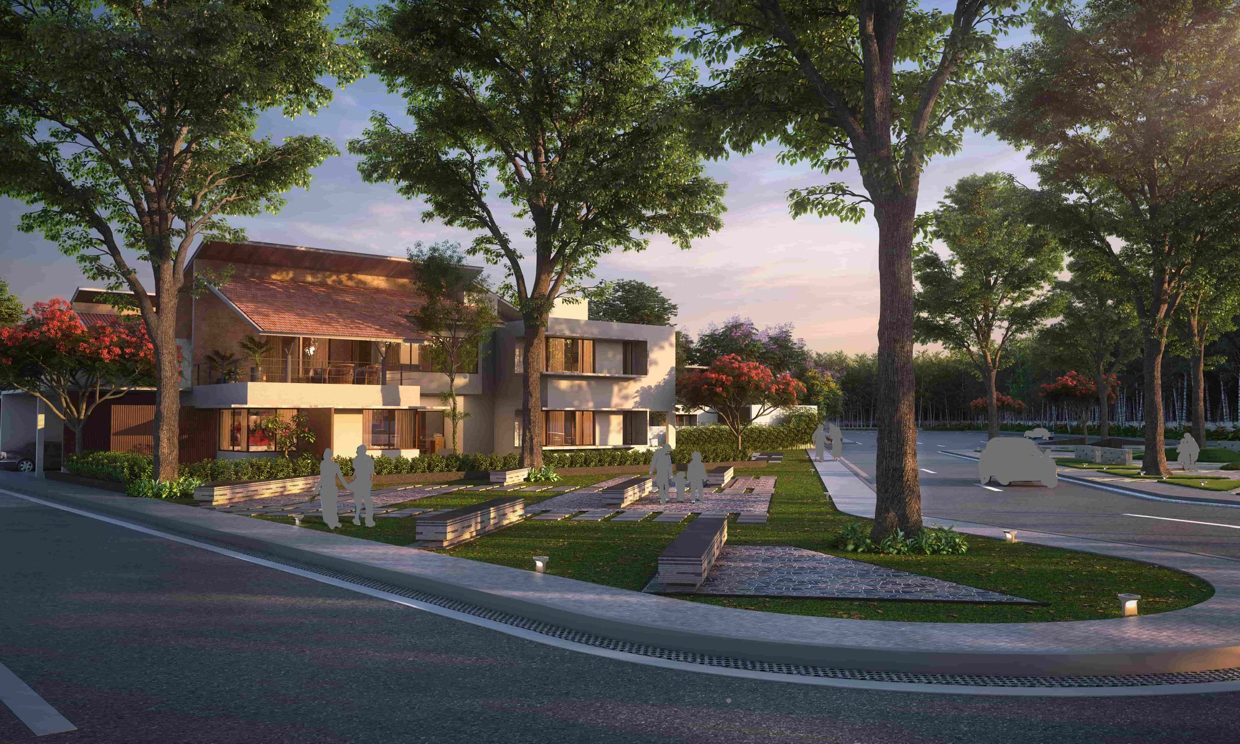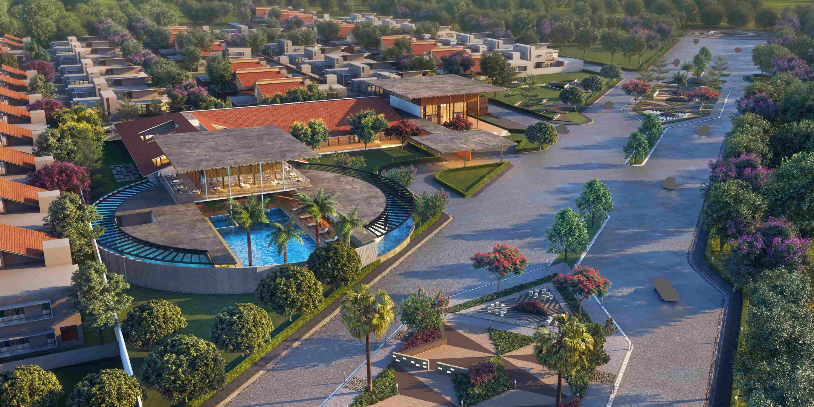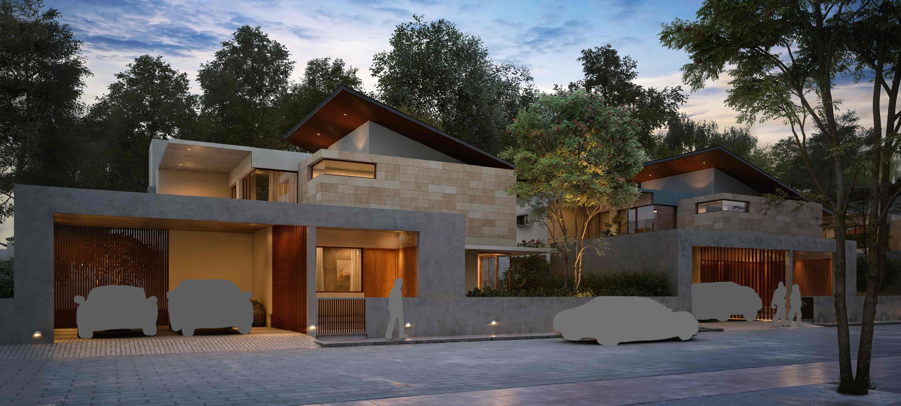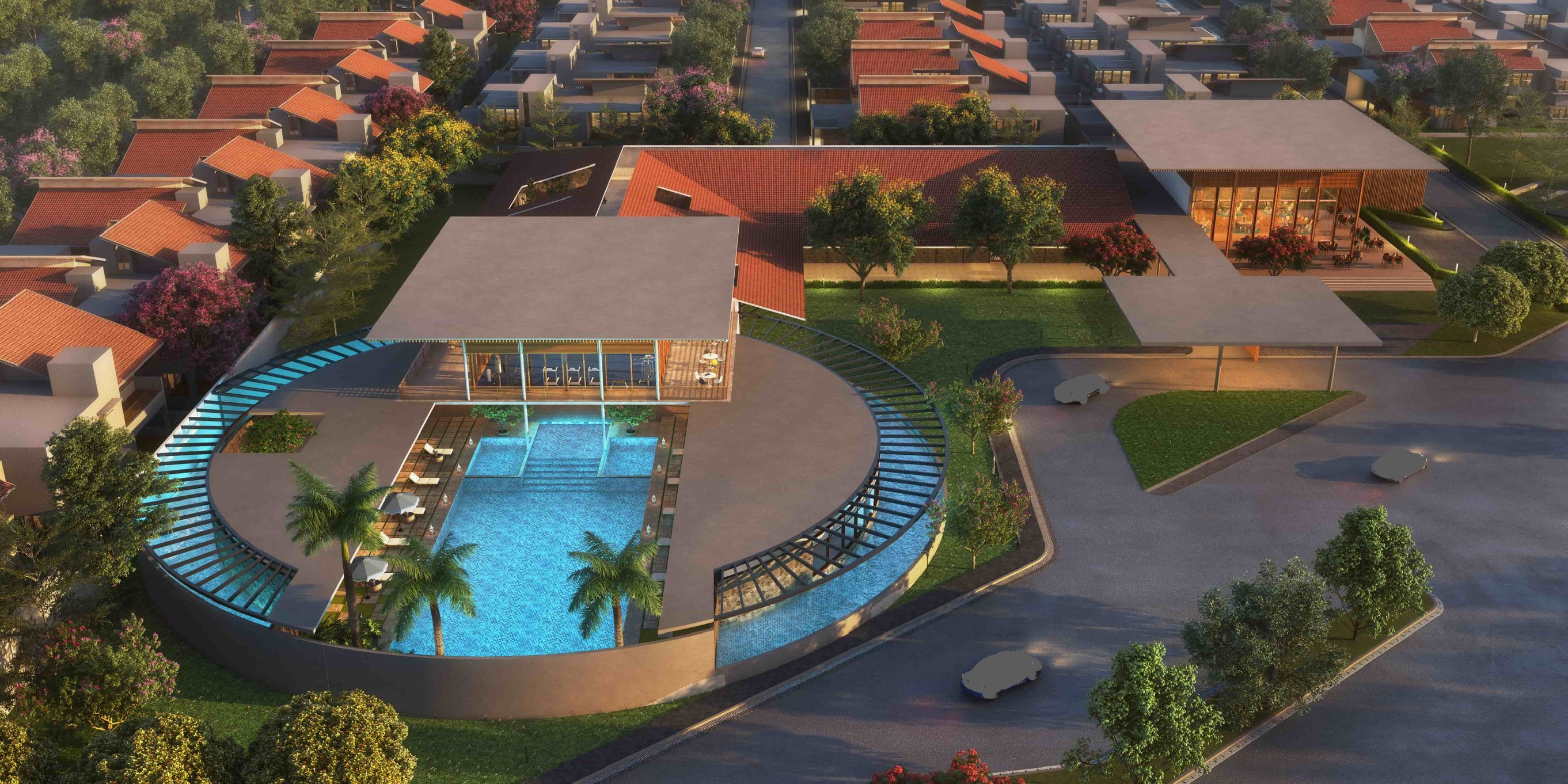There are a total of 4 types of villas, in 2 plot sizes of 55’x90’ and 70’x100’. Each villa has a distinctive architectural form and by placing different clusters on opposite sides of the road, we overcame any sense of monotony. The 40,000 square foot Clubhouse is interspersed with natural water bodies and courtyards and has amenities such as a restaurant, spa, pool, gym, squash and badminton courts, library, banquets and a children’s play area.