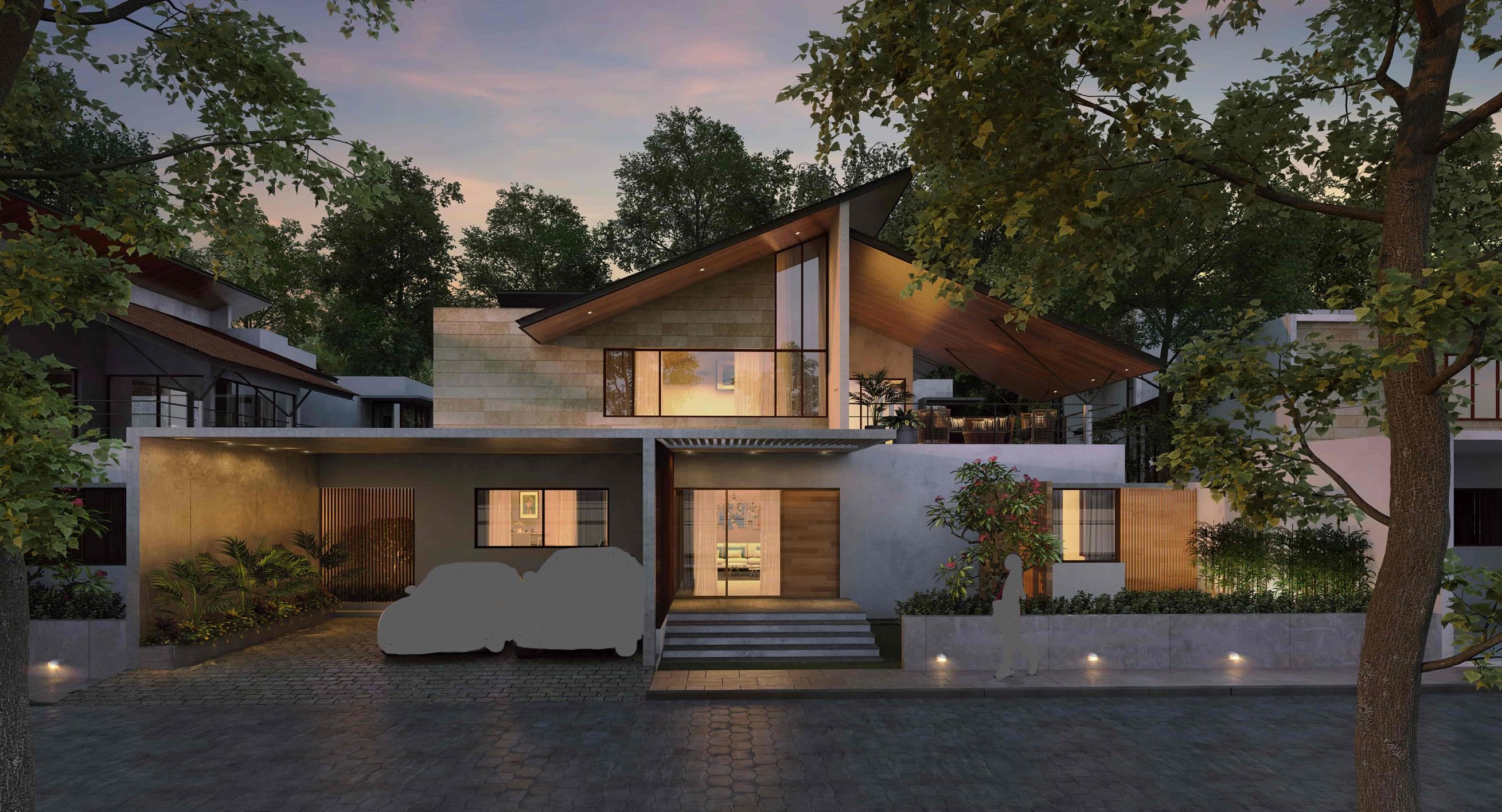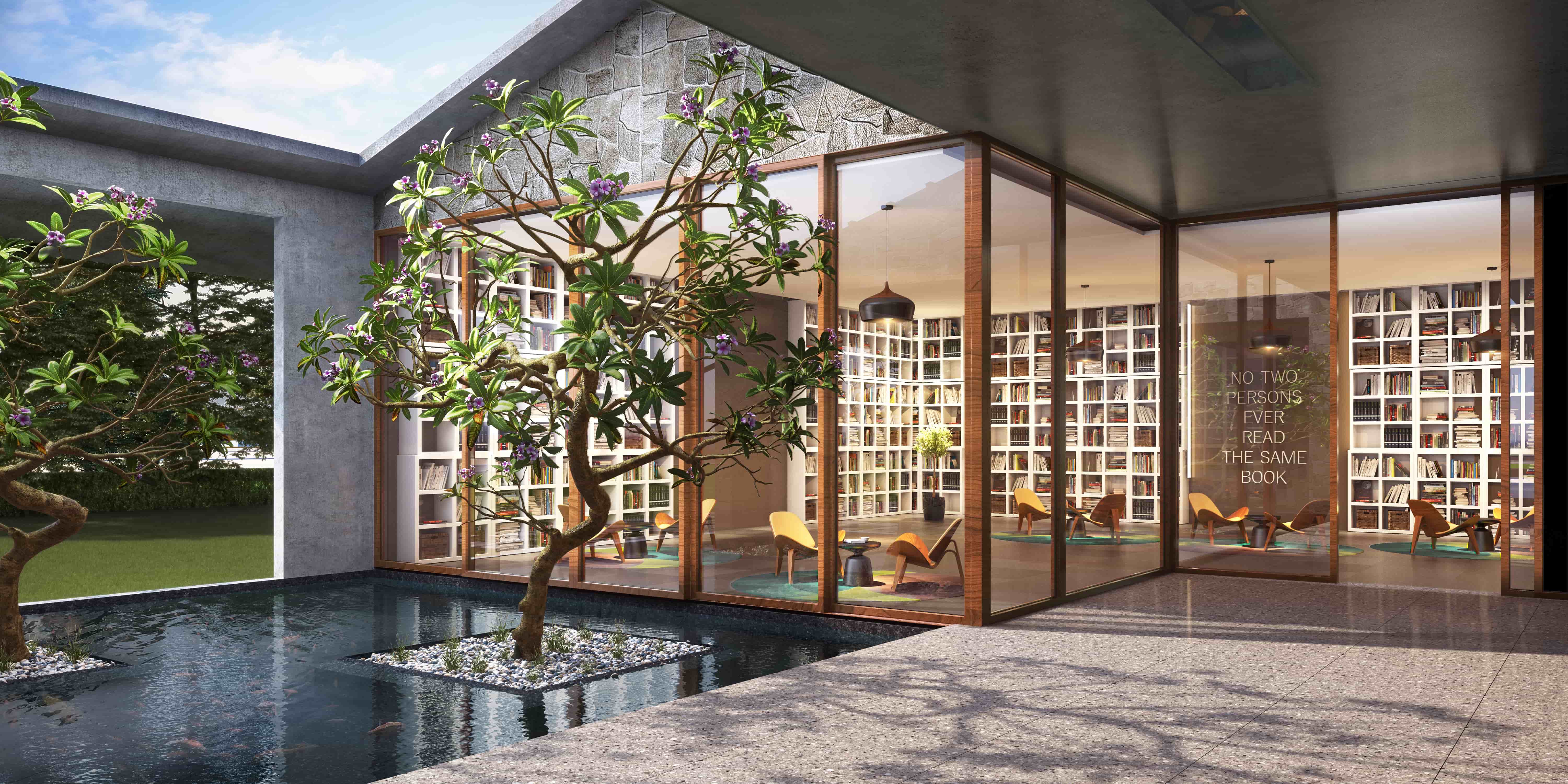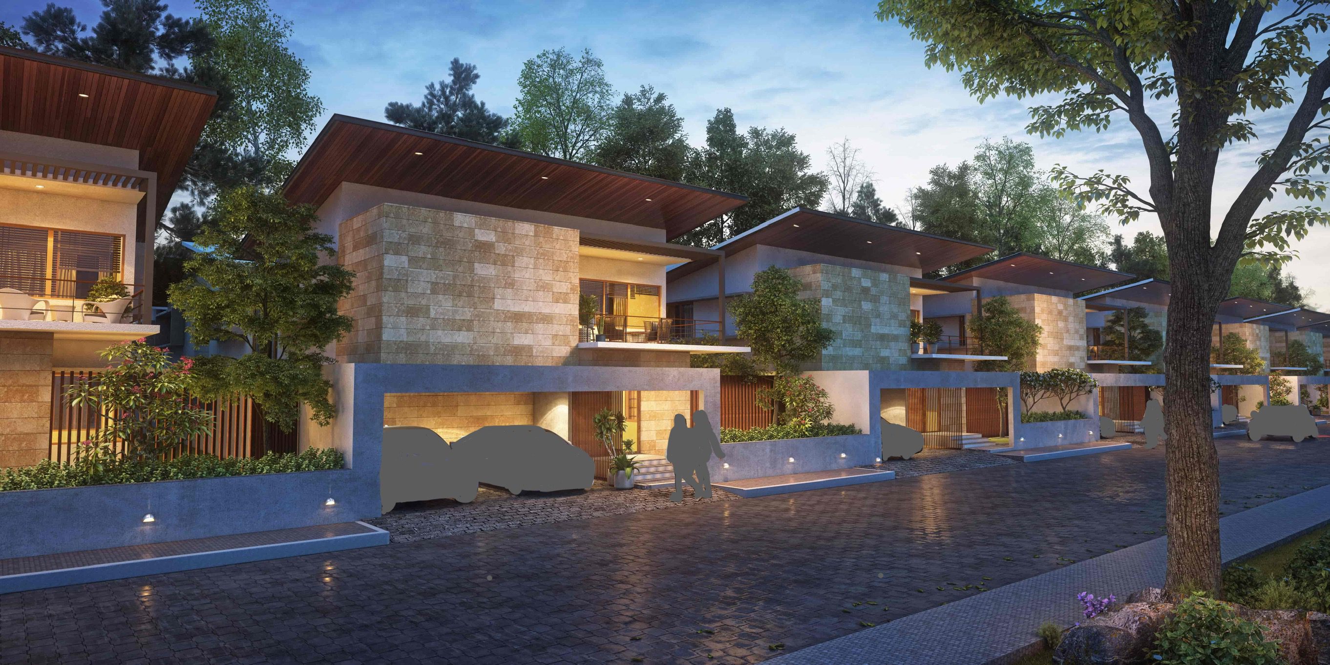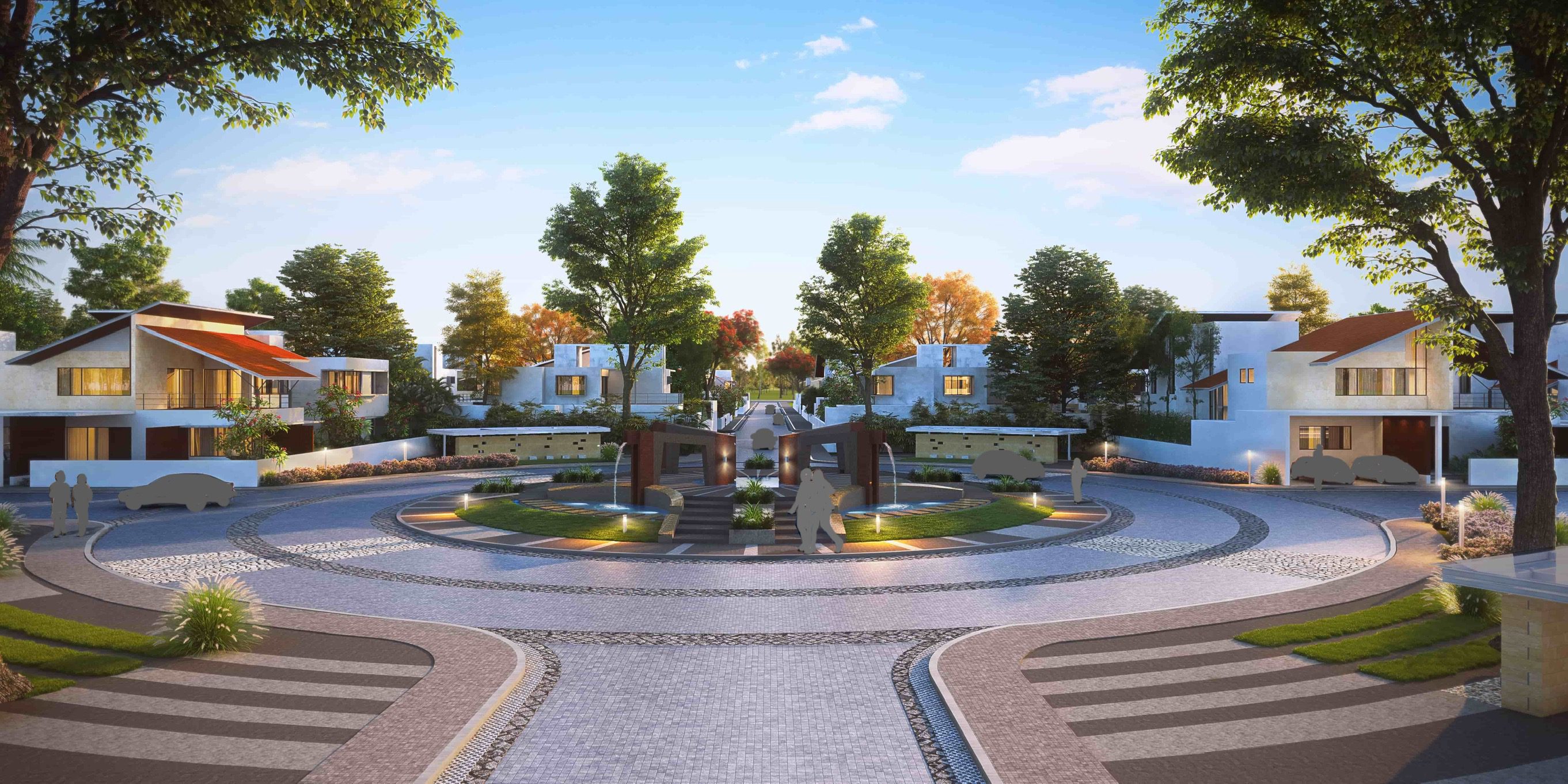 There are a total of 4 types of villas, in 2 plot sizes of 55’x90’ and 70’x100’. Each villa has a distinctive architectural form and by placing different clusters on opposite sides of the road, we overcame any sense of monotony. The 40,000 square foot Clubhouse is interspersed with natural water bodies and courtyards and has amenities such as a restaurant, spa, pool, gym, squash and badminton courts, library, banquets and a children’s play area.