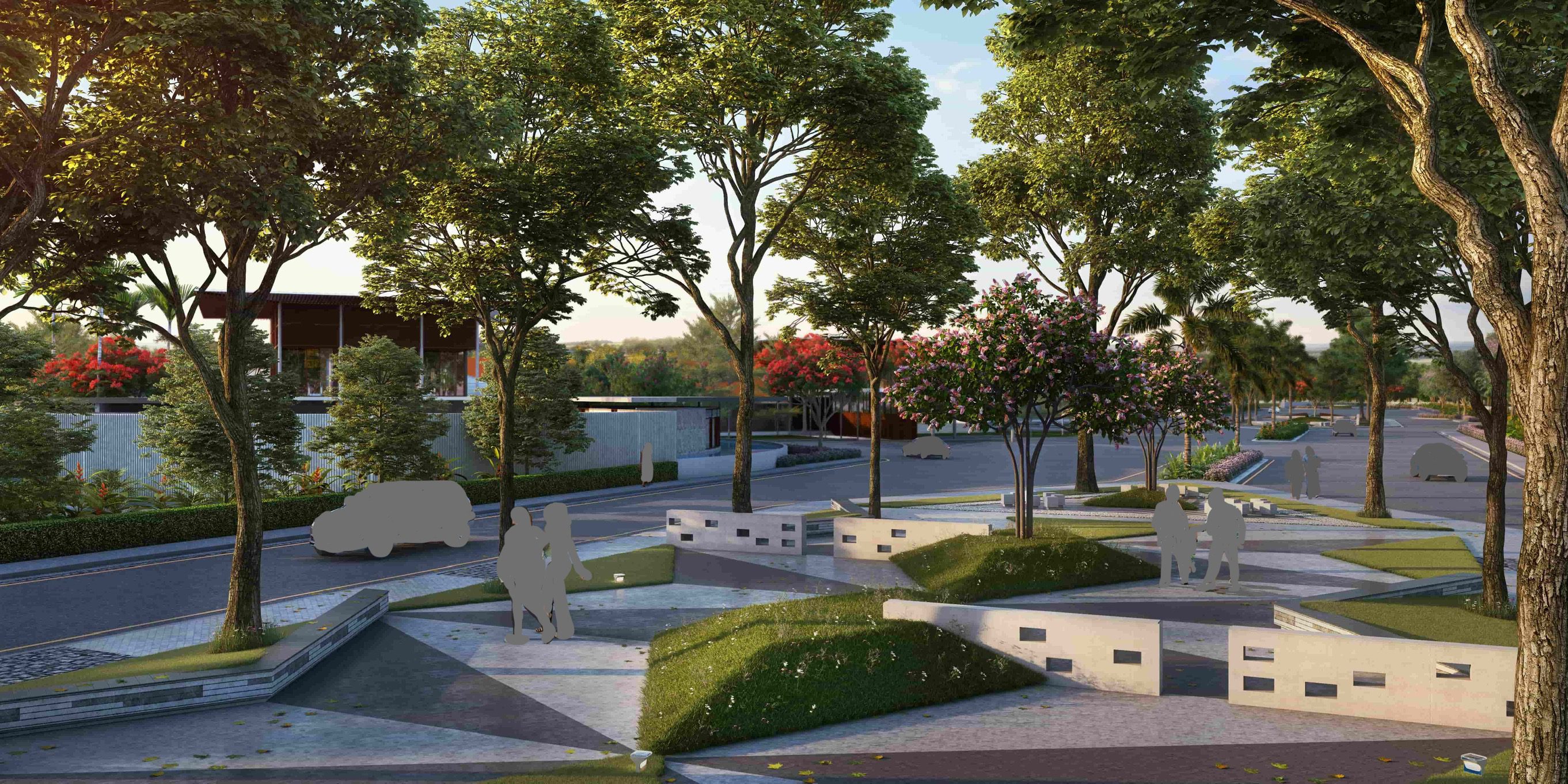 The two main axes of the development have three circular landscaped nodes that facilitate navigation as well as act like public plazas to sit around. Two additional landscaped parks with trees and stone benches facilitate community interaction.