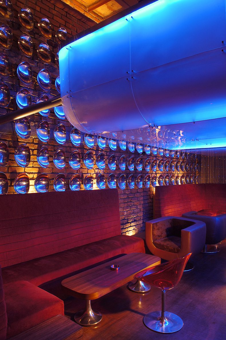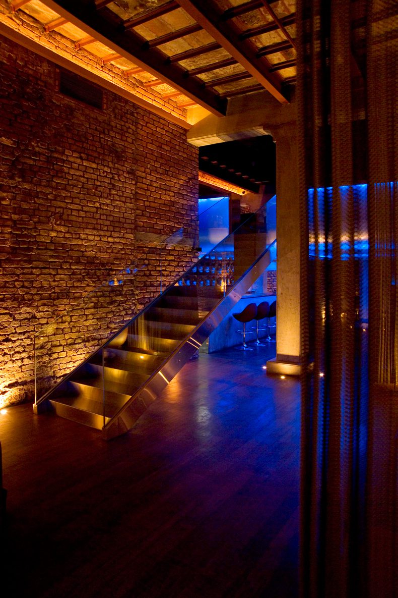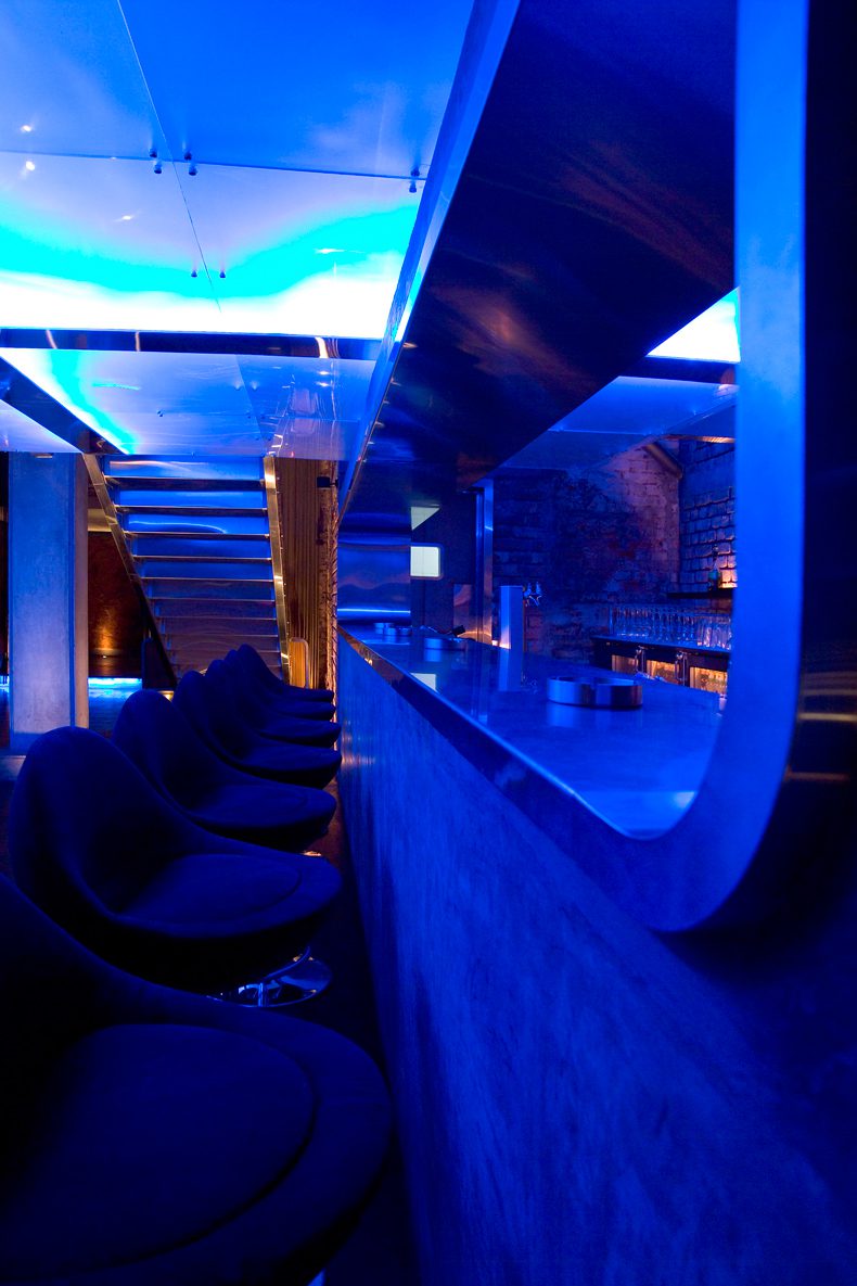 A floating mezzanine was created, that would distinguish itself from the surrounding shell in terms of form, texture, and luminescence. This innovative form was made out of a tubular steel construction and sheathed in a translucent resin material with LED lighting hidden intelligently within its walls. Bathed in a cold aqua hue, this futuristic form hovers ethereally within the warmth of the old shell, barely touched by the four mechanical arms cradling it.
