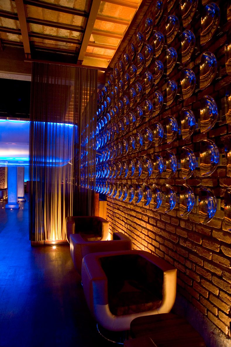 A fairly vast palette of materials – brushed brass, zebrano veneer, polished aluminum, sandblasted resin, rust chenille, metallic leathers and faux furs all coexist within a shell of steel, brick, sandstone, concrete and wood.