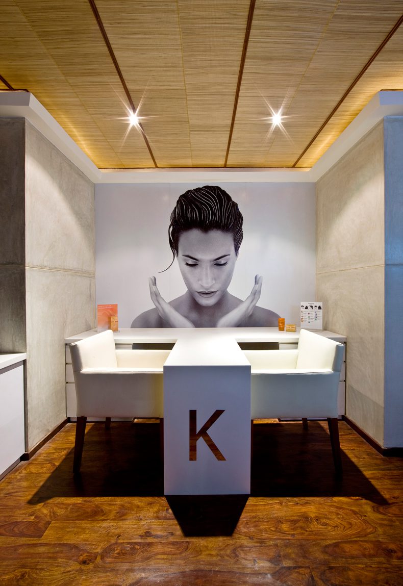 The spatial planning is linear. On the left of the reception is an excusive Kerastase Hair Salon, on the right, separated by a skin wall are 6 private therapy and treatment rooms each looking via large glass expanses into a private pockets of green planting. To the south of the reception is a free standing partition that divides the reception from a pedicure and Nail bar and further to the rear of the property are 2 open pavilions for foot reflexology looking inward into a soothing Balinese water feature.